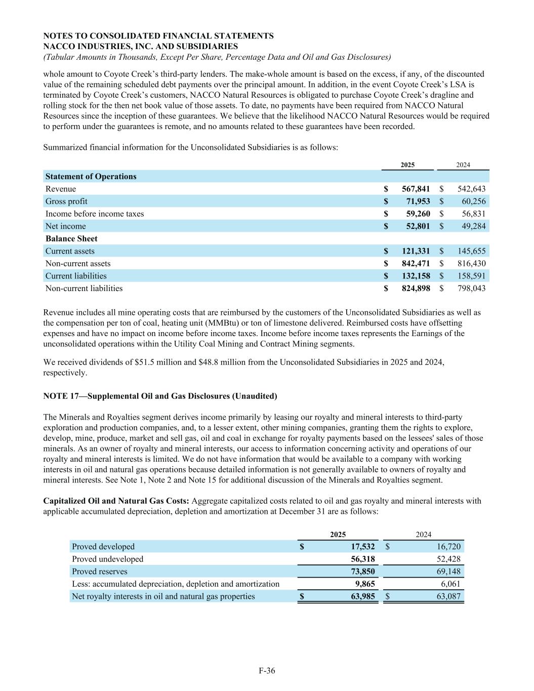 whole amount to Coyote Creek’s third-party lenders. The make-whole amount is based on the excess, if any, of the discounted value of the remaining scheduled debt payments over the principal amount. In addition, in the event Coyote Creek’s LSA is terminated by Coyote Creek’s customers, NACCO Natural Resources is obligated to purchase Coyote Creek’s dragline and rolling stock for the then net book value of those assets. To date, no payments have been required from NACCO Natural Resources since the inception of these guarantees. We believe that the likelihood NACCO Natural Resources would be required to perform under the guarantees is remote, and no amounts related to these guarantees have been recorded. Summarized financial information for the Unconsolidated Subsidiaries is as follows: 2025 2024 Statement of Operations Revenue $ 567,841 $ 542,643 Gross profit $ 71,953 $ 60,256 Income before income taxes $ 59,260 $ 56,831 Net income $ 52,801 $ 49,284 Balance Sheet Current assets $ 121,331 $ 145,655 Non-current assets $ 842,471 $ 816,430 Current liabilities $ 132,158 $ 158,591 Non-current liabilities $ 824,898 $ 798,043 Revenue includes all mine operating costs that are reimbursed by the customers of the Unconsolidated Subsidiaries as well as the compensation per ton of coal, heating unit (MMBtu) or ton of limestone delivered. Reimbursed costs have offsetting expenses and have no impact on income before income taxes. Income before income taxes represents the Earnings of the unconsolidated operations within the Utility Coal Mining and Contract Mining segments. We received dividends of $51.5 million and $48.8 million from the Unconsolidated Subsidiaries in 2025 and 2024, respectively. NOTE 17—Supplemental Oil and Gas Disclosures (Unaudited) The Minerals and Royalties segment derives income primarily by leasing our royalty and mineral interests to third-party exploration and production companies, and, to a lesser extent, other mining companies, granting them the rights to explore, develop, mine, produce, market and sell gas, oil and coal in exchange for royalty payments based on the lessees' sales of those minerals. As an owner of royalty and mineral interests, our access to information concerning activity and operations of our royalty and mineral interests is limited. We do not have information that would be available to a company with working interests in oil and natural gas operations because detailed information is not generally available to owners of royalty and mineral interests. See Note 1, Note 2 and Note 15 for additional discussion of the Minerals and Royalties segment. Capitalized Oil and Natural Gas Costs: Aggregate capitalized costs related to oil and gas royalty and mineral interests with applicable accumulated depreciation, depletion and amortization at December 31 are as follows: 2025 2024 Proved developed $ 17,532 $ 16,720 Proved undeveloped 56,318 52,428 Proved reserves 73,850 69,148 Less: accumulated depreciation, depletion and amortization 9,865 6,061 Net royalty interests in oil and natural gas properties $ 63,985 $ 63,087 NOTES TO CONSOLIDATED FINANCIAL STATEMENTS NACCO INDUSTRIES, INC. AND SUBSIDIARIES (Tabular Amounts in Thousands, Except Per Share, Percentage Data and Oil and Gas Disclosures) F-36