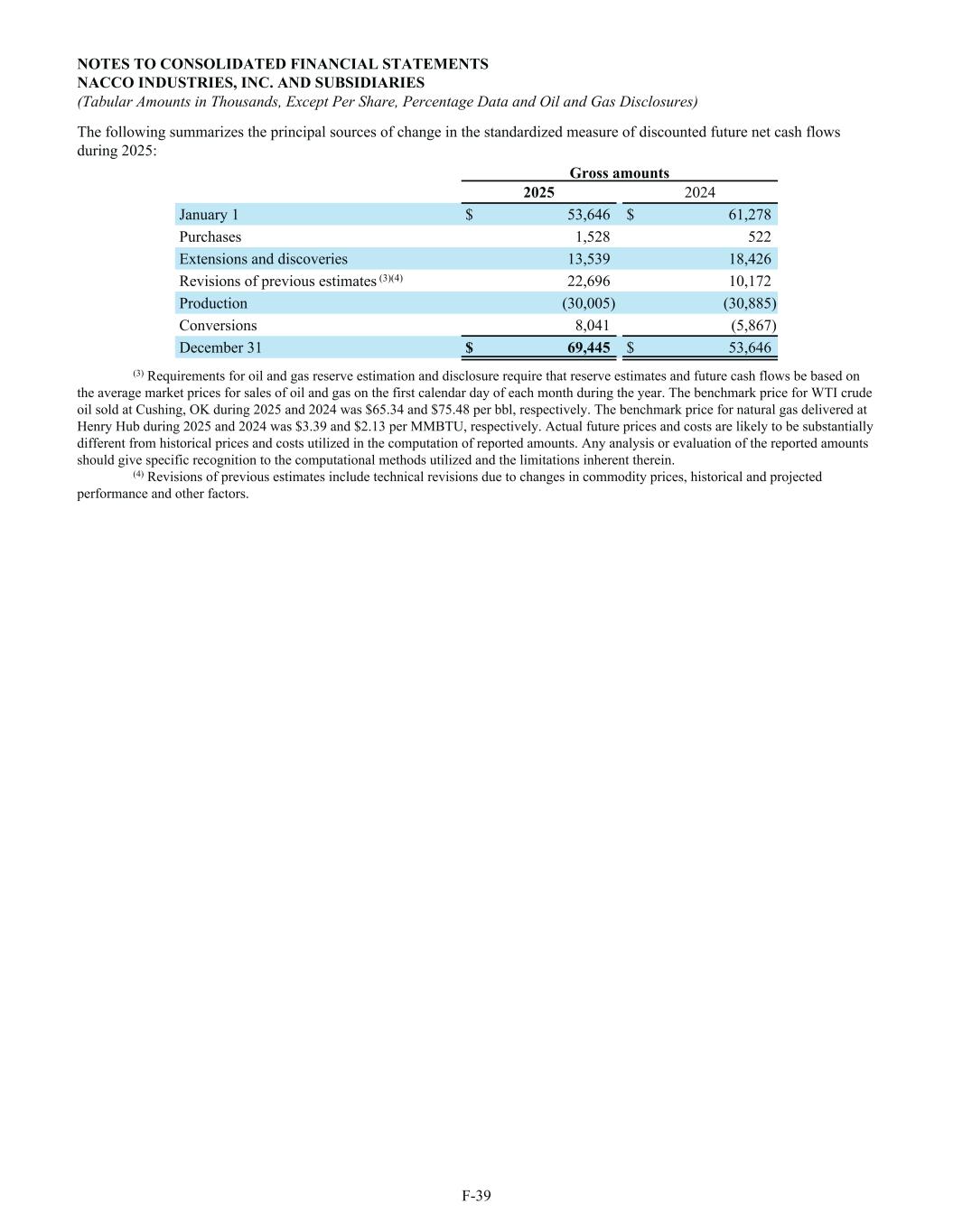 The following summarizes the principal sources of change in the standardized measure of discounted future net cash flows during 2025: Gross amounts 2025 2024 January 1 $ 53,646 $ 61,278 Purchases 1,528 522 Extensions and discoveries 13,539 18,426 Revisions of previous estimates (3)(4) 22,696 10,172 Production (30,005) (30,885) Conversions 8,041 (5,867) December 31 $ 69,445 $ 53,646 (3) Requirements for oil and gas reserve estimation and disclosure require that reserve estimates and future cash flows be based on the average market prices for sales of oil and gas on the first calendar day of each month during the year. The benchmark price for WTI crude oil sold at Cushing, OK during 2025 and 2024 was $65.34 and $75.48 per bbl, respectively. The benchmark price for natural gas delivered at Henry Hub during 2025 and 2024 was $3.39 and $2.13 per MMBTU, respectively. Actual future prices and costs are likely to be substantially different from historical prices and costs utilized in the computation of reported amounts. Any analysis or evaluation of the reported amounts should give specific recognition to the computational methods utilized and the limitations inherent therein. (4) Revisions of previous estimates include technical revisions due to changes in commodity prices, historical and projected performance and other factors. NOTES TO CONSOLIDATED FINANCIAL STATEMENTS NACCO INDUSTRIES, INC. AND SUBSIDIARIES (Tabular Amounts in Thousands, Except Per Share, Percentage Data and Oil and Gas Disclosures) F-39