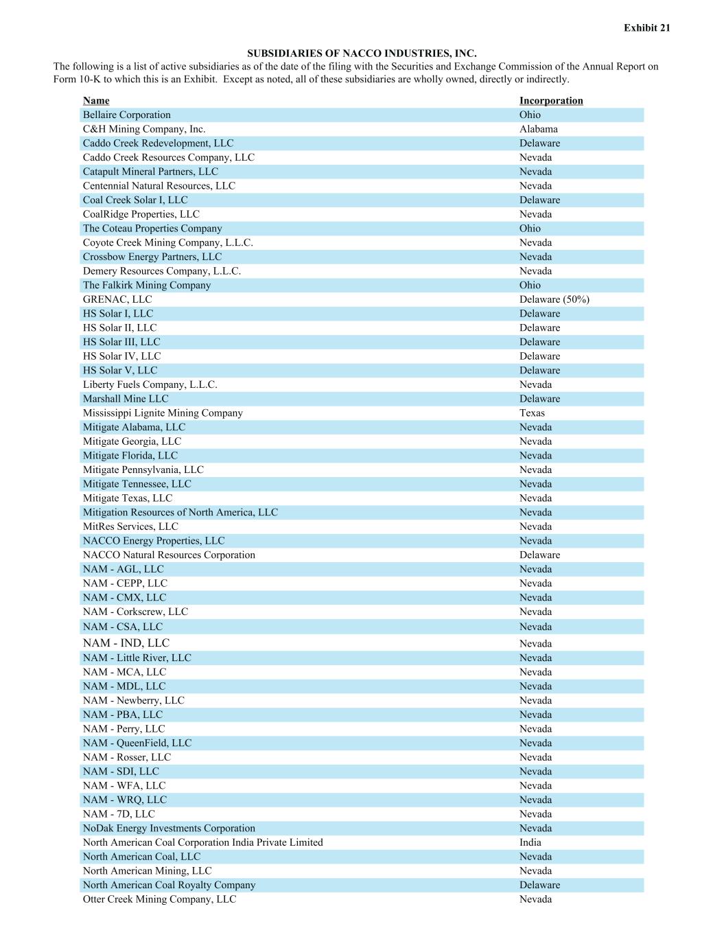 Exhibit 21 SUBSIDIARIES OF NACCO INDUSTRIES, INC. The following is a list of active subsidiaries as of the date of the filing with the Securities and Exchange Commission of the Annual Report on Form 10-K to which this is an Exhibit. Except as noted, all of these subsidiaries are wholly owned, directly or indirectly. Name Incorporation Bellaire Corporation Ohio C&H Mining Company, Inc. Alabama Caddo Creek Redevelopment, LLC Delaware Caddo Creek Resources Company, LLC Nevada Catapult Mineral Partners, LLC Nevada Centennial Natural Resources, LLC Nevada Coal Creek Solar I, LLC Delaware CoalRidge Properties, LLC Nevada The Coteau Properties Company Ohio Coyote Creek Mining Company, L.L.C. Nevada Crossbow Energy Partners, LLC Nevada Demery Resources Company, L.L.C. Nevada The Falkirk Mining Company Ohio GRENAC, LLC Delaware (50%) HS Solar I, LLC Delaware HS Solar II, LLC Delaware HS Solar III, LLC Delaware HS Solar IV, LLC Delaware HS Solar V, LLC Delaware Liberty Fuels Company, L.L.C. Nevada Marshall Mine LLC Delaware Mississippi Lignite Mining Company Texas Mitigate Alabama, LLC Nevada Mitigate Georgia, LLC Nevada Mitigate Florida, LLC Nevada Mitigate Pennsylvania, LLC Nevada Mitigate Tennessee, LLC Nevada Mitigate Texas, LLC Nevada Mitigation Resources of North America, LLC Nevada MitRes Services, LLC Nevada NACCO Energy Properties, LLC Nevada NACCO Natural Resources Corporation Delaware NAM - AGL, LLC Nevada NAM - CEPP, LLC Nevada NAM - CMX, LLC Nevada NAM - Corkscrew, LLC Nevada NAM - CSA, LLC Nevada NAM - IND, LLC Nevada NAM - Little River, LLC Nevada NAM - MCA, LLC Nevada NAM - MDL, LLC Nevada NAM - Newberry, LLC Nevada NAM - PBA, LLC Nevada NAM - Perry, LLC Nevada NAM - QueenField, LLC Nevada NAM - Rosser, LLC Nevada NAM - SDI, LLC Nevada NAM - WFA, LLC Nevada NAM - WRQ, LLC Nevada NAM - 7D, LLC Nevada NoDak Energy Investments Corporation Nevada North American Coal Corporation India Private Limited India North American Coal, LLC Nevada North American Mining, LLC Nevada North American Coal Royalty Company Delaware Otter Creek Mining Company, LLC Nevada