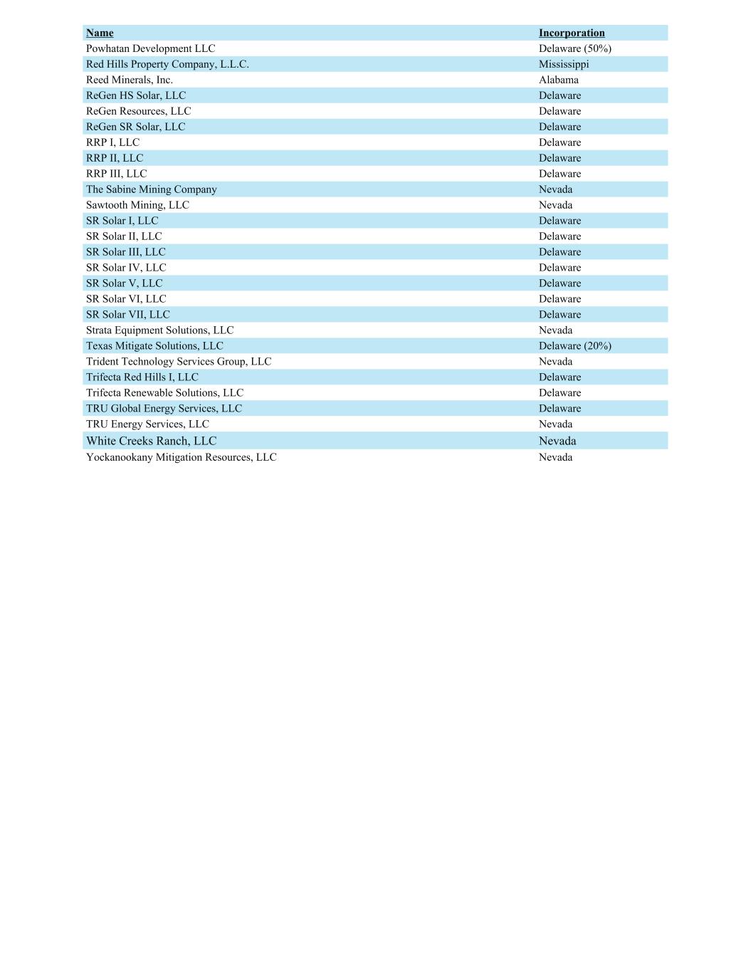 Name Incorporation Powhatan Development LLC Delaware (50%) Red Hills Property Company, L.L.C. Mississippi Reed Minerals, Inc. Alabama ReGen HS Solar, LLC Delaware ReGen Resources, LLC Delaware ReGen SR Solar, LLC Delaware RRP I, LLC Delaware RRP II, LLC Delaware RRP III, LLC Delaware The Sabine Mining Company Nevada Sawtooth Mining, LLC Nevada SR Solar I, LLC Delaware SR Solar II, LLC Delaware SR Solar III, LLC Delaware SR Solar IV, LLC Delaware SR Solar V, LLC Delaware SR Solar VI, LLC Delaware SR Solar VII, LLC Delaware Strata Equipment Solutions, LLC Nevada Texas Mitigate Solutions, LLC Delaware (20%) Trident Technology Services Group, LLC Nevada Trifecta Red Hills I, LLC Delaware Trifecta Renewable Solutions, LLC Delaware TRU Global Energy Services, LLC Delaware TRU Energy Services, LLC Nevada White Creeks Ranch, LLC Nevada Yockanookany Mitigation Resources, LLC Nevada