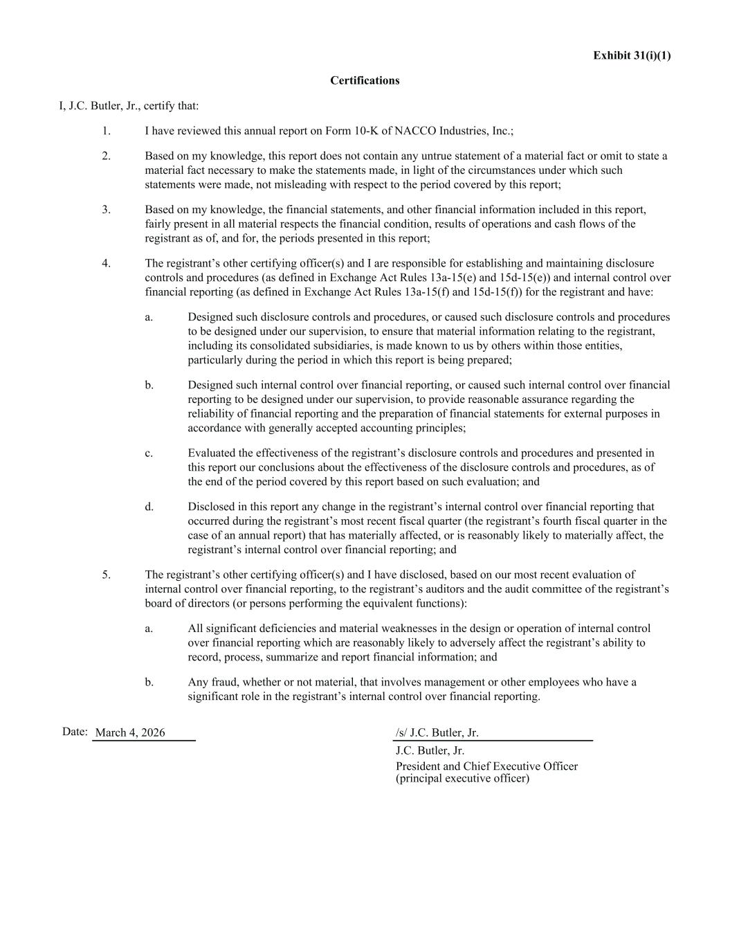 Exhibit 31(i)(1) Certifications I, J.C. Butler, Jr., certify that: 1. I have reviewed this annual report on Form 10-K of NACCO Industries, Inc.; 2. Based on my knowledge, this report does not contain any untrue statement of a material fact or omit to state a material fact necessary to make the statements made, in light of the circumstances under which such statements were made, not misleading with respect to the period covered by this report; 3. Based on my knowledge, the financial statements, and other financial information included in this report, fairly present in all material respects the financial condition, results of operations and cash flows of the registrant as of, and for, the periods presented in this report; 4. The registrant’s other certifying officer(s) and I are responsible for establishing and maintaining disclosure controls and procedures (as defined in Exchange Act Rules 13a-15(e) and 15d-15(e)) and internal control over financial reporting (as defined in Exchange Act Rules 13a-15(f) and 15d-15(f)) for the registrant and have: a. Designed such disclosure controls and procedures, or caused such disclosure controls and procedures to be designed under our supervision, to ensure that material information relating to the registrant, including its consolidated subsidiaries, is made known to us by others within those entities, particularly during the period in which this report is being prepared; b. Designed such internal control over financial reporting, or caused such internal control over financial reporting to be designed under our supervision, to provide reasonable assurance regarding the reliability of financial reporting and the preparation of financial statements for external purposes in accordance with generally accepted accounting principles; c. Evaluated the effectiveness of the registrant’s disclosure controls and procedures and presented in this report our conclusions about the effectiveness of the disclosure controls and procedures, as of the end of the period covered by this report based on such evaluation; and d. Disclosed in this report any change in the registrant’s internal control over financial reporting that occurred during the registrant’s most recent fiscal quarter (the registrant’s fourth fiscal quarter in the case of an annual report) that has materially affected, or is reasonably likely to materially affect, the registrant’s internal control over financial reporting; and 5. The registrant’s other certifying officer(s) and I have disclosed, based on our most recent evaluation of internal control over financial reporting, to the registrant’s auditors and the audit committee of the registrant’s board of directors (or persons performing the equivalent functions): a. All significant deficiencies and material weaknesses in the design or operation of internal control over financial reporting which are reasonably likely to adversely affect the registrant’s ability to record, process, summarize and report financial information; and b. Any fraud, whether or not material, that involves management or other employees who have a significant role in the registrant’s internal control over financial reporting. Date: March 4, 2026 /s/ J.C. Butler, Jr. J.C. Butler, Jr. President and Chief Executive Officer (principal executive officer)