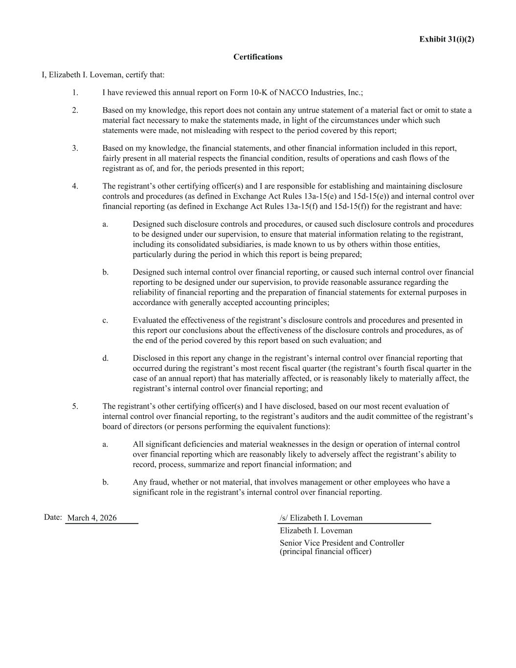 Exhibit 31(i)(2) Certifications I, Elizabeth I. Loveman, certify that: 1. I have reviewed this annual report on Form 10-K of NACCO Industries, Inc.; 2. Based on my knowledge, this report does not contain any untrue statement of a material fact or omit to state a material fact necessary to make the statements made, in light of the circumstances under which such statements were made, not misleading with respect to the period covered by this report; 3. Based on my knowledge, the financial statements, and other financial information included in this report, fairly present in all material respects the financial condition, results of operations and cash flows of the registrant as of, and for, the periods presented in this report; 4. The registrant’s other certifying officer(s) and I are responsible for establishing and maintaining disclosure controls and procedures (as defined in Exchange Act Rules 13a-15(e) and 15d-15(e)) and internal control over financial reporting (as defined in Exchange Act Rules 13a-15(f) and 15d-15(f)) for the registrant and have: a. Designed such disclosure controls and procedures, or caused such disclosure controls and procedures to be designed under our supervision, to ensure that material information relating to the registrant, including its consolidated subsidiaries, is made known to us by others within those entities, particularly during the period in which this report is being prepared; b. Designed such internal control over financial reporting, or caused such internal control over financial reporting to be designed under our supervision, to provide reasonable assurance regarding the reliability of financial reporting and the preparation of financial statements for external purposes in accordance with generally accepted accounting principles; c. Evaluated the effectiveness of the registrant’s disclosure controls and procedures and presented in this report our conclusions about the effectiveness of the disclosure controls and procedures, as of the end of the period covered by this report based on such evaluation; and d. Disclosed in this report any change in the registrant’s internal control over financial reporting that occurred during the registrant’s most recent fiscal quarter (the registrant’s fourth fiscal quarter in the case of an annual report) that has materially affected, or is reasonably likely to materially affect, the registrant’s internal control over financial reporting; and 5. The registrant’s other certifying officer(s) and I have disclosed, based on our most recent evaluation of internal control over financial reporting, to the registrant’s auditors and the audit committee of the registrant’s board of directors (or persons performing the equivalent functions): a. All significant deficiencies and material weaknesses in the design or operation of internal control over financial reporting which are reasonably likely to adversely affect the registrant’s ability to record, process, summarize and report financial information; and b. Any fraud, whether or not material, that involves management or other employees who have a significant role in the registrant’s internal control over financial reporting. Date: March 4, 2026 /s/ Elizabeth I. Loveman Elizabeth I. Loveman Senior Vice President and Controller (principal financial officer)