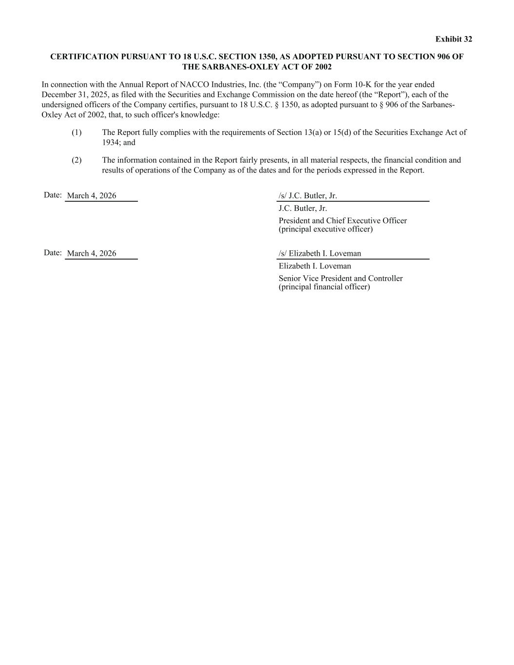 Exhibit 32 CERTIFICATION PURSUANT TO 18 U.S.C. SECTION 1350, AS ADOPTED PURSUANT TO SECTION 906 OF THE SARBANES-OXLEY ACT OF 2002 In connection with the Annual Report of NACCO Industries, Inc. (the “Company”) on Form 10-K for the year ended December 31, 2025, as filed with the Securities and Exchange Commission on the date hereof (the “Report”), each of the undersigned officers of the Company certifies, pursuant to 18 U.S.C. § 1350, as adopted pursuant to § 906 of the Sarbanes- Oxley Act of 2002, that, to such officer's knowledge: (1) The Report fully complies with the requirements of Section 13(a) or 15(d) of the Securities Exchange Act of 1934; and (2) The information contained in the Report fairly presents, in all material respects, the financial condition and results of operations of the Company as of the dates and for the periods expressed in the Report. Date: March 4, 2026 /s/ J.C. Butler, Jr. J.C. Butler, Jr. President and Chief Executive Officer (principal executive officer) Date: March 4, 2026 /s/ Elizabeth I. Loveman Elizabeth I. Loveman Senior Vice President and Controller (principal financial officer)