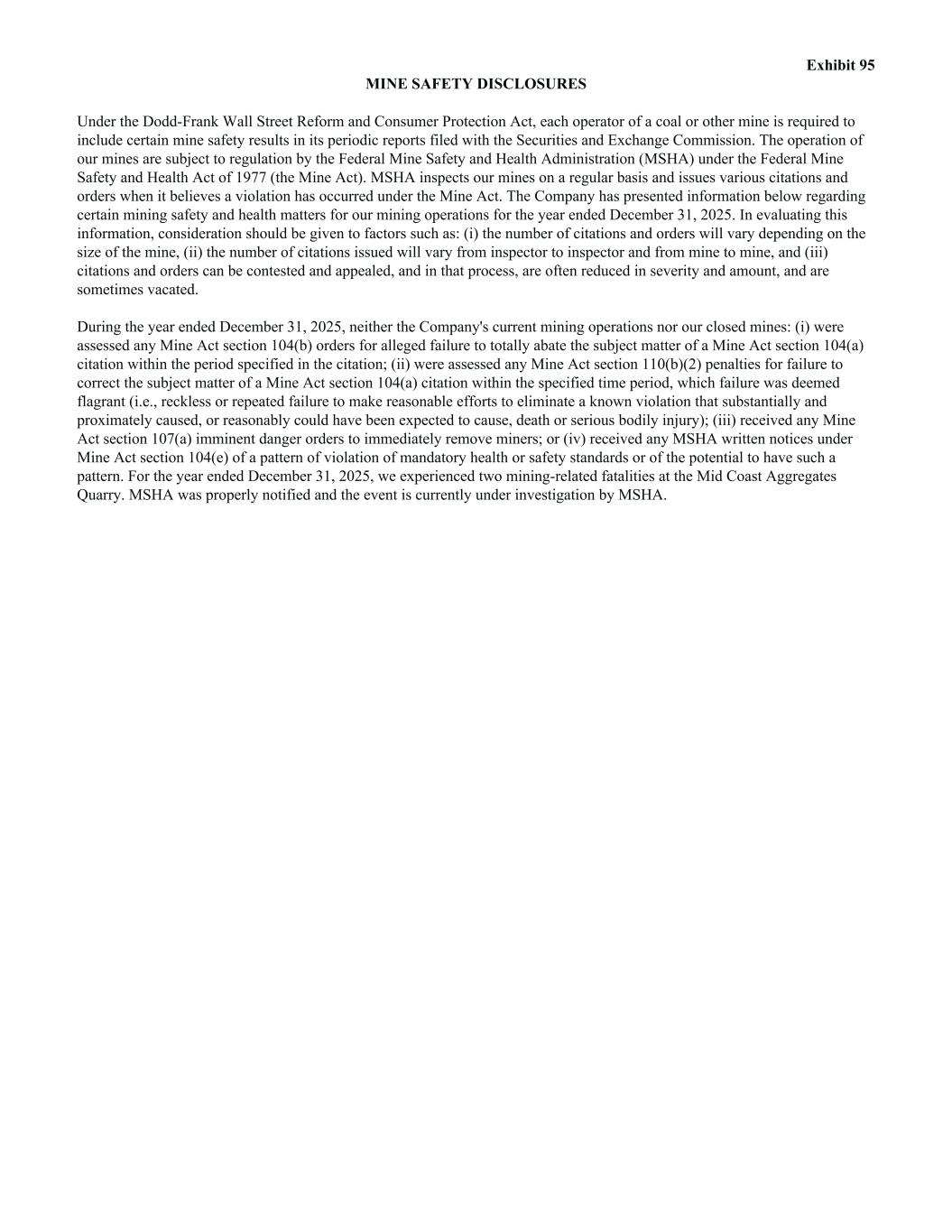Exhibit 95 MINE SAFETY DISCLOSURES Under the Dodd-Frank Wall Street Reform and Consumer Protection Act, each operator of a coal or other mine is required to include certain mine safety results in its periodic reports filed with the Securities and Exchange Commission. The operation of our mines are subject to regulation by the Federal Mine Safety and Health Administration (MSHA) under the Federal Mine Safety and Health Act of 1977 (the Mine Act). MSHA inspects our mines on a regular basis and issues various citations and orders when it believes a violation has occurred under the Mine Act. The Company has presented information below regarding certain mining safety and health matters for our mining operations for the year ended December 31, 2025. In evaluating this information, consideration should be given to factors such as: (i) the number of citations and orders will vary depending on the size of the mine, (ii) the number of citations issued will vary from inspector to inspector and from mine to mine, and (iii) citations and orders can be contested and appealed, and in that process, are often reduced in severity and amount, and are sometimes vacated. During the year ended December 31, 2025, neither the Company's current mining operations nor our closed mines: (i) were assessed any Mine Act section 104(b) orders for alleged failure to totally abate the subject matter of a Mine Act section 104(a) citation within the period specified in the citation; (ii) were assessed any Mine Act section 110(b)(2) penalties for failure to correct the subject matter of a Mine Act section 104(a) citation within the specified time period, which failure was deemed flagrant (i.e., reckless or repeated failure to make reasonable efforts to eliminate a known violation that substantially and proximately caused, or reasonably could have been expected to cause, death or serious bodily injury); (iii) received any Mine Act section 107(a) imminent danger orders to immediately remove miners; or (iv) received any MSHA written notices under Mine Act section 104(e) of a pattern of violation of mandatory health or safety standards or of the potential to have such a pattern. For the year ended December 31, 2025, we experienced two mining-related fatalities at the Mid Coast Aggregates Quarry. MSHA was properly notified and the event is currently under investigation by MSHA.