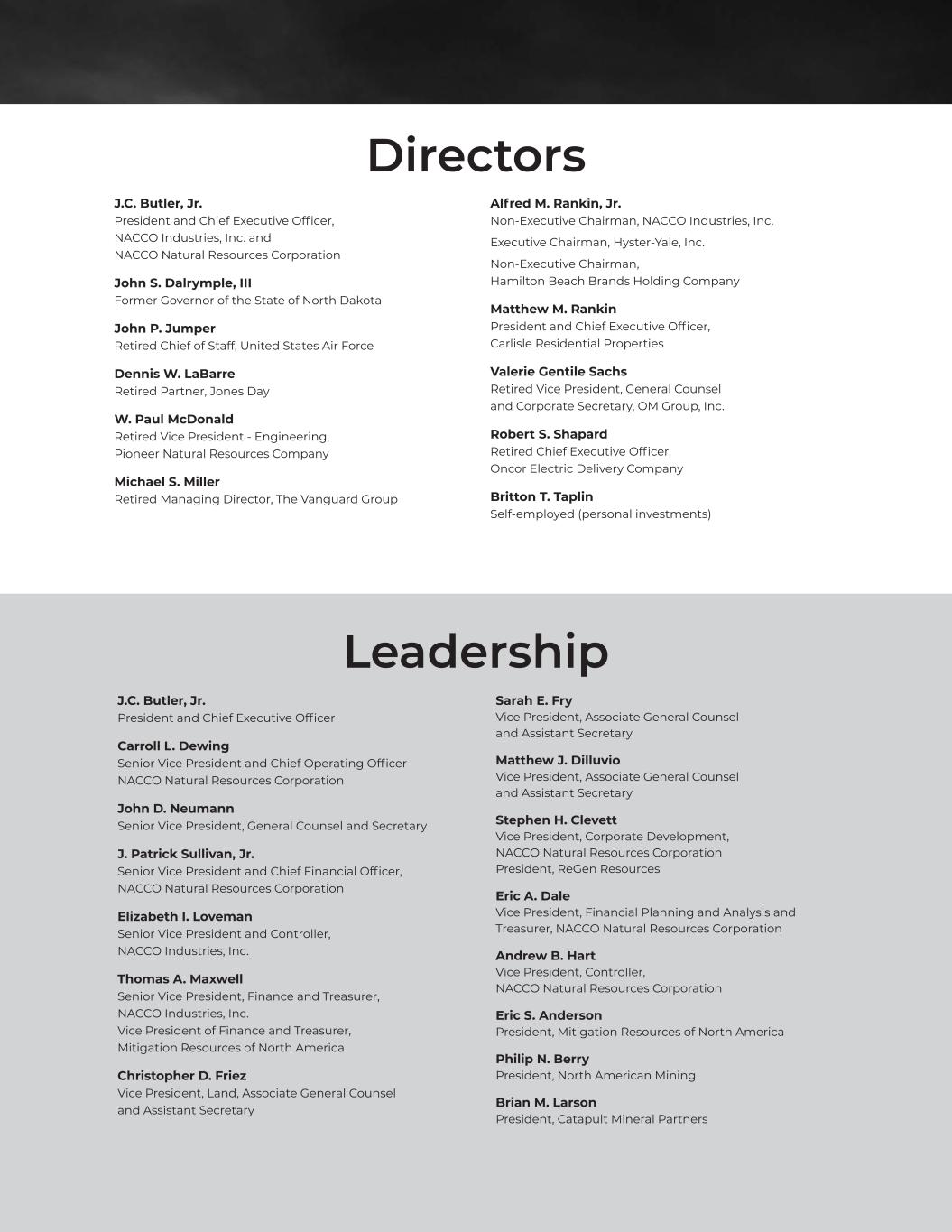 J.C. Butler, Jr. President and Chief Executive Officer, NACCO Industries, Inc. and NACCO Natural Resources Corporation John S. Dalrymple, III Former Governor of the State of North Dakota John P. Jumper Retired Chief of Staff, United States Air Force Dennis W. LaBarre Retired Partner, Jones Day W. Paul McDonald Retired Vice President - Engineering, Pioneer Natural Resources Company Michael S. Miller Retired Managing Director, The Vanguard Group Alfred M. Rankin, Jr. Non-Executive Chairman, NACCO Industries, Inc. Executive Chairman, Hyster-Yale, Inc. Non-Executive Chairman, Hamilton Beach Brands Holding Company Matthew M. Rankin President and Chief Executive Officer, Carlisle Residential Properties Valerie Gentile Sachs Retired Vice President, General Counsel and Corporate Secretary, OM Group, Inc. Robert S. Shapard Retired Chief Executive Officer, Oncor Electric Delivery Company Britton T. Taplin Self-employed (personal investments) Directors J.C. Butler, Jr. President and Chief Executive Officer Carroll L. Dewing Senior Vice President and Chief Operating Officer NACCO Natural Resources Corporation John D. Neumann Senior Vice President, General Counsel and Secretary J. Patrick Sullivan, Jr. Senior Vice President and Chief Financial Officer, NACCO Natural Resources Corporation Elizabeth I. Loveman Senior Vice President and Controller, NACCO Industries, Inc. Thomas A. Maxwell Senior Vice President, Finance and Treasurer, NACCO Industries, Inc. Vice President of Finance and Treasurer, Mitigation Resources of North America Christopher D. Friez Vice President, Land, Associate General Counsel and Assistant Secretary Sarah E. Fry Vice President, Associate General Counsel and Assistant Secretary Matthew J. Dilluvio Vice President, Associate General Counsel and Assistant Secretary Stephen H. Clevett Vice President, Corporate Development, NACCO Natural Resources Corporation President, ReGen Resources Eric A. Dale Vice President, Financial Planning and Analysis and Treasurer, NACCO Natural Resources Corporation Andrew B. Hart Vice President, Controller, NACCO Natural Resources Corporation Eric S. Anderson President, Mitigation Resources of North America Philip N. Berry President, North American Mining Brian M. Larson President, Catapult Mineral Partners Leadership