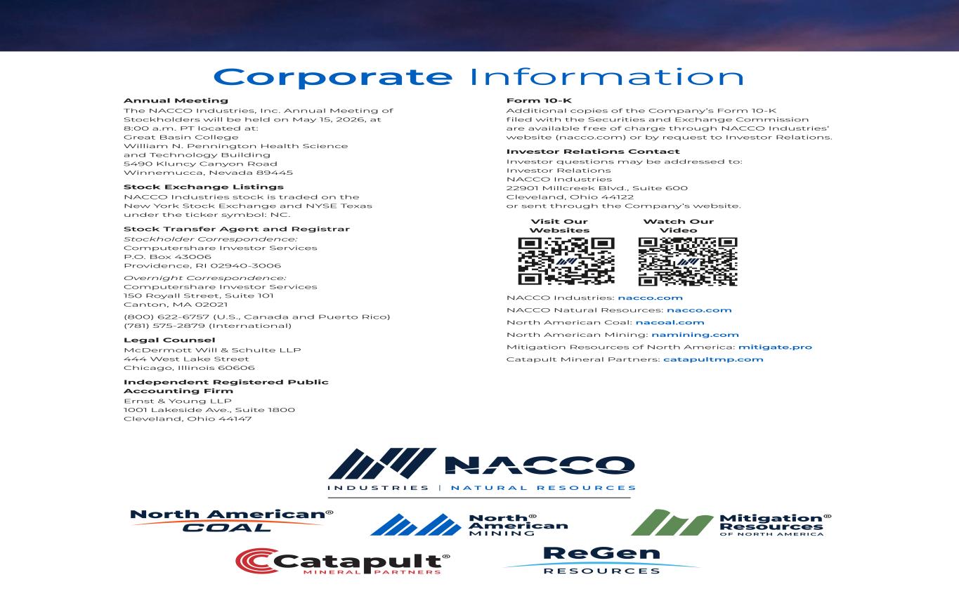 Bringing Natural Resources to Life 1 Our Companies 2 Selected Financial and Operating Data 4 Letter to Our Stockholders 8 Business Profiles 17 Form 10-K 134 Directors and Leadership 135 Corporate Information What’s Inside About the Cover The sun rises over Coteau Mining Company’s Freedom Mine in North Dakota. A new MTECK dragline, that North American Mining helped design, moves material at a customer’s quarry in Florida. Corporate Information Form 10-K Additional copies of the Company’s Form 10-K filed with the Securities and Exchange Commission are available free of charge through NACCO Industries’ website (nacco.com) or by request to Investor Relations. Investor Relations Contact Investor questions may be addressed to: Investor Relations NACCO Industries 22901 Millcreek Blvd., Suite 600 Cleveland, Ohio 44122 or sent through the Company’s website. Visit Our Watch Our Websites Video NACCO Industries: nacco.com NACCO Natural Resources: nacco.com North American Coal: nacoal.com North American Mining: namining.com Mitigation Resources of North America: mitigate.pro Catapult Mineral Partners: catapultmp.com Annual Meeting The NACCO Industries, Inc. Annual Meeting of Stockholders will be held on May 15, 2026, at 8:00 a.m. PT located at: Great Basin College William N. Pennington Health Science and Technology Building 5490 Kluncy Canyon Road Winnemucca, Nevada 89445 Stock Exchange Listings NACCO Industries stock is traded on the New York Stock Exchange and NYSE Texas under the ticker symbol: NC. Stock Transfer Agent and Registrar Stockholder Correspondence: Computershare Investor Services P.O. Box 43006 Providence, RI 02940-3006 Overnight Correspondence: Computershare Investor Services 150 Royall Street, Suite 101 Canton, MA 02021 (800) 622-6757 (U.S., Canada and Puerto Rico) (781) 575-2879 (International) Legal Counsel McDermott Will & Schulte LLP 444 West Lake Street Chicago, Illinois 60606 Independent Registered Public Accounting Firm Ernst & Young LLP 1001 Lakeside Ave., Suite 1800 Cleveland, Ohio 44147 35425_NACCO_Color_ACG.indd 4-6 2026/3/11 2:11 M