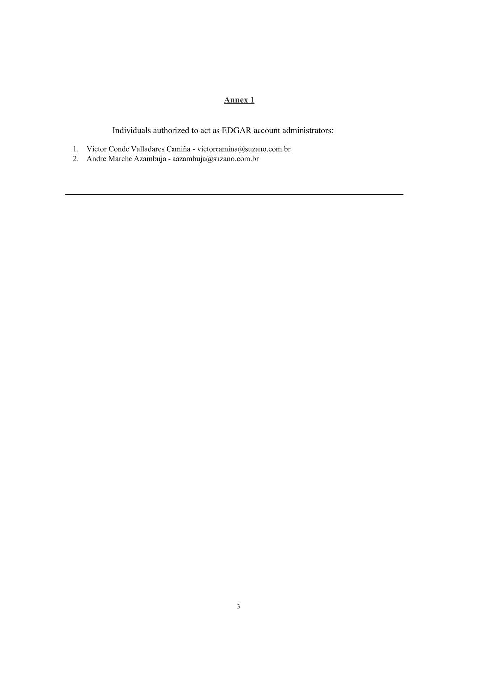 POWER OF ATTORNEY Know all by these presents, that the undersigned hereby constitutes and appoints each of Victor Conde Valladares Camiña and Andre Marche Azambuja of SUZANO S.A., a company duly organized and existing under the laws of the Federative Republic of Brazil, with its head office at Avenida Professor Magalhães Neto, 1.752 ,10th floor, Salvador/BA, Brazil acting singly, and with full power of substitution or revocation, the undersigned’s true and lawful attorney-in-fact (each of such persons and their substitutes being referred to herein as the “Attorney-in-Fact”), with full power to act for the undersigned and in the undersigned's name, place and stead, in any and all capacities, to: 1. prepare, execute and submit to the U.S. Securities and Exchange Commission (the “SEC”), and/or any national securities exchange on which SUZANO S.A. (the “Company”) securities are listed, any and all reports (including any amendments thereto) the undersigned is required to file with the SEC under Section 13 or Section 16 of the Exchange Act or any rule or regulation thereunder, [or under Rule 144 under the Securities Act of 1933 (“Rule 144”), with respect to the any security of the Company, including Forms 3, 4 and 5, Schedules 13D and 13G, and Forms 144; and 2. obtain, as the undersigned's representative and on the undersigned's behalf, information regarding transactions in the Company's equity securities from any third party, including the Company and any brokers, dealers, employee benefit plan administrators and trustees, and the undersigned hereby authorizes any such third party to release any such information to the Attorney-in-Fact. The undersigned acknowledges that: 1. This Power of Attorney authorizes, but does not require, the Attorney-in-Fact to act in his or her discretion on information provided to such Attorney-in-Fact without independent verification of such information; 2. Any documents prepared or executed by the Attorney-in-Fact on behalf of the undersigned pursuant to this Power of Attorney will be in such form and will contain such information as the Attorney-in-Fact, in his or her discretion, deems necessary or desirable; 3. Neither the Company nor the Attorney-in-Fact assumes any liability for the undersigned's responsibility to comply with the requirements of Section 13 or Section 16 of the Exchange Act or Rule 144, any liability of the undersigned for any failure to comply with such requirements, or any liability of the undersigned for disgorgement of profits under Section 16(b) of the Exchange Act; and 4. This Power of Attorney does not relieve the undersigned from responsibility for compliance with the undersigned's obligations under Section 13 or Section 16 of the Exchange Act, including, without limitation, the reporting requirements under Section 13 or Section 16 of the Exchange Act. The undersigned hereby grants to the Attorney-in-Fact full power and authority to do and perform any and every act whatsoever requisite, necessary, or proper to be done in the exercise of any of the rights and powers herein granted, as fully to all intents and purposes as the undersigned might or could do if personally present, with full power of substitution or revocation, hereby ratifying and confirming all that such Attorney-in- Fact, or such Attorney-in-Fact’s substitute or substitutes, shall lawfully do or cause to be done by virtue of this power of attorney and the rights and powers herein granted. This Power of Attorney shall remain in full force and effect until the undersigned is no longer required to file Forms 4 or 5 or Schedules 13D or 13G or Forms 144 with respect to the undersigned's holdings of and transactions in securities of the Company, unless earlier revoked by the undersigned in a signed writing delivered to the Attorney-in-Fact. This Power of Attorney revokes all previous powers of attorney with respect to the subject matter of this Power of Attorney.