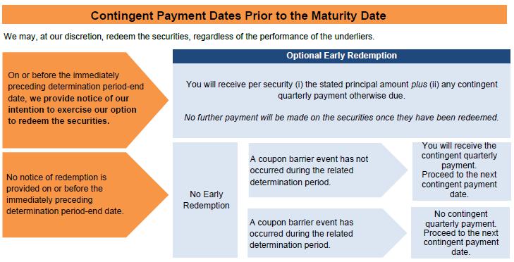 | Optional early redemption: | On any contingent payment date (other than the final contingent payment date), we will have the right to redeem the securities, in whole, but not in part, at our discretion, for the early redemption payment. If we elect to redeem the securities on any contingent payment date, we will give notice to the trustee on or before the immediately preceding determination period-end date. Any early redemption of the securities will be at our discretion and will not automatically occur based on the performance of the underliers. No further payments will be made on the securities after they have been redeemed. |