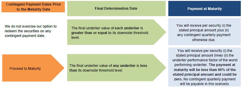 On any contingent payment date (other than the final contingent payment date), we will have the right to redeem the securities at our discretion for an early redemption payment equal to the stated principal amount plus any contingent quarterly payment otherwise due. If the securities are redeemed prior to maturity, investors will receive no further contingent quarterly payments. Any early redemption of the securities will be at our discretion and will not automatically occur based on the performance of the underliers. At maturity, if the securities have not previously been redeemed and the final underlier value of each underlier is greater than or equal to 60% of its initial underlier value, which we refer to as a downside threshold level, the payment at maturity will be equal to the stated principal amount plus any contingent quarterly payment otherwise due. However, if the securities have not previously been redeemed and the final underlier value of any underlier is less than its downside threshold level, investors will lose 1% of the stated principal amount for every 1% that the final underlier value of the worst performing underlier is less than its initial underlier value. Under these circumstances, the amount investors receive will be less than 60% of the stated principal amount and could be zero. Investors in the securities must be willing and able to accept the risk of losing their entire initial investment based on the performance of the worst performing underlier and also the risk of not receiving any contingent quarterly payment throughout the entire term of the securities. In addition, investors will not participate in any appreciation of any underlier.
