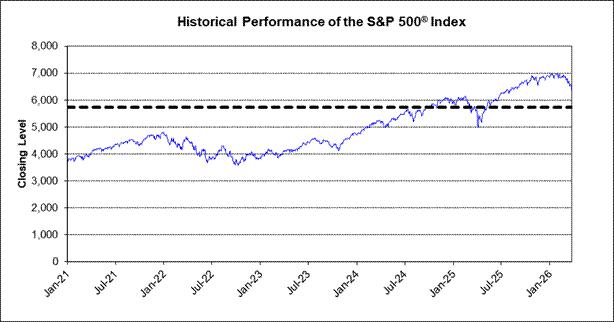 The following graph sets forth the historical performance of the underlier based on the daily closing levels from January 4, 2021 through March 27, 2026. The closing level of the underlier on March 27, 2026 was 6,368.85. The dotted line indicates the buffer level of 90.00% of the initial underlier level.