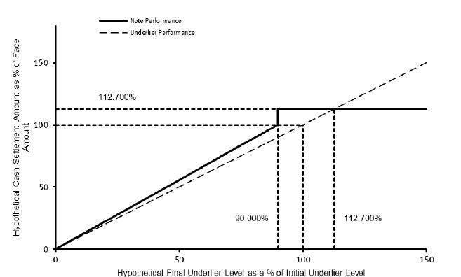 The following chart also shows a graphical illustration of the hypothetical cash settlement amounts (expressed as a percentage of the face amount of your notes) that we would pay on your notes on the stated maturity date, if the final underlier level (expressed as a percentage of the initial underlier level) were any of the hypothetical levels shown on the horizontal axis. The chart shows that any hypothetical final underlier level (expressed as a percentage of the initial underlier level) of less than 90.000% (the section left of the 90.000% marker on the horizontal axis) would result in a hypothetical cash settlement amount of less than 100.000% of the face amount of your notes (the section below the 100.000% marker on the vertical axis) and, accordingly, in a loss of principal to the holder of the notes. The chart also shows that any hypothetical final underlier level (expressed as a percentage of the initial underlier level) of greater than or equal to 90.000% (the section right of the 90.000% marker on the horizontal axis) would result in a capped return on your investment.