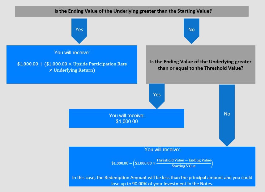 The following table is for purposes of illustration only. It is based on hypothetical values and shows hypothetical returns on the Notes. The table illustrates the calculation of the Redemption Amount and the return on the Notes based on a hypothetical Starting Value of 100, a hypothetical Threshold Value of 90, the Upside Participation Rate of 110.00% and a range of hypothetical Ending Values of the Underlying. The actual amount you receive and the resulting return will depend on the actual Starting Value, Threshold Value and Ending Value of the Underlying, and whether you hold the Notes to maturity. The following examples do not take into account any tax consequences from investing in the Notes.