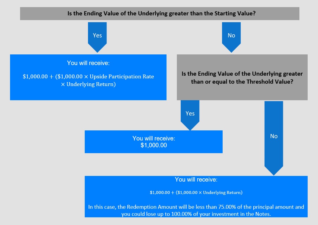 The following table is for purposes of illustration only. It is based on hypothetical values and shows hypothetical returns on the Notes. The table illustrates the calculation of the Redemption Amount and the return on the Notes based on a hypothetical Starting Value of 100, a hypothetical Threshold Value of 75, the Upside Participation Rate of 208.00% and a range of hypothetical Ending Values of the Underlying. The actual amount you receive and the resulting return will depend on the actual Starting Value, Threshold Value and Ending Value of the Underlying, and whether you hold the Notes to maturity. The following examples do not take into account any tax consequences from investing in the Notes.
