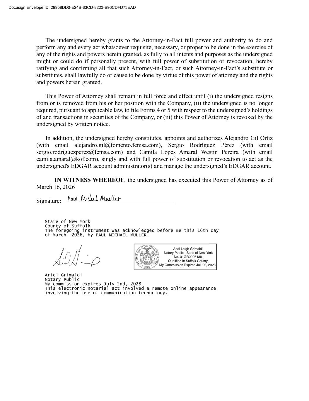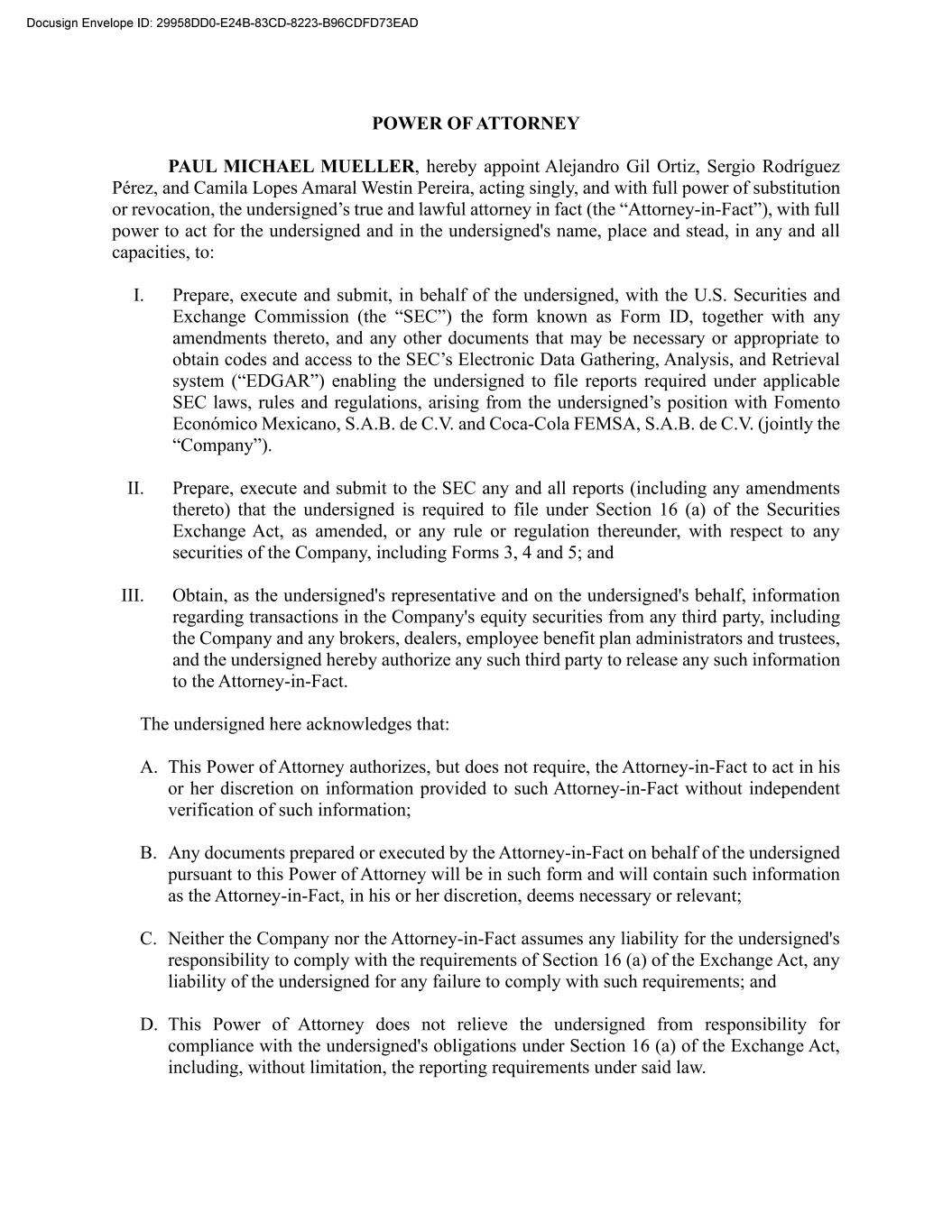 POWER OF ATTORNEY PAUL MICHAEL MUELLER, hereby appoint Alejandro Gil Ortiz, Sergio Rodríguez Pérez, and Camila Lopes Amaral Westin Pereira, acting singly, and with full power of substitution or revocation, the undersigned’s true and lawful attorney in fact (the “Attorney-in-Fact”), with full power to act for the undersigned and in the undersigned's name, place and stead, in any and all capacities, to: I. Prepare, execute and submit, in behalf of the undersigned, with the U.S. Securities and Exchange Commission (the “SEC”) the form known as Form ID, together with any amendments thereto, and any other documents that may be necessary or appropriate to obtain codes and access to the SEC’s Electronic Data Gathering, Analysis, and Retrieval system (“EDGAR”) enabling the undersigned to file reports required under applicable SEC laws, rules and regulations, arising from the undersigned’s position with Fomento Económico Mexicano, S.A.B. de C.V. and Coca-Cola FEMSA, S.A.B. de C.V. (jointly the “Company”). II. Prepare, execute and submit to the SEC any and all reports (including any amendments thereto) that the undersigned is required to file under Section 16 (a) of the Securities Exchange Act, as amended, or any rule or regulation thereunder, with respect to any securities of the Company, including Forms 3, 4 and 5; and III. Obtain, as the undersigned's representative and on the undersigned's behalf, information regarding transactions in the Company's equity securities from any third party, including the Company and any brokers, dealers, employee benefit plan administrators and trustees, and the undersigned hereby authorize any such third party to release any such information to the Attorney-in-Fact. The undersigned here acknowledges that: A. This Power of Attorney authorizes, but does not require, the Attorney-in-Fact to act in his or her discretion on information provided to such Attorney-in-Fact without independent verification of such information; B. Any documents prepared or executed by the Attorney-in-Fact on behalf of the undersigned pursuant to this Power of Attorney will be in such form and will contain such information as the Attorney-in-Fact, in his or her discretion, deems necessary or relevant; C. Neither the Company nor the Attorney-in-Fact assumes any liability for the undersigned's responsibility to comply with the requirements of Section 16 (a) of the Exchange Act, any liability of the undersigned for any failure to comply with such requirements; and D. This Power of Attorney does not relieve the undersigned from responsibility for compliance with the undersigned's obligations under Section 16 (a) of the Exchange Act, including, without limitation, the reporting requirements under said law.