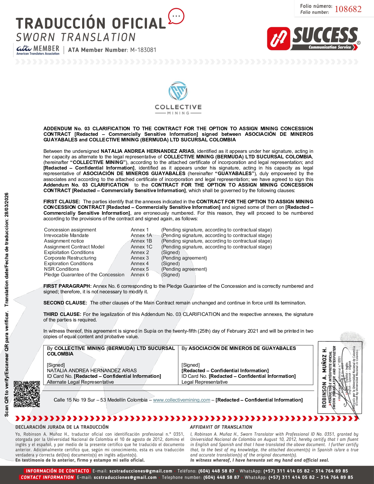 ADDENDUM No. 03 CLARIFICATION TO THE CONTRACT FOR THE OPTION TO ASSIGN MINING CONCESSION CONTRACT [Redacted – Commercially Sensitive Information] signed between ASOCIACIÓN DE MINEROS GUAYABALES and COLLECTIVE MINING (BERMUDA) LTD SUCURSAL COLOMBIA Between the undersigned NATALIA ANDREA HERNANDEZ ARIAS , identified as it appears under her signature, acting in her capacity as alternate to the legal representative of COLLECTIVE MINING (BERMUDA) LTD SUCURSAL COLOMBIA , (hereinafter “COLLECTIVE MINING” ), according to the attached certificate of incorporation and legal representation ; and [Redacted – Confidential Information] , identified as it appears under his signature, acting in his capacity as legal representative of ASOCIACIÓN DE MINEROS GUAYABALES (hereinafter “GUAYABALES” ), duly empowered by the associates and according to the attached certificate of incorporation and legal representation ; we have agreed to sign this Addendum No . 03 CLARIFICATION to the CONTRACT FOR THE OPTION TO ASSIGN MINING CONCESSION CONTRACT [Redacted – Commercially Sensitive Information] , which shall be governed by the following clauses: FIRST CLAUSE : The parties identify that the annexes indicated in the CONTRACT FOR THE OPTION TO ASSIGN MINING CONCESSION CONTRACT [Redacted – Commercially Sensitive Information] and signed some of them on [Redacted – Commercially Sensitive Information] , are erroneously numbered . For this reason, they will proceed to be numbered according to the provisions of the contract and signed again, as follows : (Pending signature, according to contractual stage) Annex 1 Concession assignment (Pending signature, according to contractual stage) Annex 1A Irrevocable Mandate (Pending signature, according to contractual stage) Annex 1B Assignment notice (Pending signature, according to contractual stage) Annex 1C Assignment Contract Model (Signed) Annex 2 Exploitation Conditions (Pending agreement) Annex 3 Corporate Restructuring (Signed) Annex 4 Exploration Conditions (Pending agreement) Annex 5 NSR Conditions (Signed) Annex 6 Pledge Guarantee of the Concession FIRST PARAGRAPH: Annex No. 6 corresponding to the Pledge Guarantee of the Concession and is correctly numbered and signed; therefore, it is not necessary to modify it. SECOND CLAUSE: The other clauses of the Main Contract remain unchanged and continue in force until its termination. THIRD CLAUSE: For the legalization of this Addendum No. 03 CLARIFICATION and the respective annexes, the signature of the parties is required. In witness thereof, this agreement is signed in Supía on the twenty - fifth (25th) day of February 2021 and will be printed in two copies of equal content and probative value. By ASOCIACIÓN DE MINEROS DE GUAYABALES By COLLECTIVE MINING (BERMUDA) LTD SUCURSAL COLOMBIA [Signed] [Redacted – Confidential Information] ID Card No. [Redacted – Confidential Information] Legal Representative [Signed] NATALIA ANDREA HERNANDEZ ARIAS ID Card No. [Redacted – Confidential Information] Alternate Legal Representative Calle 15 No 19 Sur – 53 Medellín Colombia – www.collectivemining.com – [Redacted – Confidential Information] 108682 Scan QR to verify/Escanear QR para verificar. Translation date/Fecha de traduccion: 28/03/2026
