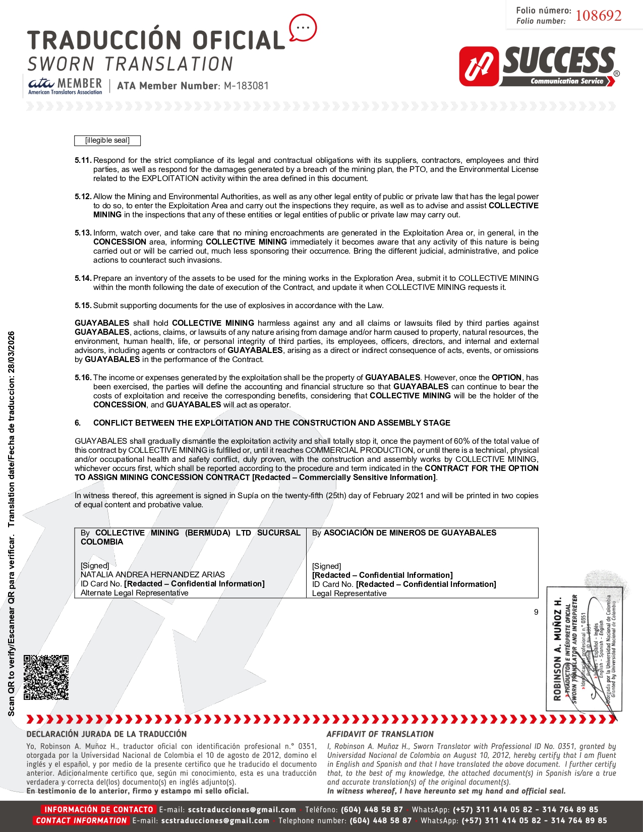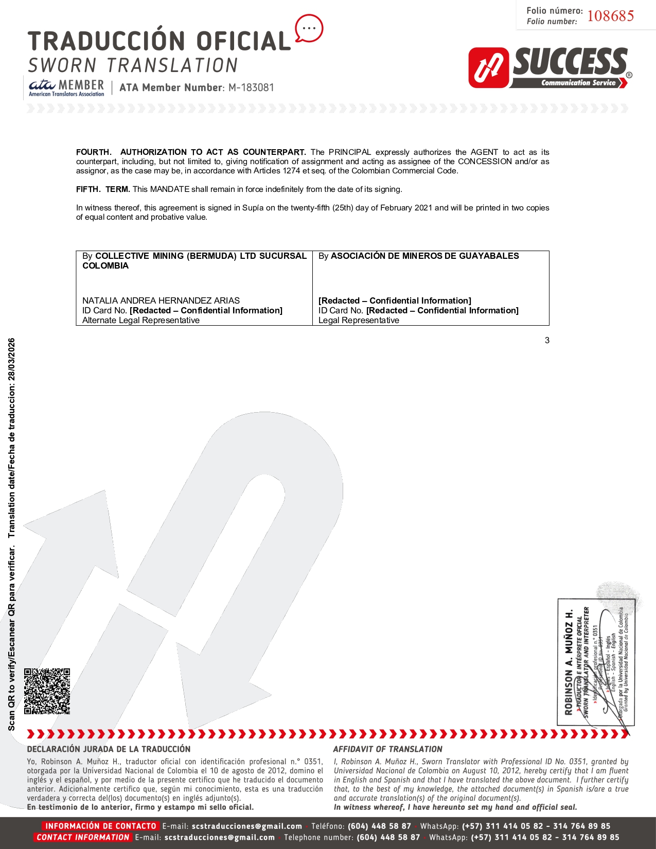 FOURTH . AUTHORIZATION TO ACT AS COUNTERPART . The PRINCIPAL expressly authorizes the AGENT to act as its counterpart, including, but not limited to, giving notification of assignment and acting as assignee of the CONCESSION and/or as assignor, as the case may be, in accordance with Articles 1274 et seq . of the Colombian Commercial Code . FIFTH . TERM . This MANDATE shall remain in force indefinitely from the date of its signing . In witness thereof, this agreement is signed in Supía on the twenty - fifth ( 25 th) day of February 2021 and will be printed in two copies of equal content and probative value . By ASOCIACIÓN DE MINEROS DE GUAYABALES By COLLECTIVE MINING (BERMUDA) LTD SUCURSAL COLOMBIA [Redacted – Confidential Information] ID Card No. [Redacted – Confidential Information] Legal Representative NATALIA ANDREA HERNANDEZ ARIAS ID Card No. [Redacted – Confidential Information] Alternate Legal Representative 3 108685 Scan QR to verify/Escanear QR para verificar. Translation date/Fecha de traduccion: 28/03/2026