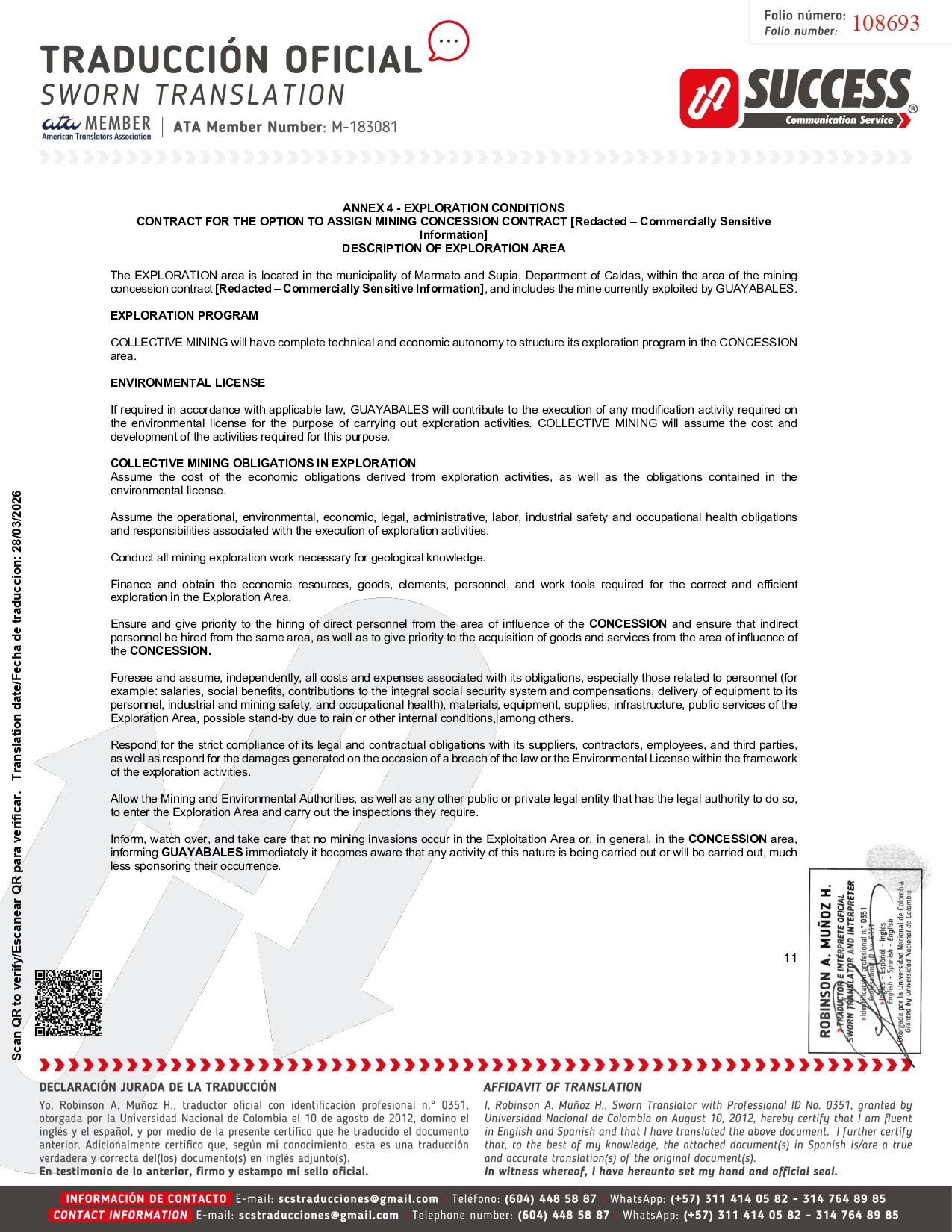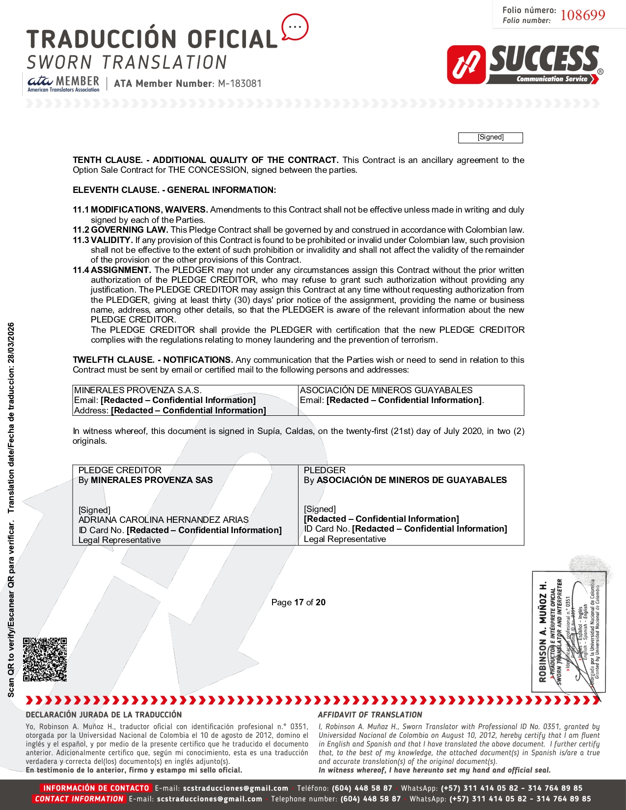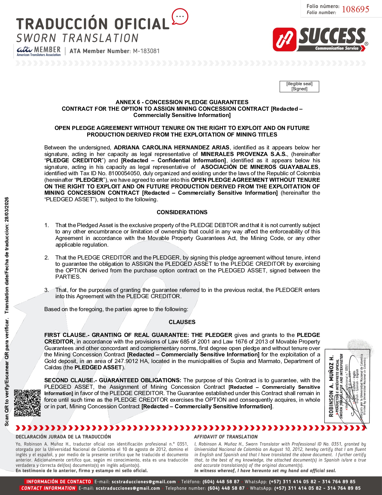 TENTH CLAUSE. - ADDITIONAL QUALITY OF THE CONTRACT. This Contract is an ancillary agreement to the Option Sale Contract for THE CONCESSION, signed between the parties. ELEVENTH CLAUSE. - GENERAL INFORMATION: 1. MODIFICATIONS, WAIVERS . Amendments to this Contract shall not be effective unless made in writing and duly signed by each of the Parties . 2. GOVERNING LAW . This Pledge Contract shall be governed by and construed in accordance with Colombian law . 3. VALIDITY . If any provision of this Contract is found to be prohibited or invalid under Colombian law, such provision shall not be effective to the extent of such prohibition or invalidity and shall not affect the validity of the remainder of the provision or the other provisions of this Contract . 4. ASSIGNMENT . The PLEDGER may not under any circumstances assign this Contract without the prior written authorization of the PLEDGE CREDITOR, who may refuse to grant such authorization without providing any justification . The PLEDGE CREDITOR may assign this Contract at any time without requesting authorization from the PLEDGER, giving at least thirty ( 30 ) days' prior notice of the assignment, providing the name or business name, address, among other details, so that the PLEDGER is aware of the relevant information about the new PLEDGE CREDITOR . The PLEDGE CREDITOR shall provide the PLEDGER with certification that the new PLEDGE CREDITOR complies with the regulations relating to money laundering and the prevention of terrorism . TWELFTH CLAUSE. - NOTIFICATIONS. Any communication that the Parties wish or need to send in relation to this Contract must be sent by email or certified mail to the following persons and addresses: MINERALES PROVENZA S.A.S. Email: [Redacted – Confidential Information] Address: [Redacted – Confidential Information] ASOCIACIÓN DE MINEROS GUAYABALES Email: [Redacted – Confidential Information] . In witness whereof, this document is signed in Supía, Caldas, on the twenty - first (21st) day of July 2020, in two (2) originals. PLEDGER By ASOCIACIÓN DE MINEROS DE GUAYABALES PLEDGE CREDITOR By MINERALES PROVENZA SAS [Signed] [Redacted – Confidential Information] ID Card No. [Redacted – Confidential Information] Legal Representative [Signed] ADRIANA CAROLINA HERNANDEZ ARIAS ID Card No. [Redacted – Confidential Information] Legal Representative Page 17 of 20 [Signed] 108699 Scan QR to verify/Escanear QR para verificar. Translation date/Fecha de traduccion: 28/03/2026