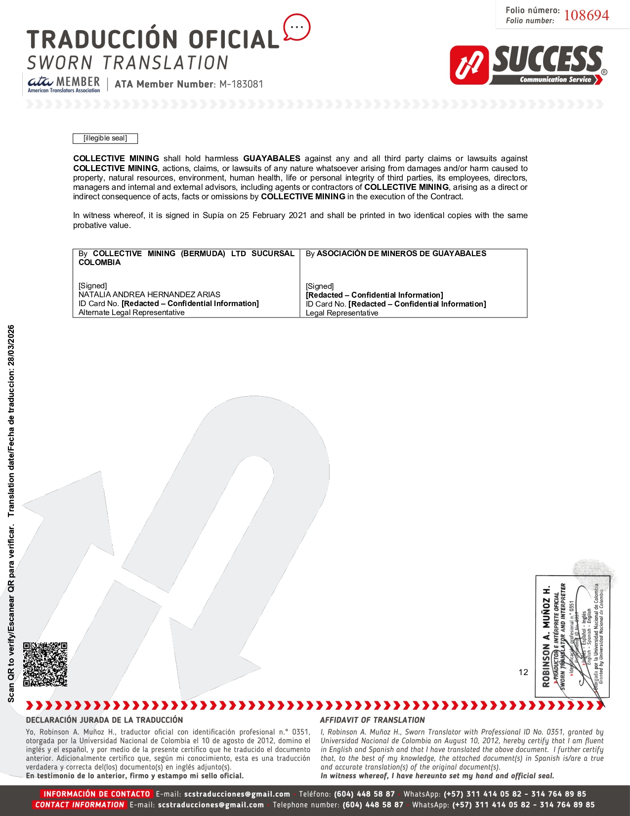 COLLECTIVE MINING shall hold harmless GUAYABALES against any and all third party claims or lawsuits against COLLECTIVE MINING , actions, claims, or lawsuits of any nature whatsoever arising from damages and/or harm caused to property, natural resources, environment, human health, life or personal integrity of third parties, its employees, directors, managers and internal and external advisors, including agents or contractors of COLLECTIVE MINING , arising as a direct or indirect consequence of acts, facts or omissions by COLLECTIVE MINING in the execution of the Contract . In witness whereof, it is signed in Supía on 25 February 2021 and shall be printed in two identical copies with the same probative value . By ASOCIACIÓN DE MINEROS DE GUAYABALES By COLLECTIVE MINING (BERMUDA) LTD SUCURSAL COLOMBIA [Signed] [Redacted – Confidential Information] ID Card No. [Redacted – Confidential Information] Legal Representative [Signed] NATALIA ANDREA HERNANDEZ ARIAS ID Card No. [Redacted – Confidential Information] Alternate Legal Representative 12 [illegible seal] 108694 Scan QR to verify/Escanear QR para verificar. Translation date/Fecha de traduccion: 28/03/2026