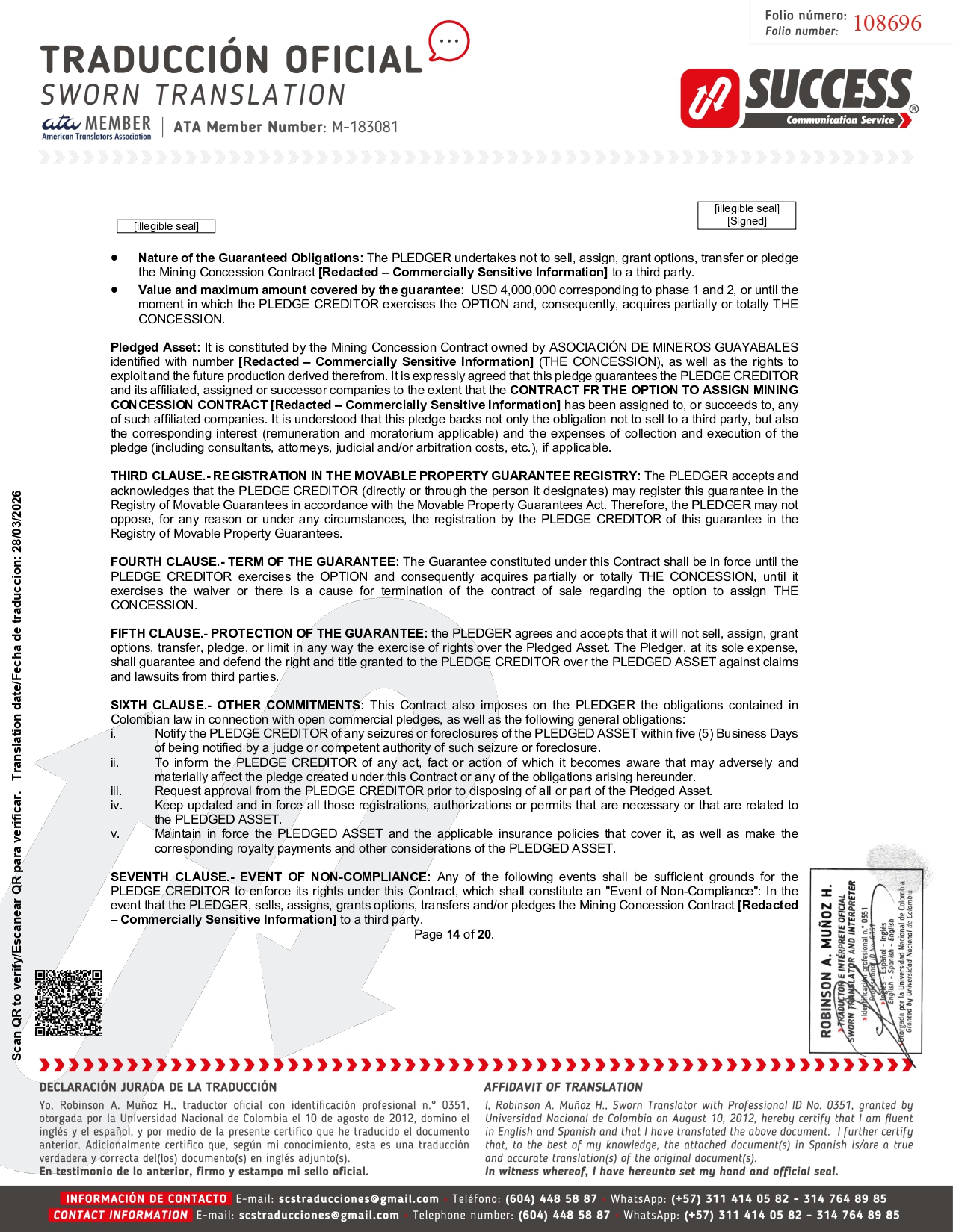 Nature of the Guaranteed Obligations : The PLEDGER undertakes not to sell, assign, grant options, transfer or pledge the Mining Concession Contract [Redacted – Commercially Sensitive Information] to a third party . Value and maximum amount covered by the guarantee : USD 4 , 000 , 000 corresponding to phase 1 and 2 , or until the moment in which the PLEDGE CREDITOR exercises the OPTION and, consequently, acquires partially or totally THE CONCESSION . Pledged Asset : It is constituted by the Mining Concession Contract owned by ASOCIACIÓN DE MINEROS GUAYABALES identified with number [Redacted – Commercially Sensitive Information] (THE CONCESSION), as well as the rights to exploit and the future production derived therefrom . It is expressly agreed that this pledge guarantees the PLEDGE CREDITOR and its affiliated, assigned or successor companies to the extent that the CONTRACT FR THE OPTION TO ASSIGN MINING CONCESSION CONTRACT [Redacted – Commercially Sensitive Information] has been assigned to, or succeeds to, any of such affiliated companies . It is understood that this pledge backs not only the obligation not to sell to a third party, but also the corresponding interest (remuneration and moratorium applicable) and the expenses of collection and execution of the pledge (including consultants, attorneys, judicial and/or arbitration costs, etc . ), if applicable . THIRD CLAUSE . - REGISTRATION IN THE MOVABLE PROPERTY GUARANTEE REGISTRY : The PLEDGER accepts and acknowledges that the PLEDGE CREDITOR (directly or through the person it designates) may register this guarantee in the Registry of Movable Guarantees in accordance with the Movable Property Guarantees Act . Therefore, the PLEDGER may not oppose, for any reason or under any circumstances, the registration by the PLEDGE CREDITOR of this guarantee in the Registry of Movable Property Guarantees . FOURTH CLAUSE . - TERM OF THE GUARANTEE : The Guarantee constituted under this Contract shall be in force until the PLEDGE CREDITOR exercises the OPTION and consequently acquires partially or totally THE CONCESSION, until it exercises the waiver or there is a cause for termination of the contract of sale regarding the option to assign THE CONCESSION . FIFTH CLAUSE . - PROTECTION OF THE GUARANTEE : the PLEDGER agrees and accepts that it will not sell, assign, grant options, transfer, pledge, or limit in any way the exercise of rights over the Pledged Asset . The Pledger, at its sole expense, shall guarantee and defend the right and title granted to the PLEDGE CREDITOR over the PLEDGED ASSET against claims and lawsuits from third parties . SIXTH CLAUSE . - OTHER COMMITMENTS : This Contract also imposes on the PLEDGER the obligations contained in Colombian law in connection with open commercial pledges, as well as the following general obligations : i. ii. iii. iv. v. Notify the PLEDGE CREDITOR of any seizures or foreclosures of the PLEDGED ASSET within five (5) Business Days of being notified by a judge or competent authority of such seizure or foreclosure. To inform the PLEDGE CREDITOR of any act, fact or action of which it becomes aware that may adversely and materially affect the pledge created under this Contract or any of the obligations arising hereunder. Request approval from the PLEDGE CREDITOR prior to disposing of all or part of the Pledged Asset. Keep updated and in force all those registrations, authorizations or permits that are necessary or that are related to the PLEDGED ASSET. Maintain in force the PLEDGED ASSET and the applicable insurance policies that cover it, as well as make the corresponding royalty payments and other considerations of the PLEDGED ASSET. SEVENTH CLAUSE . - EVENT OF NON - COMPLIANCE : Any of the following events shall be sufficient grounds for the PLEDGE CREDITOR to enforce its rights under this Contract, which shall constitute an "Event of Non - Compliance" : In the event that the PLEDGER, sells, assigns, grants options, transfers and/or pledges the Mining Concession Contract [Redacted – Commercially Sensitive Information] to a third party . Page 14 of 20 . [illegible seal] [Signed] [illegible seal] 108696 Scan QR to verify/Escanear QR para verificar. Translation date/Fecha de traduccion: 28/03/2026