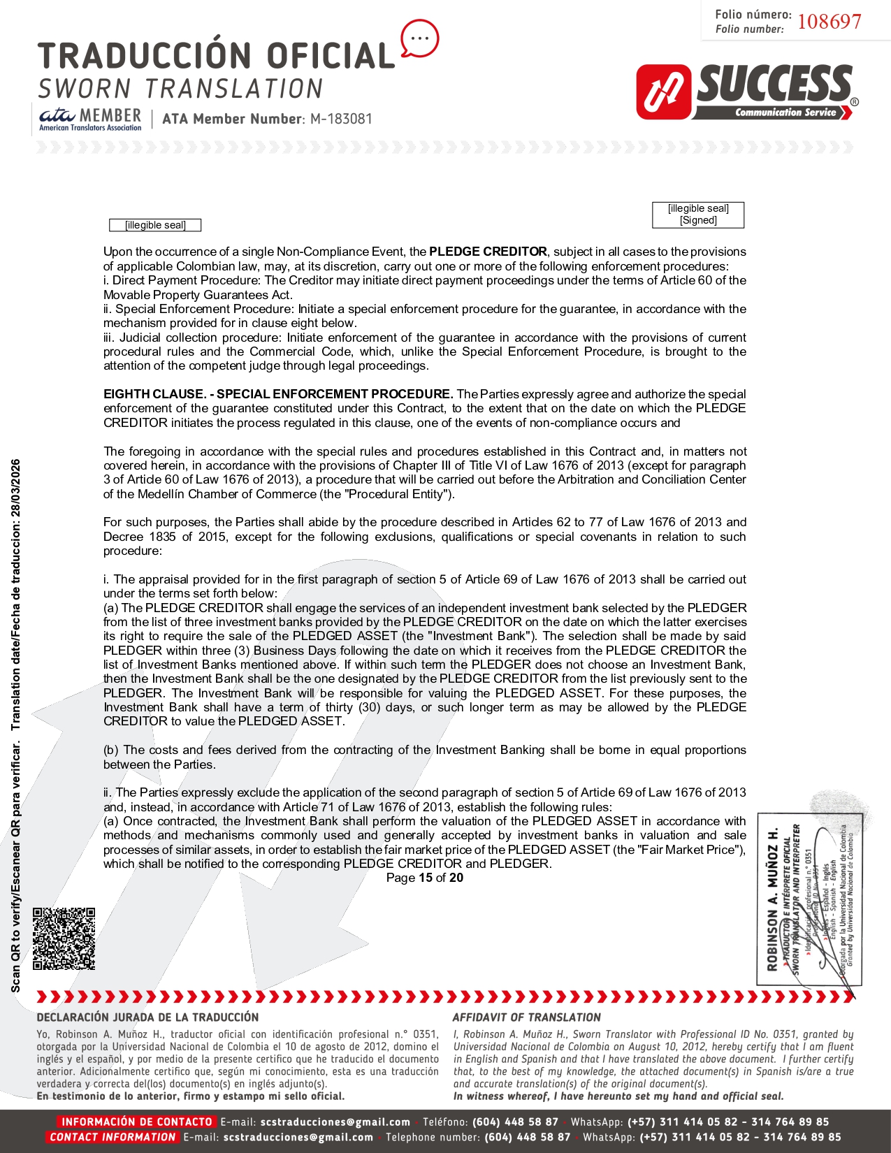 Upon the occurrence of a single Non - Compliance Event, the PLEDGE CREDITOR , subject in all cases to the provisions of applicable Colombian law, may, at its discretion, carry out one or more of the following enforcement procedures : i. Direct Payment Procedure : The Creditor may initiate direct payment proceedings under the terms of Article 60 of the Movable Property Guarantees Act . ii. Special Enforcement Procedure : Initiate a special enforcement procedure for the guarantee, in accordance with the mechanism provided for in clause eight below . iii. Judicial collection procedure : Initiate enforcement of the guarantee in accordance with the provisions of current procedural rules and the Commercial Code, which, unlike the Special Enforcement Procedure, is brought to the attention of the competent judge through legal proceedings . EIGHTH CLAUSE . - SPECIAL ENFORCEMENT PROCEDURE . The Parties expressly agree and authorize the special enforcement of the guarantee constituted under this Contract, to the extent that on the date on which the PLEDGE CREDITOR initiates the process regulated in this clause, one of the events of non - compliance occurs and The foregoing in accordance with the special rules and procedures established in this Contract and, in matters not covered herein, in accordance with the provisions of Chapter III of Title VI of Law 1676 of 2013 (except for paragraph 3 of Article 60 of Law 1676 of 2013 ), a procedure that will be carried out before the Arbitration and Conciliation Center of the Medellín Chamber of Commerce (the "Procedural Entity") . For such purposes, the Parties shall abide by the procedure described in Articles 62 to 77 of Law 1676 of 2013 and Decree 1835 of 2015 , except for the following exclusions, qualifications or special covenants in relation to such procedure : i. The appraisal provided for in the first paragraph of section 5 of Article 69 of Law 1676 of 2013 shall be carried out under the terms set forth below : (a) The PLEDGE CREDITOR shall engage the services of an independent investment bank selected by the PLEDGER from the list of three investment banks provided by the PLEDGE CREDITOR on the date on which the latter exercises its right to require the sale of the PLEDGED ASSET (the "Investment Bank") . The selection shall be made by said PLEDGER within three ( 3 ) Business Days following the date on which it receives from the PLEDGE CREDITOR the list of Investment Banks mentioned above . If within such term the PLEDGER does not choose an Investment Bank, then the Investment Bank shall be the one designated by the PLEDGE CREDITOR from the list previously sent to the PLEDGER . The Investment Bank will be responsible for valuing the PLEDGED ASSET . For these purposes, the Investment Bank shall have a term of thirty ( 30 ) days, or such longer term as may be allowed by the PLEDGE CREDITOR to value the PLEDGED ASSET . (b) The costs and fees derived from the contracting of the Investment Banking shall be borne in equal proportions between the Parties . ii . The Parties expressly exclude the application of the second paragraph of section 5 of Article 69 of Law 1676 of 2013 and, instead, in accordance with Article 71 of Law 1676 of 2013 , establish the following rules : (a) Once contracted, the Investment Bank shall perform the valuation of the PLEDGED ASSET in accordance with methods and mechanisms commonly used and generally accepted by investment banks in valuation and sale processes of similar assets, in order to establish the fair market price of the PLEDGED ASSET (the "Fair Market Price"), which shall be notified to the corresponding PLEDGE CREDITOR and PLEDGER . Page 15 of 20 [illegible seal] [Signed] [illegible seal] 108697 Scan QR to verify/Escanear QR para verificar. Translation date/Fecha de traduccion: 28/03/2026