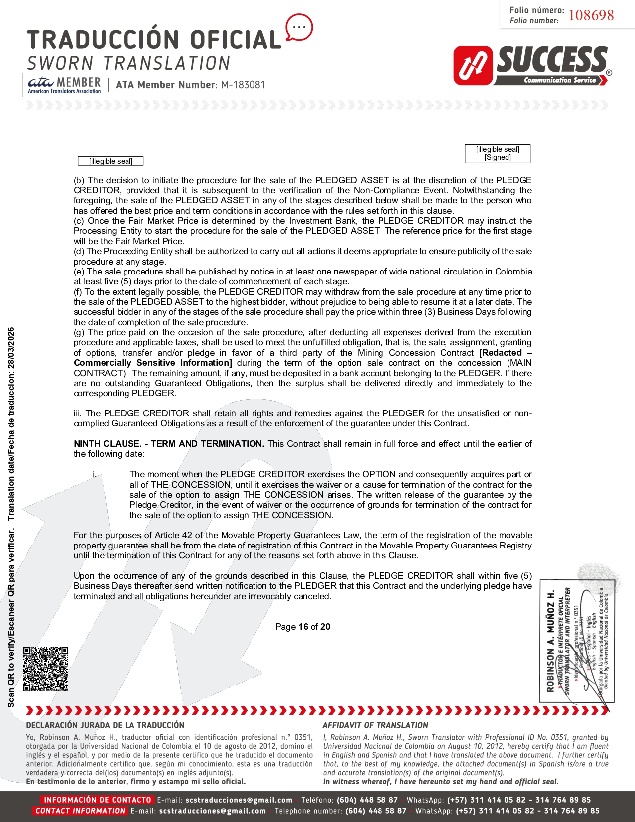 (b) The decision to initiate the procedure for the sale of the PLEDGED ASSET is at the discretion of the PLEDGE CREDITOR, provided that it is subsequent to the verification of the Non - Compliance Event . Notwithstanding the foregoing, the sale of the PLEDGED ASSET in any of the stages described below shall be made to the person who has offered the best price and term conditions in accordance with the rules set forth in this clause . (c) Once the Fair Market Price is determined by the Investment Bank, the PLEDGE CREDITOR may instruct the Processing Entity to start the procedure for the sale of the PLEDGED ASSET . The reference price for the first stage will be the Fair Market Price . (d) The Proceeding Entity shall be authorized to carry out all actions it deems appropriate to ensure publicity of the sale procedure at any stage . (e) The sale procedure shall be published by notice in at least one newspaper of wide national circulation in Colombia at least five ( 5 ) days prior to the date of commencement of each stage . (f) To the extent legally possible, the PLEDGE CREDITOR may withdraw from the sale procedure at any time prior to the sale of the PLEDGED ASSET to the highest bidder, without prejudice to being able to resume it at a later date . The successful bidder in any of the stages of the sale procedure shall pay the price within three ( 3 ) Business Days following the date of completion of the sale procedure . (g) The price paid on the occasion of the sale procedure, after deducting all expenses derived from the execution procedure and applicable taxes, shall be used to meet the unfulfilled obligation, that is, the sale, assignment, granting of options, transfer and/or pledge in favor of a third party of the Mining Concession Contract [Redacted – Commercially Sensitive Information] during the term of the option sale contract on the concession (MAIN CONTRACT) . The remaining amount, if any, must be deposited in a bank account belonging to the PLEDGER . If there are no outstanding Guaranteed Obligations, then the surplus shall be delivered directly and immediately to the corresponding PLEDGER . iii . The PLEDGE CREDITOR shall retain all rights and remedies against the PLEDGER for the unsatisfied or non - complied Guaranteed Obligations as a result of the enforcement of the guarantee under this Contract . NINTH CLAUSE . - TERM AND TERMINATION . This Contract shall remain in full force and effect until the earlier of the following date : i. The moment when the PLEDGE CREDITOR exercises the OPTION and consequently acquires part or all of THE CONCESSION, until it exercises the waiver or a cause for termination of the contract for the sale of the option to assign THE CONCESSION arises . The written release of the guarantee by the Pledge Creditor, in the event of waiver or the occurrence of grounds for termination of the contract for the sale of the option to assign THE CONCESSION . For the purposes of Article 42 of the Movable Property Guarantees Law, the term of the registration of the movable property guarantee shall be from the date of registration of this Contract in the Movable Property Guarantees Registry until the termination of this Contract for any of the reasons set forth above in this Clause . Upon the occurrence of any of the grounds described in this Clause, the PLEDGE CREDITOR shall within five ( 5 ) Business Days thereafter send written notification to the PLEDGER that this Contract and the underlying pledge have terminated and all obligations hereunder are irrevocably canceled . Page 16 of 20 [illegible seal] [Signed] [illegible seal] 108698 Scan QR to verify/Escanear QR para verificar. Translation date/Fecha de traduccion: 28/03/2026
