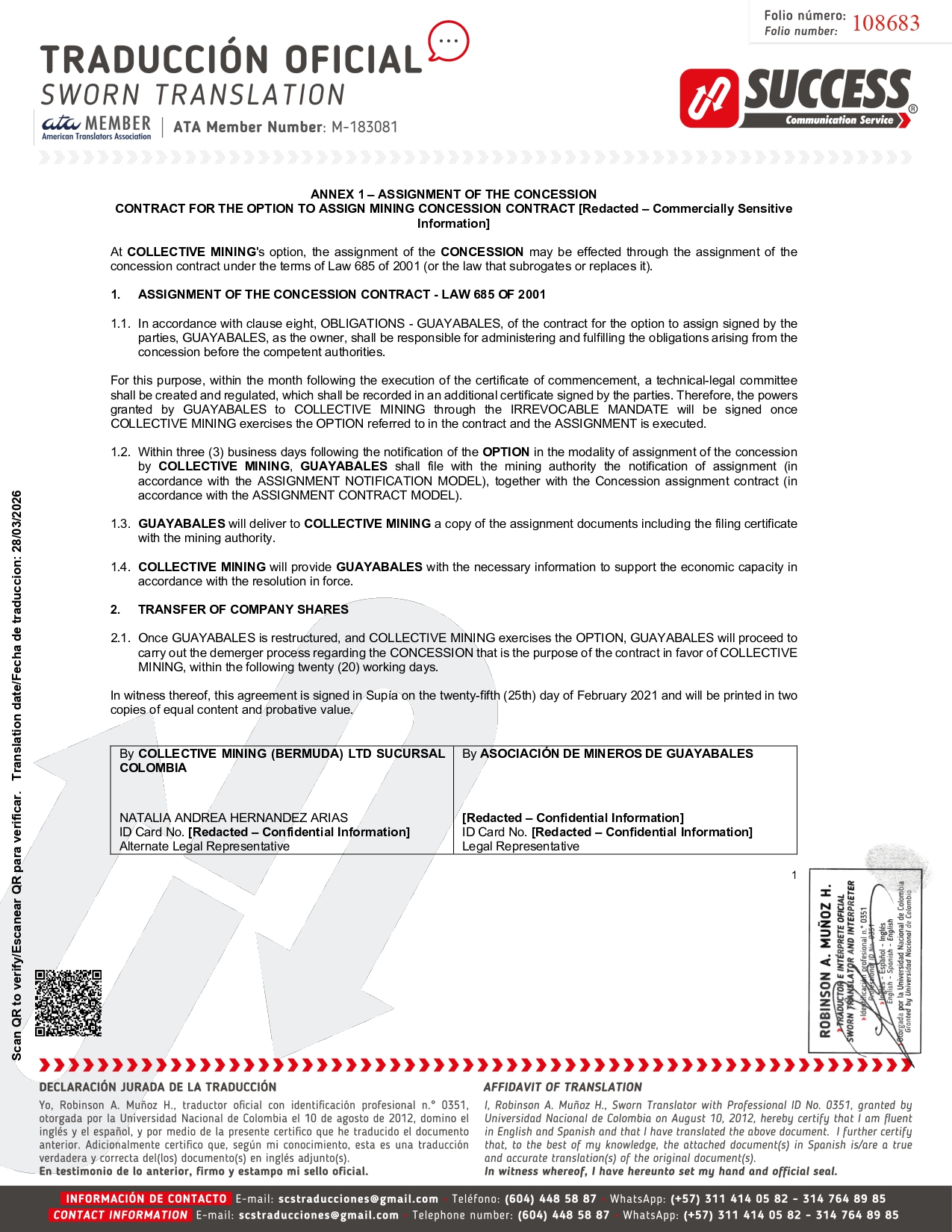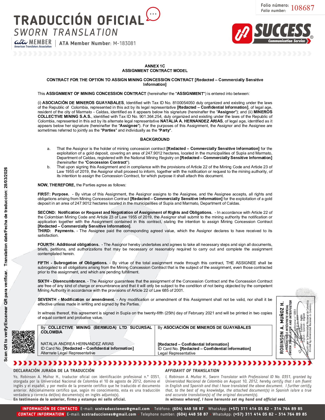 ANNEX 1C ASSIGNMENT CONTRACT MODEL CONTRACT FOR THE OPTION TO ASSIGN MINING CONCESSION CONTRACT [Redacted – Commercially Sensitive Information] This ASSIGNMENT OF MINING CONCESSION CONTRACT (hereinafter the " ASSIGNMENT ") is entered into between : (i) ASOCIACIÓN DE MINEROS GUAYABALES , Identified with Tax ID No . 8100054050 duly organized and existing under the laws of the Republic of Colombia, represented in this act by its legal representative [Redacted – Confidential Information] , of legal age, resident of the city of Marmato - Caldas, identified as it appears below his signature (hereinafter the " Assignor ") ; and (ii) MINEROS COLLECTIVE MINING S . A . S . , identified with Tax ID No . 901 . 364 . 254 , duly organized and existing under the laws of the Republic of Colombia, represented in this act by its alternate legal representative NATALIA A . HERNANDEZ ARIAS , of legal age, identified as it appears below her signature (hereinafter the " Assignee ") . For the purposes of this Assignment, the Assignor and the Assignee are sometimes referred to jointly as the " Parties " and individually as the " Party " . BACKGROUND a. That the Assignor is the holder of mining concession contract [Redacted – Commercially Sensitive Information] for the exploitation of a gold deposit, covering an area of 247 . 9012 hectares, located in the municipalities of Supía and Marmato, Department of Caldas, registered with the National Mining Registry on [Redacted – Commercially Sensitive Information] (hereinafter the " Concession Contract ") . b. That upon signing this Assignment and in compliance with the provisions of Article 22 of the Mining Code and Article 23 of Law 1955 of 2019 , the Assignor shall proceed to inform, together with the notification or request to the mining authority, of its intention to assign the Concession Contract, for which purpose it shall attach this document . NOW, THEREFORE, the Parties agree as follows : FIRST : Purpose . - By virtue of this Assignment, the Assignor assigns to the Assignee, and the Assignee accepts, all rights and obligations arising from Mining Concession Contract [Redacted – Commercially Sensitive Information] for the exploitation of a gold deposit in an area of 247 . 9012 hectares located in the municipalities of Supía and Marmato, Department of Caldas . SECOND : Notification or Request and Negotiation of Assignment of Rights and Obligations . - In accordance with Article 22 of the Colombian Mining Code and Article 23 of Law 1955 of 2019 , the Assignor shall submit to the mining authority the notification or application together with the Assignment contained in this contract, stating the intention to assign Mining Concession Contract [Redacted – Commercially Sensitive Information] . THIRD : Payments . - The Assignee paid the corresponding agreed value, which the Assignor declares to have received to its satisfaction . FOURTH : Additional obligations . - The Assignor hereby undertakes and agrees to take all necessary steps and sign all documents, briefs, petitions, and authorizations that may be necessary or reasonably required to carry out and complete the assignment contemplated herein . FIFTH - Subrogation of Obligations . - By virtue of the total assignment made through this contract, THE ASSIGNEE shall be subrogated to all obligations arising from the Mining Concession Contract that is the subject of the assignment, even those contracted prior to the assignment, and which are pending fulfillment . SIXTH - Disencumbrance . - The Assignor guarantees that the assignment of the Concession Contract and the Concession Contract are free of any kind of charge or encumbrance and that it will only be subject to the condition of not being objected by the competent Mining Authority in accordance with the provisions of Article 22 of Law 685 of 2001 . SEVENTH - Modification or amendment . - Any modification or amendment of this Assignment shall not be valid, nor shall it be effective unless made in writing and signed by the Parties . In witness thereof, this agreement is signed in Supía on the twenty - fifth ( 25 th) day of February 2021 and will be printed in two copies of equal content and probative value . By ASOCIACIÓN DE MINEROS DE GUAYABALES By COLLECTIVE MINING (BERMUDA) LTD SUCURSAL COLOMBIA [Redacted – Confidential Information] ID Card No. [Redacted – Confidential Information] Legal Representative NATALIA ANDREA HERNANDEZ ARIAS ID Card No. [Redacted – Confidential Information] Alternate Legal Representative 108687 Scan QR to verify/Escanear QR para verificar. Translation date/Fecha de traduccion: 28/03/2026
