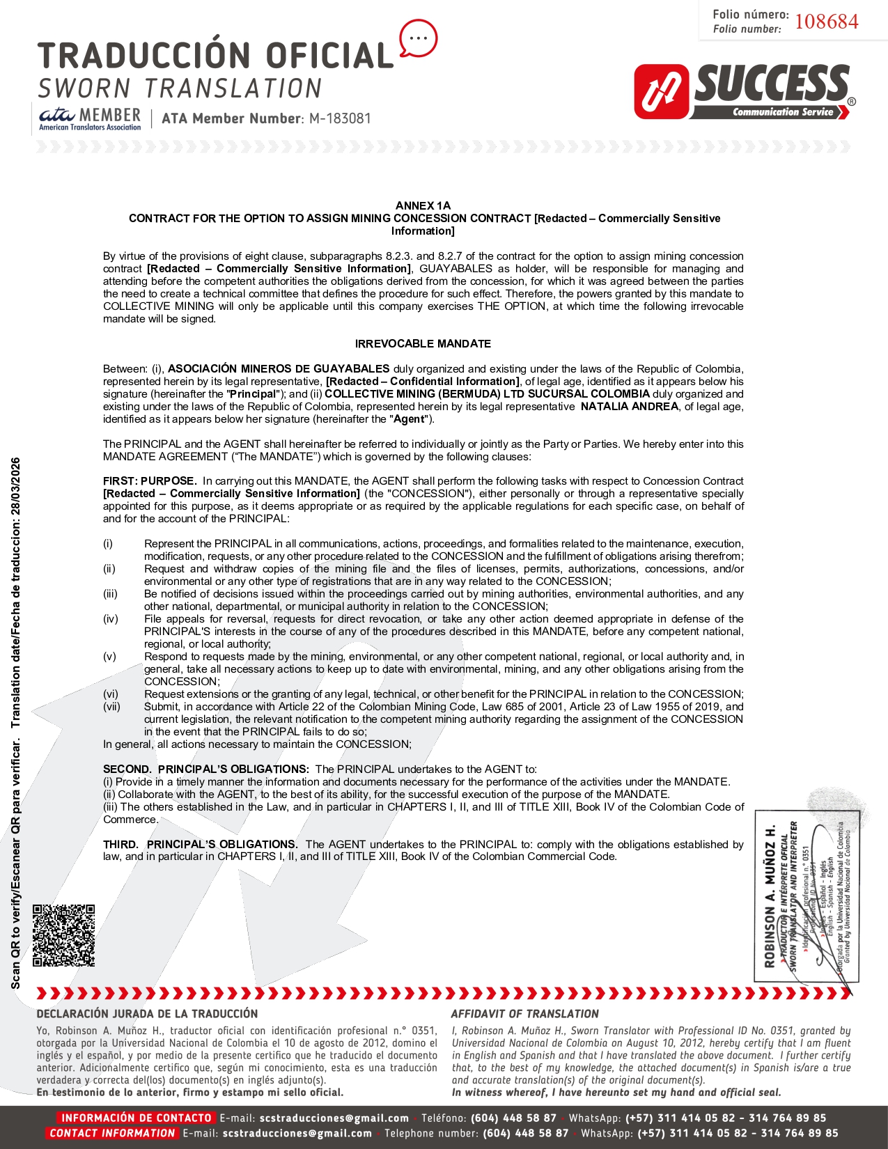 ANNEX 1A CONTRACT FOR THE OPTION TO ASSIGN MINING CONCESSION CONTRACT [Redacted – Commercially Sensitive Information] By virtue of the provisions of eight clause, subparagraphs 8 . 2 . 3 . and 8 . 2 . 7 of the contract for the option to assign mining concession contract [Redacted – Commercially Sensitive Information] , GUAYABALES as holder, will be responsible for managing and attending before the competent authorities the obligations derived from the concession, for which it was agreed between the parties the need to create a technical committee that defines the procedure for such effect . Therefore, the powers granted by this mandate to COLLECTIVE MINING will only be applicable until this company exercises THE OPTION, at which time the following irrevocable mandate will be signed . IRREVOCABLE MANDATE Between : (i), ASOCIACIÓN MINEROS DE GUAYABALES duly organized and existing under the laws of the Republic of Colombia, represented herein by its legal representative, [Redacted – Confidential Information] , of legal age, identified as it appears below his signature (hereinafter the " Principal ") ; and (ii) COLLECTIVE MINING (BERMUDA) LTD SUCURSAL COLOMBIA duly organized and existing under the laws of the Republic of Colombia, represented herein by its legal representative NATALIA ANDREA , of legal age, identified as it appears below her signature (hereinafter the " Agent ") . The PRINCIPAL and the AGENT shall hereinafter be referred to individually or jointly as the Party or Parties . We hereby enter into this MANDATE AGREEMENT (“The MANDATE”) which is governed by the following clauses : FIRST : PURPOSE . In carrying out this MANDATE, the AGENT shall perform the following tasks with respect to Concession Contract [Redacted – Commercially Sensitive Information] (the "CONCESSION"), either personally or through a representative specially appointed for this purpose, as it deems appropriate or as required by the applicable regulations for each specific case, on behalf of and for the account of the PRINCIPAL : (i) (ii) (iii) (iv) (v) (vi) (vii) Represent the PRINCIPAL in all communications, actions, proceedings, and formalities related to the maintenance, execution, modification, requests, or any other procedure related to the CONCESSION and the fulfillment of obligations arising therefrom ; Request and withdraw copies of the mining file and the files of licenses, permits, authorizations, concessions, and/or environmental or any other type of registrations that are in any way related to the CONCESSION ; Be notified of decisions issued within the proceedings carried out by mining authorities, environmental authorities, and any other national, departmental, or municipal authority in relation to the CONCESSION ; File appeals for reversal, requests for direct revocation, or take any other action deemed appropriate in defense of the PRINCIPAL'S interests in the course of any of the procedures described in this MANDATE, before any competent national, regional, or local authority ; Respond to requests made by the mining, environmental, or any other competent national, regional, or local authority and, in general, take all necessary actions to keep up to date with environmental, mining, and any other obligations arising from the CONCESSION; Request extensions or the granting of any legal, technical, or other benefit for the PRINCIPAL in relation to the CONCESSION ; Submit, in accordance with Article 22 of the Colombian Mining Code, Law 685 of 2001 , Article 23 of Law 1955 of 2019 , and current legislation, the relevant notification to the competent mining authority regarding the assignment of the CONCESSION in the event that the PRINCIPAL fails to do so ; In general, all actions necessary to maintain the CONCESSION; SECOND. PRINCIPAL’S OBLIGATIONS: The PRINCIPAL undertakes to the AGENT to: (i) Provide in a timely manner the information and documents necessary for the performance of the activities under the MANDATE. (ii) Collaborate with the AGENT, to the best of its ability, for the successful execution of the purpose of the MANDATE. (iii) The others established in the Law, and in particular in CHAPTERS I, II, and III of TITLE XIII, Book IV of the Colombian Code of Commerce. THIRD. PRINCIPAL’S OBLIGATIONS. The AGENT undertakes to the PRINCIPAL to: comply with the obligations established by law, and in particular in CHAPTERS I, II, and III of TITLE XIII, Book IV of the Colombian Commercial Code. 108684 Scan QR to verify/Escanear QR para verificar. Translation date/Fecha de traduccion: 28/03/2026