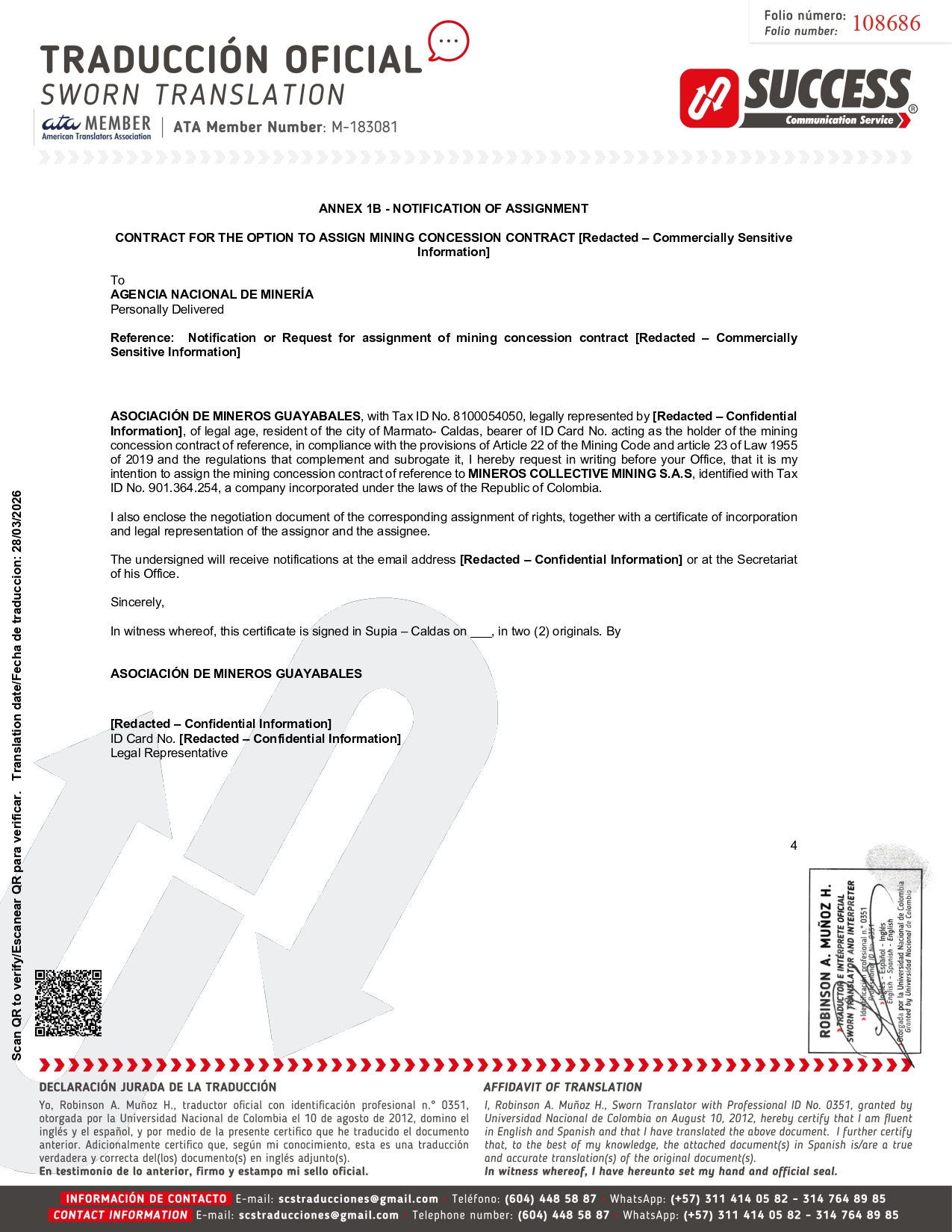 ANNEX 1B - NOTIFICATION OF ASSIGNMENT CONTRACT FOR THE OPTION TO ASSIGN MINING CONCESSION CONTRACT [Redacted – Commercially Sensitive Information] To AGENCIA NACIONAL DE MINERÍA Personally Delivered Reference: Notification or Request for assignment of mining concession contract [Redacted – Commercially Sensitive Information] ASOCIACIÓN DE MINEROS GUAYABALES , with Tax ID No . 8100054050 , legally represented by [Redacted – Confidential Information] , of legal age, resident of the city of Marmato - Caldas, bearer of ID Card No . acting as the holder of the mining concession contract of reference, in compliance with the provisions of Article 22 of the Mining Code and article 23 of Law 1955 of 2019 and the regulations that complement and subrogate it, I hereby request in writing before your Office, that it is my intention to assign the mining concession contract of reference to MINEROS COLLECTIVE MINING S . A . S , identified with Tax ID No . 901 . 364 . 254 , a company incorporated under the laws of the Republic of Colombia . I also enclose the negotiation document of the corresponding assignment of rights, together with a certificate of incorporation and legal representation of the assignor and the assignee. The undersigned will receive notifications at the email address [Redacted – Confidential Information] or at the Secretariat of his Office. Sincerely, In witness whereof, this certificate is signed in Supia – Caldas on , in two (2) originals. By ASOCIACIÓN DE MINEROS GUAYABALES [Redacted – Confidential Information] ID Card No. [Redacted – Confidential Information] Legal Representative 4 108686 Scan QR to verify/Escanear QR para verificar. Translation date/Fecha de traduccion: 28/03/2026