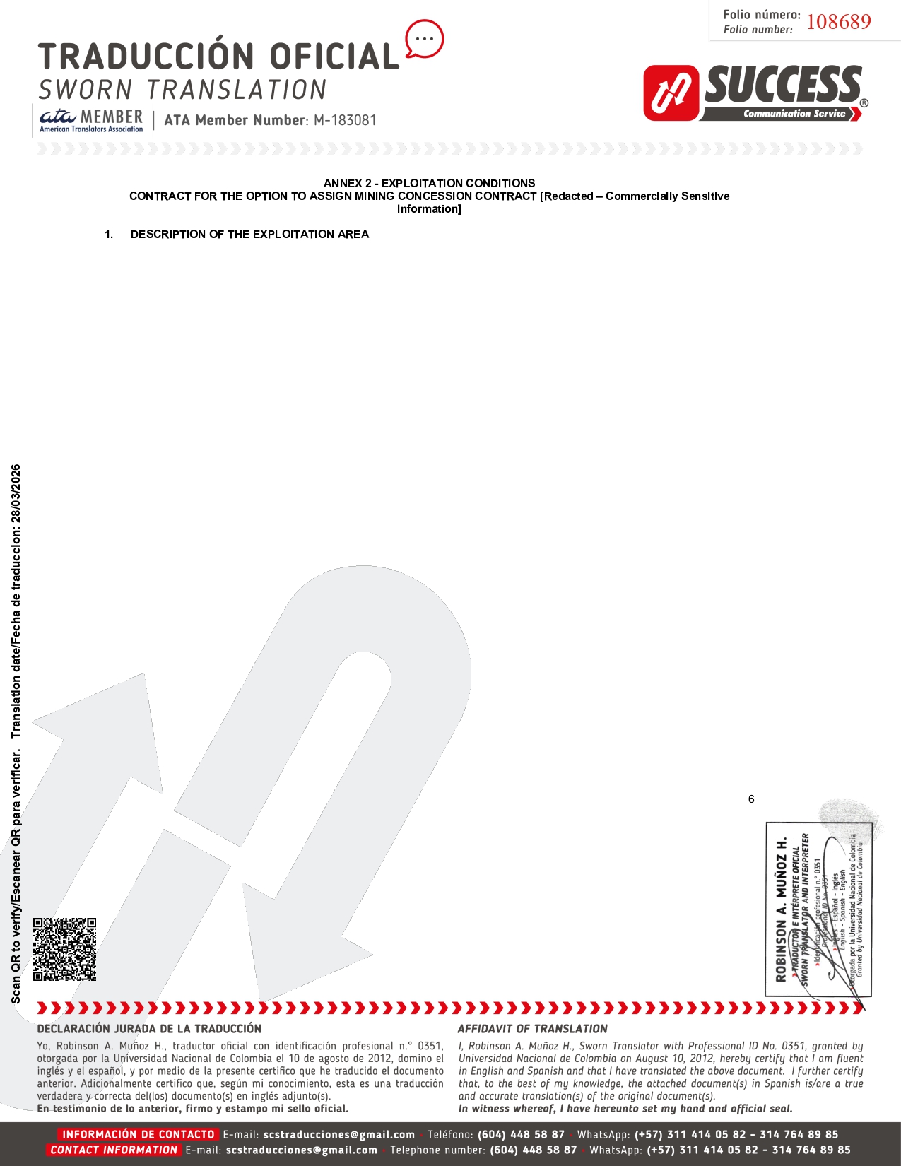 ANNEX 2 - EXPLOITATION CONDITIONS CONTRACT FOR THE OPTION TO ASSIGN MINING CONCESSION CONTRACT [Redacted – Commercially Sensitive Information] 1. DESCRIPTION OF THE EXPLOITATION AREA 6 108689 Scan QR to verify/Escanear QR para verificar. Translation date/Fecha de traduccion: 28/03/2026