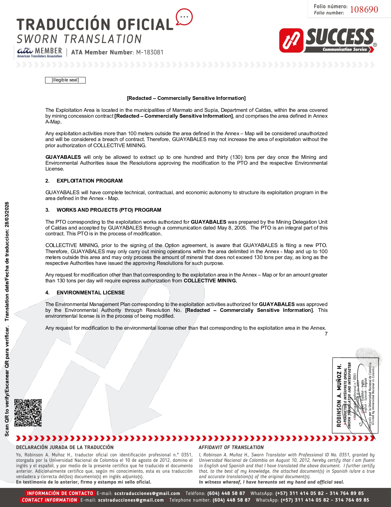 [Redacted – Commercially Sensitive Information] The Exploitation Area is located in the municipalities of Marmato and Supía, Department of Caldas, within the area covered by mining concession contract [Redacted – Commercially Sensitive Information] , and comprises the area defined in Annex A - Map . Any exploitation activities more than 100 meters outside the area defined in the Annex – Map will be considered unauthorized and will be considered a breach of contract . Therefore, GUAYABALES may not increase the area of exploitation without the prior authorization of COLLECTIVE MINING . GUAYABALES will only be allowed to extract up to one hundred and thirty ( 130 ) tons per day once the Mining and Environmental Authorities issue the Resolutions approving the modification to the PTO and the respective Environmental License . 2. EXPLOITATION PROGRAM GUAYABALES will have complete technical, contractual, and economic autonomy to structure its exploitation program in the area defined in the Annex - Map . 3. WORKS AND PROJECTS (PTO) PROGRAM The PTO corresponding to the exploitation works authorized for GUAYABALES was prepared by the Mining Delegation Unit of Caldas and accepted by GUAYABALES through a communication dated May 8 , 2005 . The PTO is an integral part of this contract . This PTO is in the process of modification . COLLECTIVE MINING, prior to the signing of the Option agreement, is aware that GUAYABALES is filing a new PTO . Therefore, GUAYABALES may only carry out mining operations within the area delimited in the Annex - Map and up to 100 meters outside this area and may only process the amount of mineral that does not exceed 130 tons per day, as long as the respective Authorities have issued the approving Resolutions for such purpose . Any request for modification other than that corresponding to the exploitation area in the Annex – Map or for an amount greater than 130 tons per day will require express authorization from COLLECTIVE MINING . 4. ENVIRONMENTAL LICENSE The Environmental Management Plan corresponding to the exploitation activities authorized for GUAYABALES was approved by the Environmental Authority through Resolution No . [Redacted – Commercially Sensitive Information] . This environmental license is in the process of being modified . Any request for modification to the environmental license other than that corresponding to the exploitation area in the Annex. 7 [illegible seal] 108690 Scan QR to verify/Escanear QR para verificar. Translation date/Fecha de traduccion: 28/03/2026