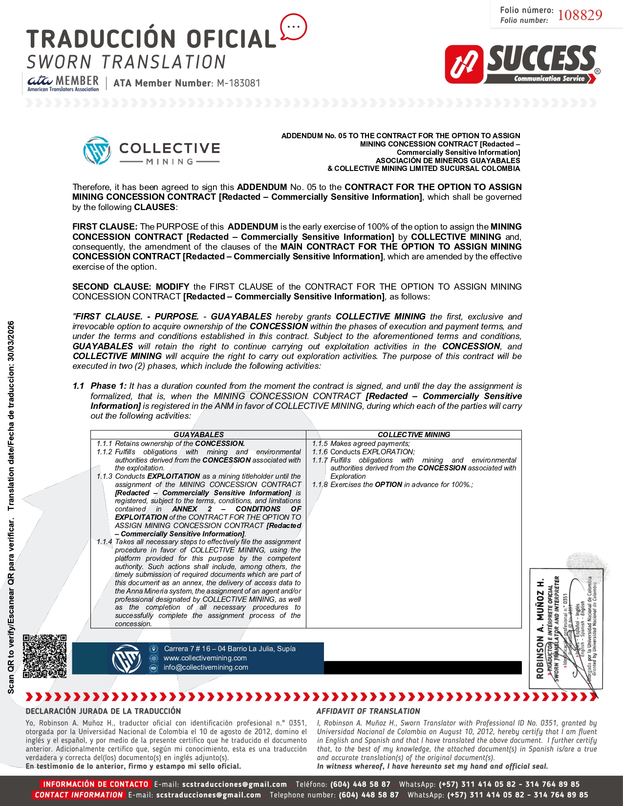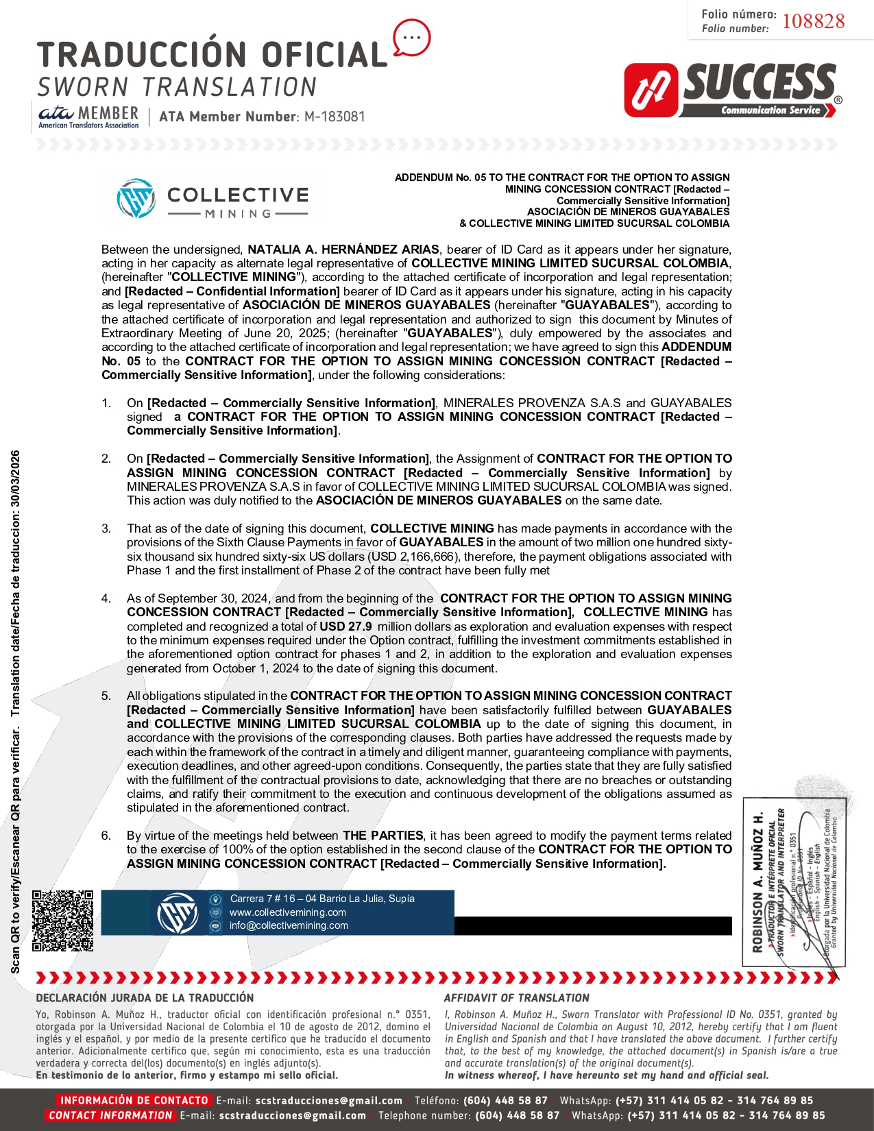 ADDENDUM No. 05 TO THE CONTRACT FOR THE OPTION TO ASSIGN MINING CONCESSION CONTRACT [Redacted – Commercially Sensitive Information] ASOCIACIÓN DE MINEROS GUAYABALES & COLLECTIVE MINING LIMITED SUCURSAL COLOMBIA Therefore, it has been agreed to sign this ADDENDUM No . 05 to the CONTRACT FOR THE OPTION TO ASSIGN MINING CONCESSION CONTRACT [Redacted – Commercially Sensitive Information] , which shall be governed by the following CLAUSES : FIRST CLAUSE : The PURPOSE of this ADDENDUM is the early exercise of 100 % of the option to assign the MINING CONCESSION CONTRACT [Redacted – Commercially Sensitive Information] by COLLECTIVE MINING and, consequently, the amendment of the clauses of the MAIN CONTRACT FOR THE OPTION TO ASSIGN MINING CONCESSION CONTRACT [Redacted – Commercially Sensitive Information] , which are amended by the effective exercise of the option . SECOND CLAUSE : MODIFY the FIRST CLAUSE of the CONTRACT FOR THE OPTION TO ASSIGN MINING CONCESSION CONTRACT [Redacted – Commercially Sensitive Information] , as follows : " FIRST CLAUSE . - PURPOSE . - GUAYABALES hereby grants COLLECTIVE MINING the first, exclusive and irrevocable option to acquire ownership of the CONCESSION within the phases of execution and payment terms, and under the terms and conditions established in this contract . Subject to the aforementioned terms and conditions, GUAYABALES will retain the right to continue carrying out exploitation activities in the CONCESSION , and COLLECTIVE MINING will acquire the right to carry out exploration activities . The purpose of this contract will be executed in two ( 2 ) phases, which include the following activities : 1 . 1 Phase 1 : It has a duration counted from the moment the contract is signed, and until the day the assignment is formalized, that is, when the MINING CONCESSION CONTRACT [Redacted – Commercially Sensitive Information] is registered in the ANM in favor of COLLECTIVE MINING, during which each of the parties will carry out the following activities : COLLECTIVE MINING GUAYABALES 5. Makes agreed payments ; 6. Conducts EXPLORATION ; 7. Fulfills obligations with mining and environmental authorities derived from the CONCESSION associated with Exploration 8. Exercises the OPTION in advance for 100 % .; 1. Retains ownership of the CONCESSION . 2. Fulfills obligations with mining and environmental authorities derived from the CONCESSION associated with the exploitation . 3. Conducts EXPLOITATION as a mining titleholder until the assignment of the MINING CONCESSION CONTRACT [Redacted – Commercially Sensitive Information] is registered, subject to the terms, conditions, and limitations contained in ANNEX 2 – CONDITIONS OF EXPLOITATION of the CONTRACT FOR THE OPTION TO ASSIGN MINING CONCESSION CONTRACT [Redacted – Commercially Sensitive Information] . 4. Takes all necessary steps to effectively file the assignment procedure in favor of COLLECTIVE MINING, using the platform provided for this purpose by the competent authority . Such actions shall include, among others, the timely submission of required documents which are part of this document as an annex, the delivery of access data to the Anna Mineria system, the assignment of an agent and/or professional designated by COLLECTIVE MINING, as well as the completion of all necessary procedures to successfully complete the assignment process of the concession . Carrera 7 # 16 – 04 Barrio La Julia, Supía www.collectivemining.com info@collectivemining.com 108829 Scan QR to verify/Escanear QR para verificar. Translation date/Fecha de traduccion: 30/03/2026