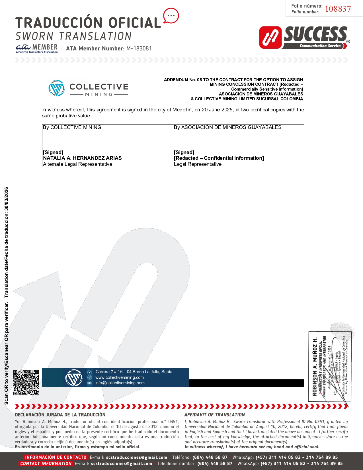 ADDENDUM No. 05 TO THE CONTRACT FOR THE OPTION TO ASSIGN MINING CONCESSION CONTRACT [Redacted – Commercially Sensitive Information] ASOCIACIÓN DE MINEROS GUAYABALES & COLLECTIVE MINING LIMITED SUCURSAL COLOMBIA In witness whereof, this agreement is signed in the city of Medellín, on 20 June 2025, in two identical copies with the same probative value. By ASOCIACIÓN DE MINEROS GUAYABALES By COLLECTIVE MINING [Signed] [Redacted – Confidential Information] Legal Representative [Signed] NATALIA A. HERNANDEZ ARIAS Alternate Legal Representative Carrera 7 # 16 – 04 Barrio La Julia, Supía www.collectivemining.com info@collectivemining.com 108837 Scan QR to verify/Escanear QR para verificar. Translation date/Fecha de traduccion: 30/03/2026