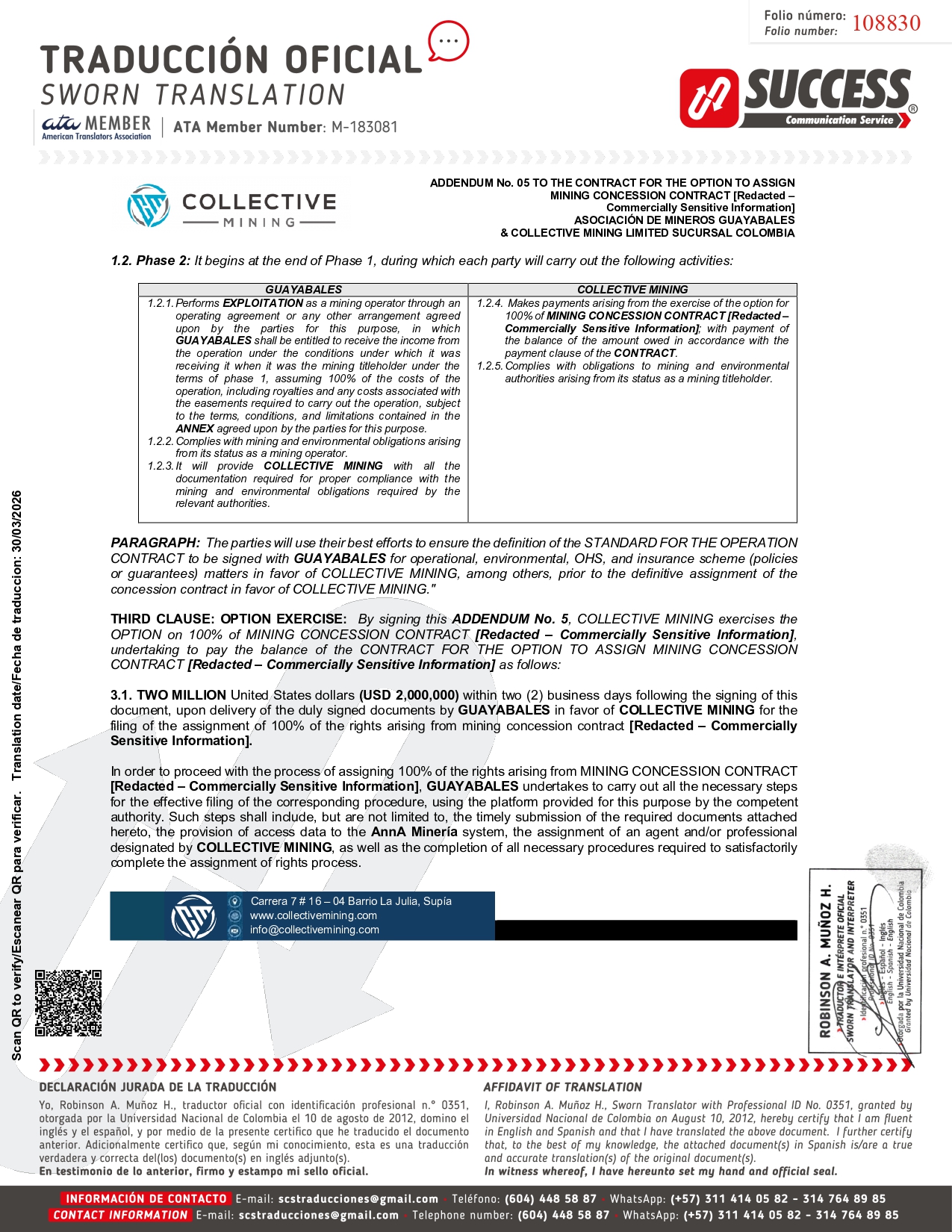 ADDENDUM No. 05 TO THE CONTRACT FOR THE OPTION TO ASSIGN MINING CONCESSION CONTRACT [Redacted – Commercially Sensitive Information] ASOCIACIÓN DE MINEROS GUAYABALES & COLLECTIVE MINING LIMITED SUCURSAL COLOMBIA 1.2. Phase 2: It begins at the end of Phase 1, during which each party will carry out the following activities: COLLECTIVE MINING GUAYABALES 4. Makes payments arising from the exercise of the option for 100% of MINING CONCESSION CONTRACT [Redacted – Commercially Sensitive Information] ; with payment of the balance of the amount owed in accordance with the payment clause of the CONTRACT . 5. Complies with obligations to mining and environmental authorities arising from its status as a mining titleholder. 1. Performs EXPLOITATION as a mining operator through an operating agreement or any other arrangement agreed upon by the parties for this purpose, in which GUAYABALES shall be entitled to receive the income from the operation under the conditions under which it was receiving it when it was the mining titleholder under the terms of phase 1 , assuming 100 % of the costs of the operation, including royalties and any costs associated with the easements required to carry out the operation, subject to the terms, conditions, and limitations contained in the ANNEX agreed upon by the parties for this purpose . 2. Complies with mining and environmental obligations arising from its status as a mining operator . 3. It will provide COLLECTIVE MINING with all the documentation required for proper compliance with the mining and environmental obligations required by the relevant authorities. PARAGRAPH : The parties will use their best efforts to ensure the definition of the STANDARD FOR THE OPERATION CONTRACT to be signed with GUAYABALES for operational, environmental, OHS, and insurance scheme (policies or guarantees) matters in favor of COLLECTIVE MINING, among others, prior to the definitive assignment of the concession contract in favor of COLLECTIVE MINING . " THIRD CLAUSE : OPTION EXERCISE : By signing this ADDENDUM No . 5 , COLLECTIVE MINING exercises the OPTION on 100 % of MINING CONCESSION CONTRACT [Redacted – Commercially Sensitive Information] , undertaking to pay the balance of the CONTRACT FOR THE OPTION TO ASSIGN MINING CONCESSION CONTRACT [Redacted – Commercially Sensitive Information] as follows : 3 . 1 . TWO MILLION United States dollars (USD 2 , 000 , 000 ) within two ( 2 ) business days following the signing of this document, upon delivery of the duly signed documents by GUAYABALES in favor of COLLECTIVE MINING for the filing of the assignment of 100 % of the rights arising from mining concession contract [Redacted – Commercially Sensitive Information] . In order to proceed with the process of assigning 100 % of the rights arising from MINING CONCESSION CONTRACT [Redacted – Commercially Sensitive Information] , GUAYABALES undertakes to carry out all the necessary steps for the effective filing of the corresponding procedure, using the platform provided for this purpose by the competent authority . Such steps shall include, but are not limited to, the timely submission of the required documents attached hereto, the provision of access data to the AnnA Minería system, the assignment of an agent and/or professional designated by COLLECTIVE MINING , as well as the completion of all necessary procedures required to satisfactorily complete the assignment of rights process . Carrera 7 # 16 – 04 Barrio La Julia, Supía www.collectivemining.com info@collectivemining.com 108830 Scan QR to verify/Escanear QR para verificar. Translation date/Fecha de traduccion: 30/03/2026