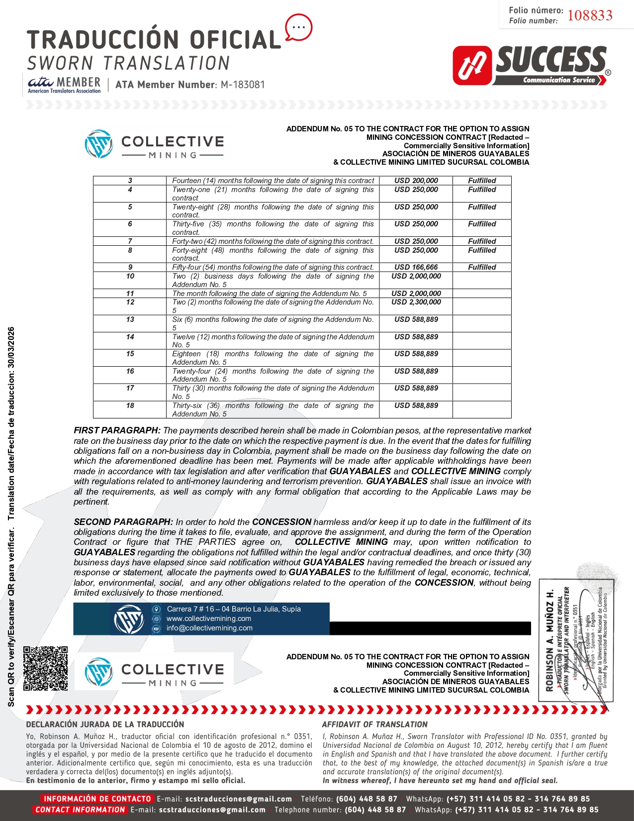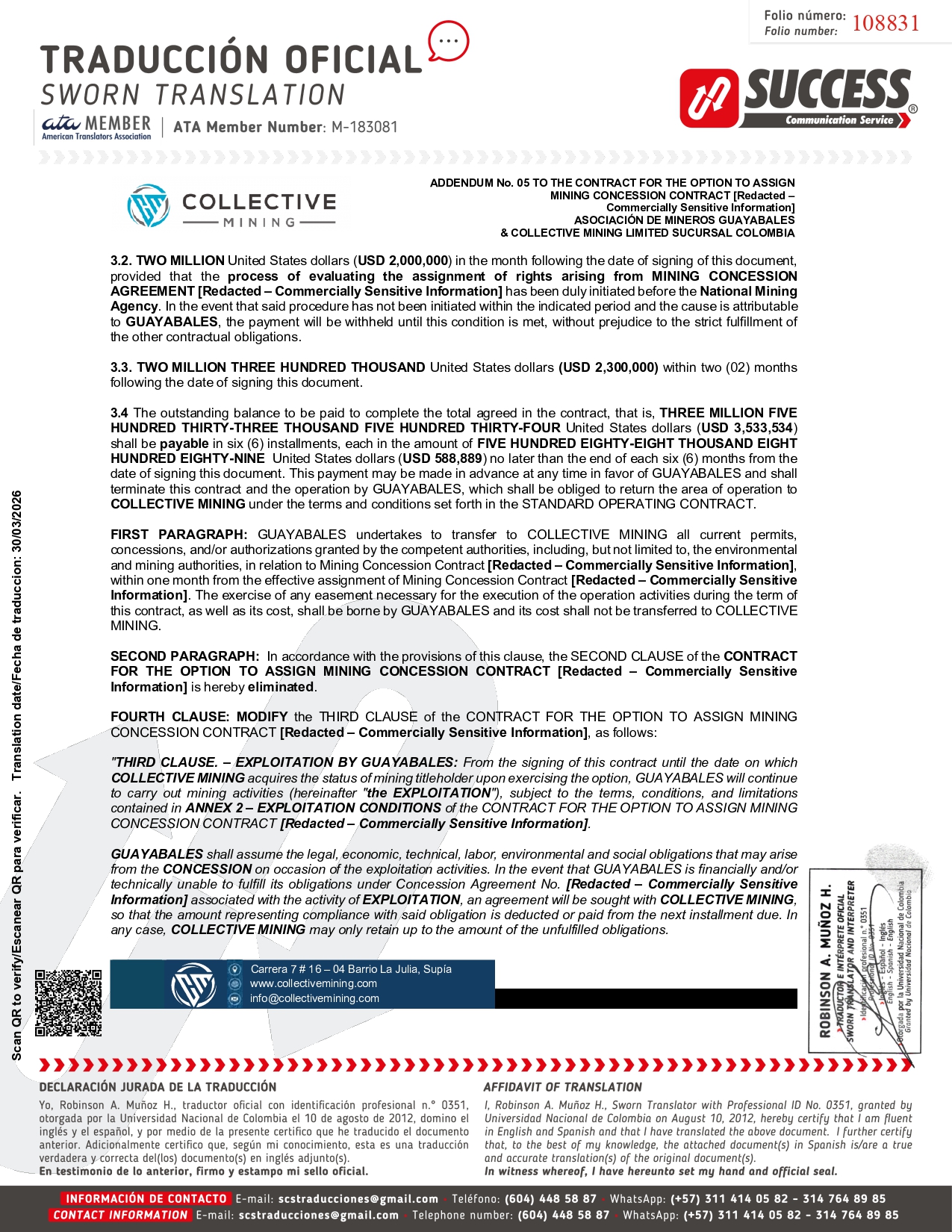 ADDENDUM No. 05 TO THE CONTRACT FOR THE OPTION TO ASSIGN MINING CONCESSION CONTRACT [Redacted – Commercially Sensitive Information] ASOCIACIÓN DE MINEROS GUAYABALES & COLLECTIVE MINING LIMITED SUCURSAL COLOMBIA 3 . 2 . TWO MILLION United States dollars ( USD 2 , 000 , 000 ) in the month following the date of signing of this document, provided that the process of evaluating the assignment of rights arising from MINING CONCESSION AGREEMENT [Redacted – Commercially Sensitive Information] has been duly initiated before the National Mining Agency . In the event that said procedure has not been initiated within the indicated period and the cause is attributable to GUAYABALES , the payment will be withheld until this condition is met, without prejudice to the strict fulfillment of the other contractual obligations . 3 . 3 . TWO MILLION THREE HUNDRED THOUSAND United States dollars (USD 2 , 300 , 000 ) within two ( 02 ) months following the date of signing this document . 3 . 4 The outstanding balance to be paid to complete the total agreed in the contract, that is, THREE MILLION FIVE HUNDRED THIRTY - THREE THOUSAND FIVE HUNDRED THIRTY - FOUR United States dollars ( USD 3 , 533 , 534 ) shall be payable in six ( 6 ) installments, each in the amount of FIVE HUNDRED EIGHTY - EIGHT THOUSAND EIGHT HUNDRED EIGHTY - NINE United States dollars ( USD 588 , 889 ) no later than the end of each six ( 6 ) months from the date of signing this document . This payment may be made in advance at any time in favor of GUAYABALES and shall terminate this contract and the operation by GUAYABALES, which shall be obliged to return the area of operation to COLLECTIVE MINING under the terms and conditions set forth in the STANDARD OPERATING CONTRACT . FIRST PARAGRAPH : GUAYABALES undertakes to transfer to COLLECTIVE MINING all current permits, concessions, and/or authorizations granted by the competent authorities, including, but not limited to, the environmental and mining authorities, in relation to Mining Concession Contract [Redacted – Commercially Sensitive Information] , within one month from the effective assignment of Mining Concession Contract [Redacted – Commercially Sensitive Information] . The exercise of any easement necessary for the execution of the operation activities during the term of this contract, as well as its cost, shall be borne by GUAYABALES and its cost shall not be transferred to COLLECTIVE MINING . SECOND PARAGRAPH : In accordance with the provisions of this clause, the SECOND CLAUSE of the CONTRACT FOR THE OPTION TO ASSIGN MINING CONCESSION CONTRACT [Redacted – Commercially Sensitive Information] is hereby eliminated . FOURTH CLAUSE : MODIFY the THIRD CLAUSE of the CONTRACT FOR THE OPTION TO ASSIGN MINING CONCESSION CONTRACT [Redacted – Commercially Sensitive Information] , as follows : " THIRD CLAUSE . – EXPLOITATION BY GUAYABALES : From the signing of this contract until the date on which COLLECTIVE MINING acquires the status of mining titleholder upon exercising the option, GUAYABALES will continue to carry out mining activities (hereinafter " the EXPLOITATION "), subject to the terms, conditions, and limitations contained in ANNEX 2 – EXPLOITATION CONDITIONS of the CONTRACT FOR THE OPTION TO ASSIGN MINING CONCESSION CONTRACT [Redacted – Commercially Sensitive Information] . GUAYABALES shall assume the legal, economic, technical, labor, environmental and social obligations that may arise from the CONCESSION on occasion of the exploitation activities . In the event that GUAYABALES is financially and/or technically unable to fulfill its obligations under Concession Agreement No . [Redacted – Commercially Sensitive Information] associated with the activity of EXPLOITATION , an agreement will be sought with COLLECTIVE MINING , so that the amount representing compliance with said obligation is deducted or paid from the next installment due . In any case, COLLECTIVE MINING may only retain up to the amount of the unfulfilled obligations . Carrera 7 # 16 – 04 Barrio La Julia, Supía www.collectivemining.com info@collectivemining.com 108831 Scan QR to verify/Escanear QR para verificar. Translation date/Fecha de traduccion: 30/03/2026