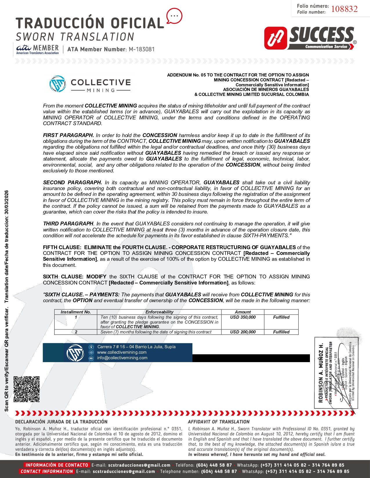 ADDENDUM No. 05 TO THE CONTRACT FOR THE OPTION TO ASSIGN MINING CONCESSION CONTRACT [Redacted – Commercially Sensitive Information] ASOCIACIÓN DE MINEROS GUAYABALES & COLLECTIVE MINING LIMITED SUCURSAL COLOMBIA From the moment COLLECTIVE MINING acquires the status of mining titleholder and until full payment of the contract value within the established terms (or in advance), GUAYABALES will carry out the exploitation in its capacity as MINING OPERATOR of COLLECTIVE MINING, under the terms and conditions defined in the OPERATING CONTRACT STANDARD . FIRST PARAGRAPH . In order to hold the CONCESSION harmless and/or keep it up to date in the fulfillment of its obligations during the term of the CONTRACT, COLLECTIVE MINING may, upon written notification to GUAYABALES regarding the obligations not fulfilled within the legal and/or contractual deadlines, and once thirty ( 30 ) business days have elapsed since said notification without GUAYABALES having remedied the breach or issued any response or statement, allocate the payments owed to GUAYABALES to the fulfillment of legal, economic, technical, labor, environmental, social, and any other obligations related to the operation of the CONCESSION , without being limited exclusively to those mentioned . SECOND PARAGRAPH . In its capacity as MINING OPERATOR, GUAYABALES shall take out a civil liability insurance policy, covering both contractual and non - contractual liability, in favor of COLLECTIVE MINING for an amount to be defined in the operating agreement, within 30 business days following the registration of the assignment in favor of COLLECTIVE MINING in the mining registry . This policy must remain in force throughout the entire term of the contract . If the policy cannot be issued, a sum will be retained from the payments made to GUAYABALES as a guarantee, which can cover the risks that the policy is intended to insure . THIRD PARAGRAPH . In the event that GUAYABALES considers not continuing to manage the operation, it will give written notification to COLLECTIVE MINING at least three ( 3 ) months in advance of the operation closure date, this condition will not accelerate the schedule for payments in its favor established in clause SIXTH - PAYMENTS . " FIFTH CLAUSE : ELIMINATE the FOURTH CLAUSE . - CORPORATE RESTRUCTURING OF GUAYABALES of the CONTRACT FOR THE OPTION TO ASSIGN MINING CONCESSION CONTRACT [Redacted – Commercially Sensitive Information] , as a result of the exercise of 100% of the option by COLLECTIVE MINING as established in this document. SIXTH CLAUSE: MODIFY the SIXTH CLAUSE of the CONTRACT FOR THE OPTION TO ASSIGN MINING CONCESSION CONTRACT [Redacted – Commercially Sensitive Information] , as follows : " SIXTH CLAUSE . – PAYMENTS : The payments that GUAYABALES will receive from COLLECTIVE MINING for this contract, the OPTION and eventual transfer of ownership of the CONCESSION , will be made in the following manner : Amount Enforceability Installment No. Fulfilled USD 350,000 Ten ( 10 ) business days following the signing of this contract, after granting the pledge guarantee on the CONCESSION in favor of COLLECTIVE MINING . 1 Fulfilled USD 200,000 Seven (7) months following the date of signing this contract 2 Carrera 7 # 16 – 04 Barrio La Julia, Supía www.collectivemining.com info@collectivemining.com 108832 Scan QR to verify/Escanear QR para verificar. Translation date/Fecha de traduccion: 30/03/2026