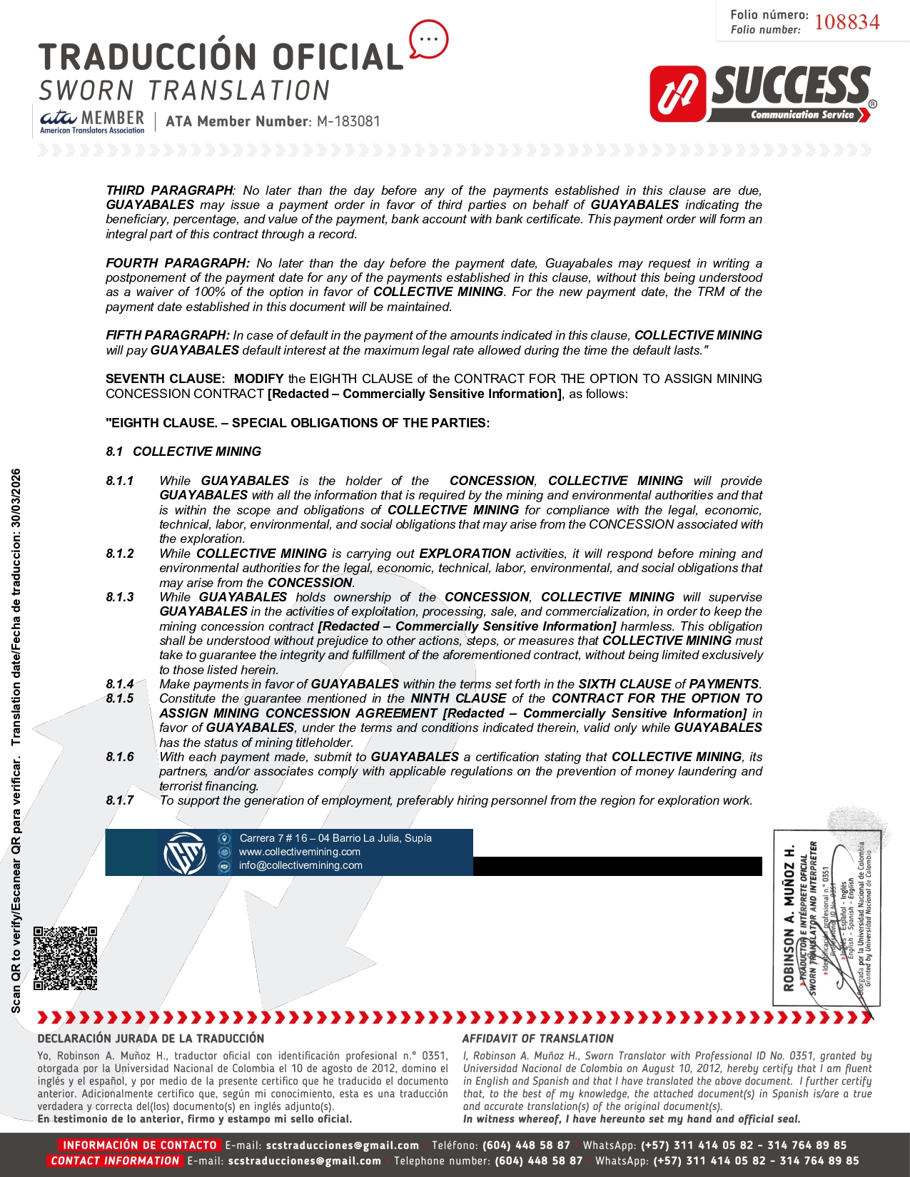 THIRD PARAGRAPH : No later than the day before any of the payments established in this clause are due, GUAYABALES may issue a payment order in favor of third parties on behalf of GUAYABALES indicating the beneficiary, percentage, and value of the payment, bank account with bank certificate . This payment order will form an integral part of this contract through a record . FOURTH PARAGRAPH : No later than the day before the payment date, Guayabales may request in writing a postponement of the payment date for any of the payments established in this clause, without this being understood as a waiver of 100 % of the option in favor of COLLECTIVE MINING . For the new payment date, the TRM of the payment date established in this document will be maintained . FIFTH PARAGRAPH: In case of default in the payment of the amounts indicated in this clause, COLLECTIVE MINING will pay GUAYABALES default interest at the maximum legal rate allowed during the time the default lasts . " SEVENTH CLAUSE: MODIFY the EIGHTH CLAUSE of the CONTRACT FOR THE OPTION TO ASSIGN MINING CONCESSION CONTRACT [Redacted – Commercially Sensitive Information] , as follows: "EIGHTH CLAUSE. – SPECIAL OBLIGATIONS OF THE PARTIES: 1. COLLECTIVE MINING 1. While GUAYABALES is the holder of the CONCESSION , COLLECTIVE MINING will provide GUAYABALES with all the information that is required by the mining and environmental authorities and that 8.1.2 8.1.3 8.1.4 8.1.5 8.1.6 8.1.7 is within the scope and obligations of COLLECTIVE MINING for compliance with the legal, economic, technical, labor, environmental, and social obligations that may arise from the CONCESSION associated with the exploration . While COLLECTIVE MINING is carrying out EXPLORATION activities, it will respond before mining and environmental authorities for the legal, economic, technical, labor, environmental, and social obligations that may arise from the CONCESSION . While GUAYABALES holds ownership of the CONCESSION , COLLECTIVE MINING will supervise GUAYABALES in the activities of exploitation, processing, sale, and commercialization, in order to keep the mining concession contract [Redacted – Commercially Sensitive Information] harmless . This obligation shall be understood without prejudice to other actions, steps, or measures that COLLECTIVE MINING must take to guarantee the integrity and fulfillment of the aforementioned contract, without being limited exclusively to those listed herein . Make payments in favor of GUAYABALES within the terms set forth in the SIXTH CLAUSE of PAYMENTS . Constitute the guarantee mentioned in the NINTH CLAUSE of the CONTRACT FOR THE OPTION TO ASSIGN MINING CONCESSION AGREEMENT [Redacted – Commercially Sensitive Information] in favor of GUAYABALES , under the terms and conditions indicated therein, valid only while GUAYABALES has the status of mining titleholder . With each payment made, submit to GUAYABALES a certification stating that COLLECTIVE MINING , its partners, and/or associates comply with applicable regulations on the prevention of money laundering and terrorist financing . To support the generation of employment, preferably hiring personnel from the region for exploration work . Carrera 7 # 16 – 04 Barrio La Julia, Supía www.collectivemining.com info@collectivemining.com 108834 Scan QR to verify/Escanear QR para verificar. Translation date/Fecha de traduccion: 30/03/2026