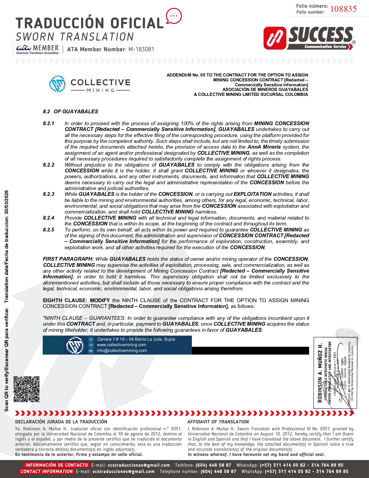 ADDENDUM No. 05 TO THE CONTRACT FOR THE OPTION TO ASSIGN MINING CONCESSION CONTRACT [Redacted – Commercially Sensitive Information] ASOCIACIÓN DE MINEROS GUAYABALES & COLLECTIVE MINING LIMITED SUCURSAL COLOMBIA 8.2 OF GUAYABALES 8.2.1 8.2.2 8.2.3 8.2.4 8.2.5 In order to proceed with the process of assigning 100 % of the rights arising from MINING CONCESSION CONTRACT [Redacted – Commercially Sensitive Information] , GUAYABALES undertakes to carry out all the necessary steps for the effective filing of the corresponding procedure, using the platform provided for this purpose by the competent authority . Such steps shall include, but are not limited to, the timely submission of the required documents attached hereto, the provision of access data to the AnnA Minería system, the assignment of an agent and/or professional designated by COLLECTIVE MINING , as well as the completion of all necessary procedures required to satisfactorily complete the assignment of rights process . Without prejudice to the obligations of GUAYABALES to comply with the obligations arising from the CONCESSION while it is the holder, it shall grant COLLECTIVE MINING or whoever it designates, the powers, authorizations, and any other instruments, documents, and information that COLLECTIVE MINING deems necessary to carry out the legal and administrative representation of the CONCESSION before the administrative and judicial authorities . While GUAYABALES is the holder of the CONCESSION , or is carrying out EXPLOITATION activities, it shall be liable to the mining and environmental authorities, among others, for any legal, economic, technical, labor, environmental, and social obligations that may arise from the CONCESSION associated with exploitation and commercialization, and shall hold COLLECTIVE MINING harmless. Provide COLLECTIVE MINING with all technical and legal information, documents, and material related to the CONCESSION that is within its scope, at the beginning of the contract and throughout its term. To perform, on its own behalf, all acts within its power and required to guarantee COLLECTIVE MINING as of the signing of this document, the administration and supervision of CONCESSION CONTRACT [Redacted – Commercially Sensitive Information] for the performance of exploration, construction, assembly, and exploitation work, and all other activities required for the execution of the CONCESSION . FIRST PARAGRAPH : While GUAYABALES holds the status of owner and/or mining operator of the CONCESSION , COLLECTIVE MINING may supervise the activities of exploitation, processing, sale, and commercialization, as well as any other activity related to the development of Mining Concession Contract [Redacted – Commercially Sensitive Information] , in order to hold it harmless . This supervisory obligation shall not be limited exclusively to the aforementioned activities, but shall include all those necessary to ensure proper compliance with the contract and the legal, technical, economic, environmental, labor, and social obligations arising therefrom . EIGHTH CLAUSE : MODIFY the NINTH CLAUSE of the CONTRACT FOR THE OPTION TO ASSIGN MINING CONCESSION CONTRACT [Redacted – Commercially Sensitive Information] , as follows : "NINTH CLAUSE – GUARANTEES : In order to guarantee compliance with any of the obligations incumbent upon it under this CONTRACT and, in particular, payment to GUAYABALES , once COLLECTIVE MINING acquires the status of mining titleholder, it undertakes to provide the following guarantees in favor of GUAYABALES : Carrera 7 # 16 – 04 Barrio La Julia, Supía www.collectivemining.com info@collectivemining.com 108835 Scan QR to verify/Escanear QR para verificar. Translation date/Fecha de traduccion: 30/03/2026