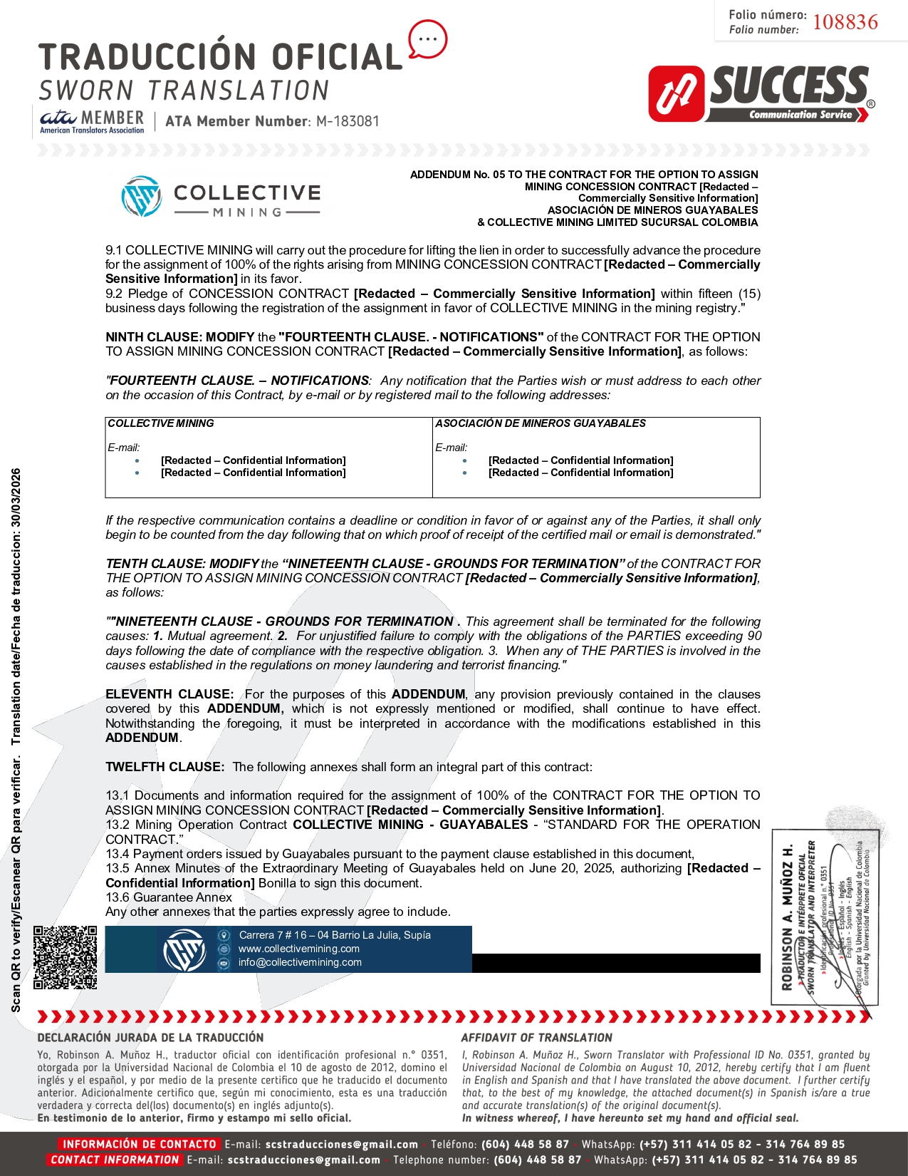 ADDENDUM No. 05 TO THE CONTRACT FOR THE OPTION TO ASSIGN MINING CONCESSION CONTRACT [Redacted – Commercially Sensitive Information] ASOCIACIÓN DE MINEROS GUAYABALES & COLLECTIVE MINING LIMITED SUCURSAL COLOMBIA 1. COLLECTIVE MINING will carry out the procedure for lifting the lien in order to successfully advance the procedure for the assignment of 100 % of the rights arising from MINING CONCESSION CONTRACT [Redacted – Commercially Sensitive Information] in its favor . 2. Pledge of CONCESSION CONTRACT [Redacted – Commercially Sensitive Information] within fifteen ( 15 ) business days following the registration of the assignment in favor of COLLECTIVE MINING in the mining registry . " NINTH CLAUSE: MODIFY the "FOURTEENTH CLAUSE. - NOTIFICATIONS" of the CONTRACT FOR THE OPTION TO ASSIGN MINING CONCESSION CONTRACT [Redacted – Commercially Sensitive Information] , as follows: " FOURTEENTH CLAUSE. – NOTIFICATIONS : Any notification that the Parties wish or must address to each other on the occasion of this Contract, by e - mail or by registered mail to the following addresses: COLLECTIVE MINING E - mail: [Redacted – Confidential Information] [Redacted – Confidential Information] ASOCIACIÓN DE MINEROS GUAYABALES E - mail: [Redacted – Confidential Information] [Redacted – Confidential Information] If the respective communication contains a deadline or condition in favor of or against any of the Parties, it shall only begin to be counted from the day following that on which proof of receipt of the certified mail or email is demonstrated . " TENTH CLAUSE : MODIFY the “NINETEENTH CLAUSE - GROUNDS FOR TERMINATION” of the CONTRACT FOR THE OPTION TO ASSIGN MINING CONCESSION CONTRACT [Redacted – Commercially Sensitive Information] , as follows : " "NINETEENTH CLAUSE - GROUNDS FOR TERMINATION . This agreement shall be terminated for the following causes : 1 . Mutual agreement . 2 . For unjustified failure to comply with the obligations of the PARTIES exceeding 90 days following the date of compliance with the respective obligation . 3 . When any of THE PARTIES is involved in the causes established in the regulations on money laundering and terrorist financing . " ELEVENTH CLAUSE : For the purposes of this ADDENDUM , any provision previously contained in the clauses covered by this ADDENDUM, which is not expressly mentioned or modified, shall continue to have effect . Notwithstanding the foregoing, it must be interpreted in accordance with the modifications established in this ADDENDUM . TWELFTH CLAUSE: The following annexes shall form an integral part of this contract: 1. Documents and information required for the assignment of 100% of the CONTRACT FOR THE OPTION TO ASSIGN MINING CONCESSION CONTRACT [Redacted – Commercially Sensitive Information] . 2. Mining Operation Contract COLLECTIVE MINING - GUAYABALES - “STANDARD FOR THE OPERATION CONTRACT.” 4. Payment orders issued by Guayabales pursuant to the payment clause established in this document, 5. Annex Minutes of the Extraordinary Meeting of Guayabales held on June 20, 2025, authorizing [Redacted – Confidential Information] Bonilla to sign this document. 6. Guarantee Annex Any other annexes that the parties expressly agree to include. Carrera 7 # 16 – 04 Barrio La Julia, Supía www.collectivemining.com info@collectivemining.com 108836 Scan QR to verify/Escanear QR para verificar. Translation date/Fecha de traduccion: 30/03/2026