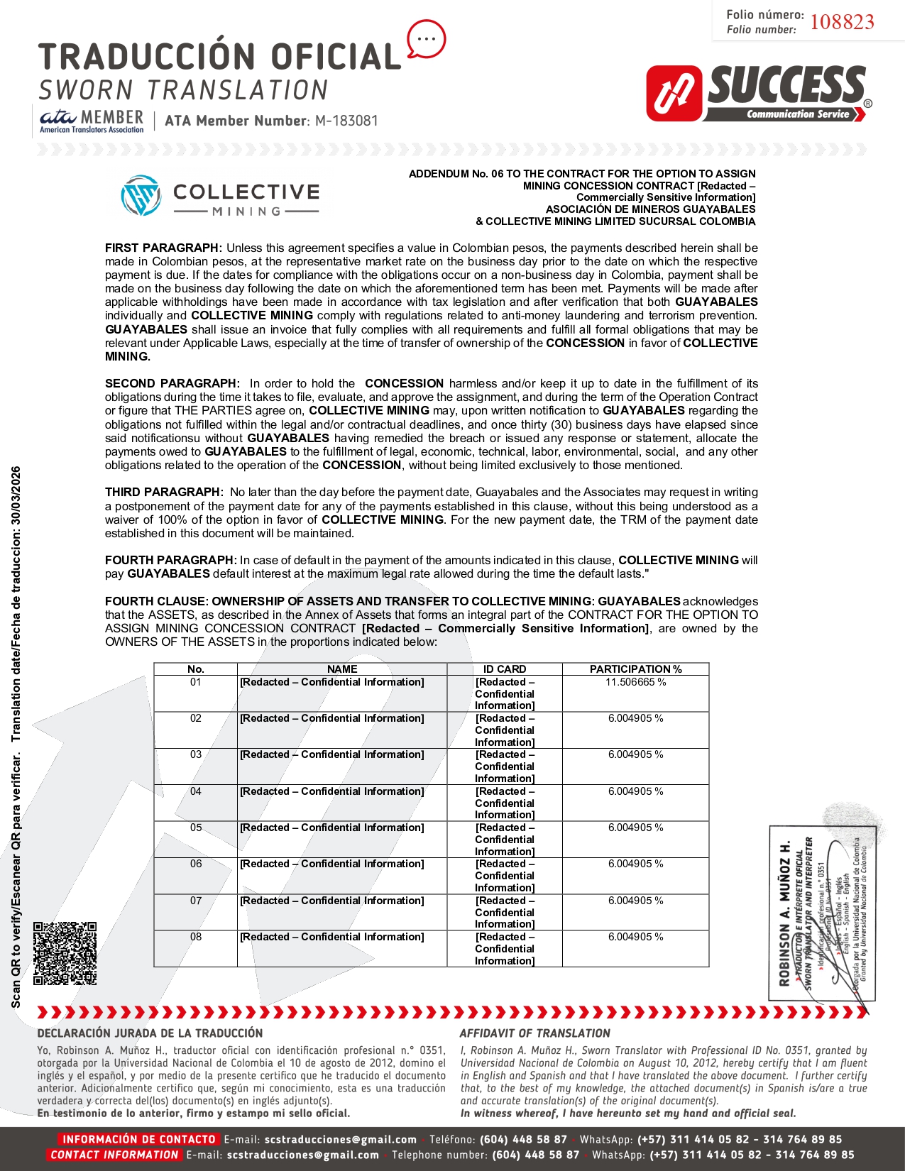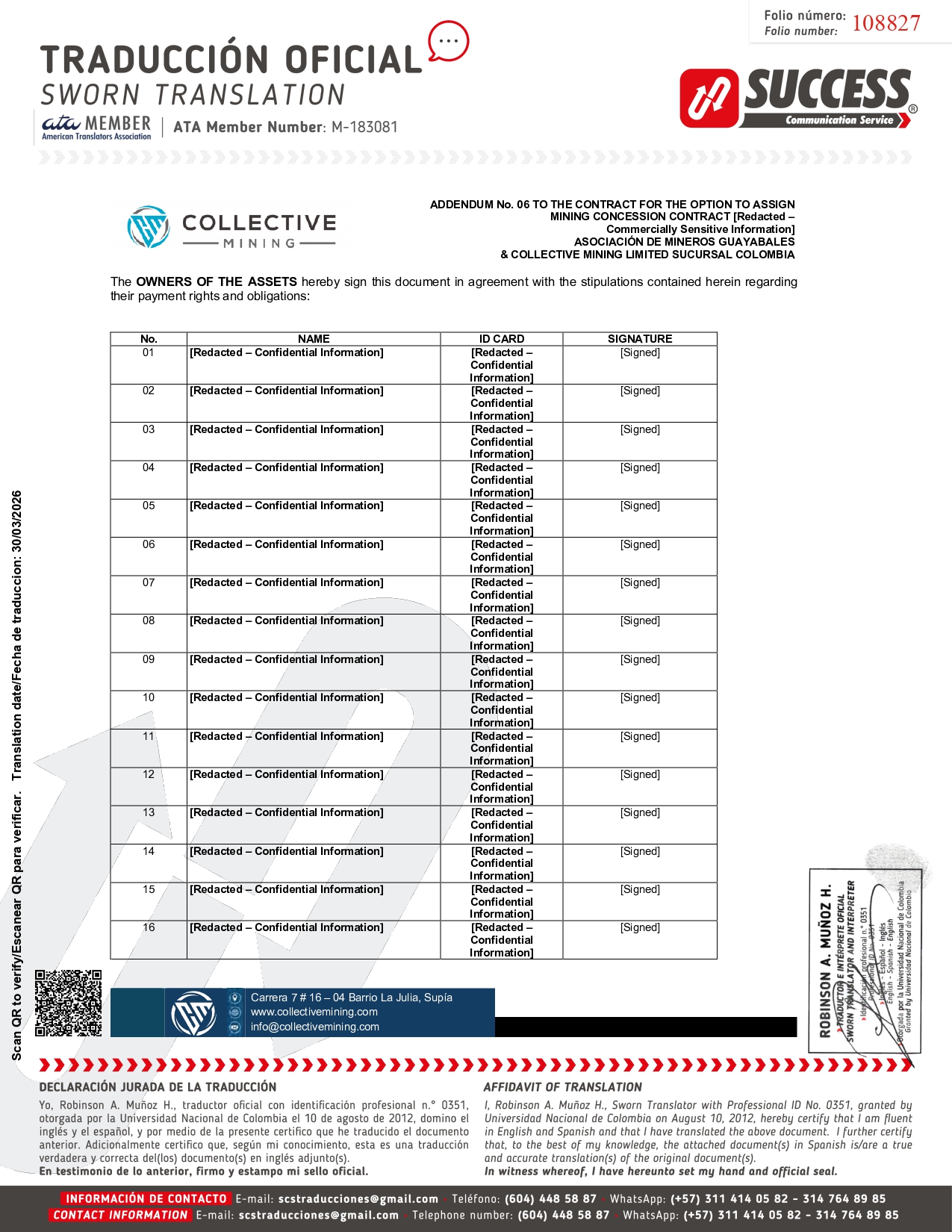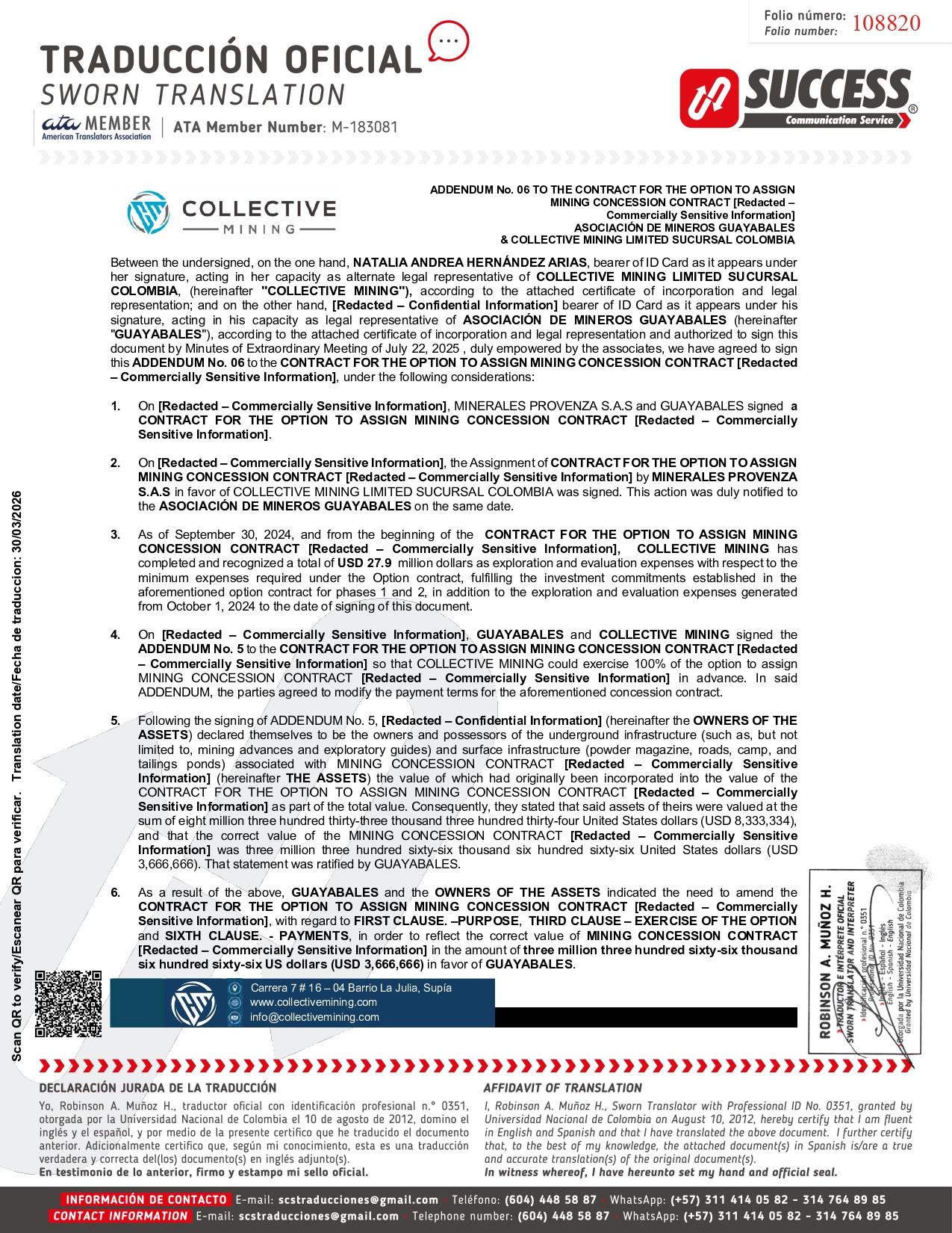 ADDENDUM No. 06 TO THE CONTRACT FOR THE OPTION TO ASSIGN MINING CONCESSION CONTRACT [Redacted – Commercially Sensitive Information] ASOCIACIÓN DE MINEROS GUAYABALES & COLLECTIVE MINING LIMITED SUCURSAL COLOMBIA The OWNERS OF THE ASSETS hereby sign this document in agreement with the stipulations contained herein regarding their payment rights and obligations: SIGNATURE ID CARD NAME No. [Signed] [Redacted – Confidential Information] [Redacted – Confidential Information] 01 [Signed] [Redacted – Confidential Information] [Redacted – Confidential Information] 02 [Signed] [Redacted – Confidential Information] [Redacted – Confidential Information] 03 [Signed] [Redacted – Confidential Information] [Redacted – Confidential Information] 04 [Signed] [Redacted – Confidential Information] [Redacted – Confidential Information] 05 [Signed] [Redacted – Confidential Information] [Redacted – Confidential Information] 06 [Signed] [Redacted – Confidential Information] [Redacted – Confidential Information] 07 [Signed] [Redacted – Confidential Information] [Redacted – Confidential Information] 08 [Signed] [Redacted – Confidential Information] [Redacted – Confidential Information] 09 [Signed] [Redacted – Confidential Information] [Redacted – Confidential Information] 10 [Signed] [Redacted – Confidential Information] [Redacted – Confidential Information] 11 [Signed] [Redacted – Confidential Information] [Redacted – Confidential Information] 12 [Signed] [Redacted – Confidential Information] [Redacted – Confidential Information] 13 [Signed] [Redacted – Confidential Information] [Redacted – Confidential Information] 14 [Signed] [Redacted – Confidential Information] [Redacted – Confidential Information] 15 [Signed] [Redacted – Confidential Information] [Redacted – Confidential Information] 16 Carrera 7 # 16 – 04 Barrio La Julia, Supía www.collectivemining.com info@collectivemining.com 108827 Scan QR to verify/Escanear QR para verificar. Translation date/Fecha de traduccion: 30/03/2026