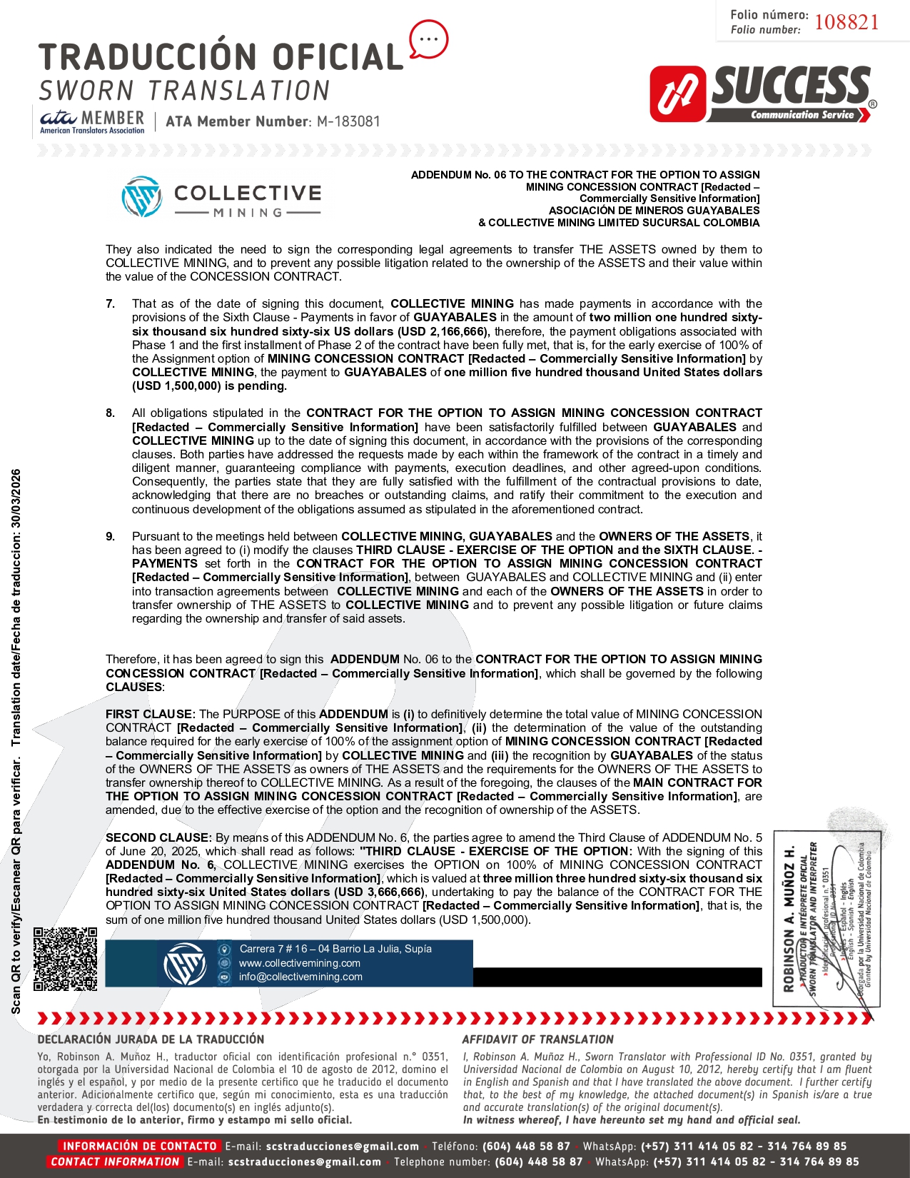 ADDENDUM No. 06 TO THE CONTRACT FOR THE OPTION TO ASSIGN MINING CONCESSION CONTRACT [Redacted – Commercially Sensitive Information] ASOCIACIÓN DE MINEROS GUAYABALES & COLLECTIVE MINING LIMITED SUCURSAL COLOMBIA FIRST PARAGRAPH : Unless this agreement specifies a value in Colombian pesos, the payments described herein shall be made in Colombian pesos, at the representative market rate on the business day prior to the date on which the respective payment is due . If the dates for compliance with the obligations occur on a non - business day in Colombia, payment shall be made on the business day following the date on which the aforementioned term has been met . Payments will be made after applicable withholdings have been made in accordance with tax legislation and after verification that both GUAYABALES individually and COLLECTIVE MINING comply with regulations related to anti - money laundering and terrorism prevention . GUAYABALES shall issue an invoice that fully complies with all requirements and fulfill all formal obligations that may be relevant under Applicable Laws, especially at the time of transfer of ownership of the CONCESSION in favor of COLLECTIVE MINING . SECOND PARAGRAPH : In order to hold the CONCESSION harmless and/or keep it up to date in the fulfillment of its obligations during the time it takes to file, evaluate, and approve the assignment, and during the term of the Operation Contract or figure that THE PARTIES agree on, COLLECTIVE MINING may, upon written notification to GUAYABALES regarding the obligations not fulfilled within the legal and/or contractual deadlines, and once thirty ( 30 ) business days have elapsed since said notificationsu without GUAYABALES having remedied the breach or issued any response or statement, allocate the payments owed to GUAYABALES to the fulfillment of legal, economic, technical, labor, environmental, social, and any other obligations related to the operation of the CONCESSION , without being limited exclusively to those mentioned . THIRD PARAGRAPH : No later than the day before the payment date, Guayabales and the Associates may request in writing a postponement of the payment date for any of the payments established in this clause, without this being understood as a waiver of 100 % of the option in favor of COLLECTIVE MINING . For the new payment date, the TRM of the payment date established in this document will be maintained . FOURTH PARAGRAPH : In case of default in the payment of the amounts indicated in this clause, COLLECTIVE MINING will pay GUAYABALES default interest at the maximum legal rate allowed during the time the default lasts . " FOURTH CLAUSE: OWNERSHIP OF ASSETS AND TRANSFER TO COLLECTIVE MINING: GUAYABALES acknowledges that the ASSETS, as described in the Annex of Assets that forms an integral part of the CONTRACT FOR THE OPTION TO ASSIGN MINING CONCESSION CONTRACT [Redacted – Commercially Sensitive Information] , are owned by the OWNERS OF THE ASSETS in the proportions indicated below : PARTICIPATION % ID CARD NAME No. 11.506665 % [Redacted – Confidential Information] [Redacted – Confidential Information] 01 6.004905 % [Redacted – Confidential Information] [Redacted – Confidential Information] 02 6.004905 % [Redacted – Confidential Information] [Redacted – Confidential Information] 03 6.004905 % [Redacted – Confidential Information] [Redacted – Confidential Information] 04 6.004905 % [Redacted – Confidential Information] [Redacted – Confidential Information] 05 6.004905 % [Redacted – Confidential Information] [Redacted – Confidential Information] 06 6.004905 % [Redacted – Confidential Information] [Redacted – Confidential Information] 07 6.004905 % [Redacted – Confidential Information] [Redacted – Confidential Information] 08 108823 Scan QR to verify/Escanear QR para verificar. Translation date/Fecha de traduccion: 30/03/2026