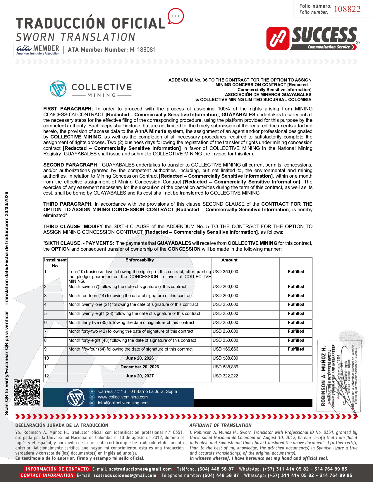 ADDENDUM No. 06 TO THE CONTRACT FOR THE OPTION TO ASSIGN MINING CONCESSION CONTRACT [Redacted – Commercially Sensitive Information] ASOCIACIÓN DE MINEROS GUAYABALES & COLLECTIVE MINING LIMITED SUCURSAL COLOMBIA FIRST PARAGRAPH : In order to proceed with the process of assigning 100 % of the rights arising from MINING CONCESSION CONTRACT [Redacted – Commercially Sensitive Information] , GUAYABALES undertakes to carry out all the necessary steps for the effective filing of the corresponding procedure, using the platform provided for this purpose by the competent authority . Such steps shall include, but are not limited to, the timely submission of the required documents attached hereto, the provision of access data to the AnnA Minería system, the assignment of an agent and/or professional designated by COLLECTIVE MINING , as well as the completion of all necessary procedures required to satisfactorily complete the assignment of rights process . Two ( 2 ) business days following the registration of the transfer of rights under mining concession contract [Redacted – Commercially Sensitive Information] in favor of COLLECTIVE MINING in the National Mining Registry, GUAYABALES shall issue and submit to COLLECTIVE MINING the invoice for this item . SECOND PARAGRAPH : GUAYABALES undertakes to transfer to COLLECTIVE MINING all current permits, concessions, and/or authorizations granted by the competent authorities, including, but not limited to, the environmental and mining authorities, in relation to Mining Concession Contract [Redacted – Commercially Sensitive Information] , within one month from the effective assignment of Mining Concession Contract [Redacted – Commercially Sensitive Information] . The exercise of any easement necessary for the execution of the operation activities during the term of this contract, as well as its cost, shall be borne by GUAYABALES and its cost shall not be transferred to COLLECTIVE MINING . THIRD PARAGRAPH . In accordance with the provisions of this clause SECOND CLAUSE of the CONTRACT FOR THE OPTION TO ASSIGN MINING CONCESSION CONTRACT [Redacted – Commercially Sensitive Information] is hereby eliminated" THIRD CLAUSE : MODIFY the SIXTH CLAUSE of the ADDENDUM No . 5 TO THE CONTRACT FOR THE OPTION TO ASSIGN MINING CONCESSION CONTRACT [Redacted – Commercially Sensitive Information] , as follows : " SIXTH CLAUSE . - PAYMENTS : The payments that GUAYABALES will receive from COLLECTIVE MINING for this contract, the OPTION and consequent transfer of ownership of the CONCESSION will be made in the following manner : Amount Enforceability Installment No. Fulfilled USD 350,000 Ten ( 10 ) business days following the signing of this contract, after granting the pledge guarantee on the CONCESSION in favor of COLLECTIVE MINING . 1 Fulfilled USD 200,000 Month seven (7) following the date of signature of this contract 2 Fulfilled USD 200,000 Month fourteen (14) following the date of signature of this contract 3 Fulfilled USD 250,000 Month twenty - one (21) following the date of signature of this contract 4 Fulfilled USD 250,000 Month twenty - eight (28) following the date of signature of this contract 5 Fulfilled USD 250,000 Month thirty - five (35) following the date of signature of this contract 6 Fulfilled USD 250,000 Month forty - two (42) following the date of signature of this contract 7 Fulfilled USD 250,000 Month forty - eight (48) following the date of signature of this contract 8 Fulfilled USD 166,666 Month fifty - four (54) following the date of signature of this contract. 9 USD 588,889 June 20, 2026 10 USD 588,889 December 20, 2026 11 USD 322,222 June 20, 2027 12 Carrera 7 # 16 – 04 Barrio La Julia, Supía www.collectivemining.com info@collectivemining.com 108822 Scan QR to verify/Escanear QR para verificar. Translation date/Fecha de traduccion: 30/03/2026