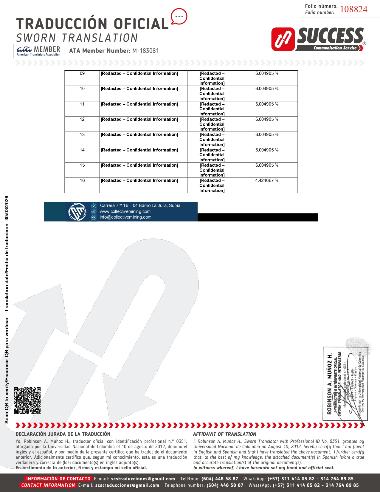 6.004905 % [Redacted – Confidential Information] [Redacted – Confidential Information] 09 6.004905 % [Redacted – Confidential Information] [Redacted – Confidential Information] 10 6.004905 % [Redacted – Confidential Information] [Redacted – Confidential Information] 11 6.004905 % [Redacted – Confidential Information] [Redacted – Confidential Information] 12 6.004905 % [Redacted – Confidential Information] [Redacted – Confidential Information] 13 6.004905 % [Redacted – Confidential Information] [Redacted – Confidential Information] 14 6.004905 % [Redacted – Confidential Information] [Redacted – Confidential Information] 15 4.424667 % [Redacted – Confidential Information] [Redacted – Confidential Information] 16 Carrera 7 # 16 – 04 Barrio La Julia, Supía www.collectivemining.com info@collectivemining.com 108824 Scan QR to verify/Escanear QR para verificar. Translation date/Fecha de traduccion: 30/03/2026