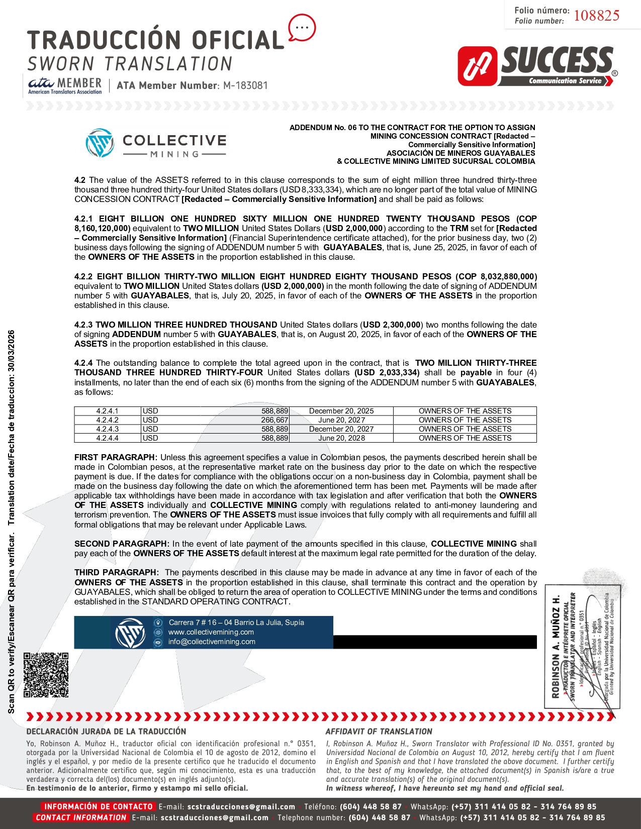 ADDENDUM No. 06 TO THE CONTRACT FOR THE OPTION TO ASSIGN MINING CONCESSION CONTRACT [Redacted – Commercially Sensitive Information] ASOCIACIÓN DE MINEROS GUAYABALES & COLLECTIVE MINING LIMITED SUCURSAL COLOMBIA 2. The value of the ASSETS referred to in this clause corresponds to the sum of eight million three hundred thirty - three thousand three hundred thirty - four United States dollars (USD 8 , 333 , 334 ), which are no longer part of the total value of MINING CONCESSION CONTRACT [Redacted – Commercially Sensitive Information] and shall be paid as follows : 1. EIGHT BILLION ONE HUNDRED SIXTY MILLION ONE HUNDRED TWENTY THOUSAND PESOS (COP 8 , 160 , 120 , 000 ) equivalent to TWO MILLION United States Dollars ( USD 2 , 000 , 000 ) according to the TRM set for [Redacted – Commercially Sensitive Information] (Financial Superintendence certificate attached), for the prior business day, two ( 2 ) business days following the signing of ADDENDUM number 5 with GUAYABALES , that is, June 25 , 2025 , in favor of each of the OWNERS OF THE ASSETS in the proportion established in this clause . 2. EIGHT BILLION THIRTY - TWO MILLION EIGHT HUNDRED EIGHTY THOUSAND PESOS (COP 8 , 032 , 880 , 000 ) equivalent to TWO MILLION United States dollars (USD 2 , 000 , 000 ) in the month following the date of signing of ADDENDUM number 5 with GUAYABALES , that is, July 20 , 2025 , in favor of each of the OWNERS OF THE ASSETS in the proportion established in this clause . 3. TWO MILLION THREE HUNDRED THOUSAND United States dollars ( USD 2 , 300 , 000 ) two months following the date of signing ADDENDUM number 5 with GUAYABALES , that is, on August 20 , 2025 , in favor of each of the OWNERS OF THE ASSETS in the proportion established in this clause . 4. The outstanding balance to complete the total agreed upon in the contract, that is TWO MILLION THIRTY - THREE THOUSAND THREE HUNDRED THIRTY - FOUR United States dollars (USD 2 , 033 , 334 ) shall be payable in four ( 4 ) installments, no later than the end of each six ( 6 ) months from the signing of the ADDENDUM number 5 with GUAYABALES , as follows : OWNERS OF THE ASSETS December 20, 2025 588,889 USD 4.2.4.1 OWNERS OF THE ASSETS June 20, 2027 266,667 USD 4.2.4.2 OWNERS OF THE ASSETS December 20, 2027 588,889 USD 4.2.4.3 OWNERS OF THE ASSETS June 20, 2028 588,889 USD 4.2.4.4 FIRST PARAGRAPH : Unless this agreement specifies a value in Colombian pesos, the payments described herein shall be made in Colombian pesos, at the representative market rate on the business day prior to the date on which the respective payment is due . If the dates for compliance with the obligations occur on a non - business day in Colombia, payment shall be made on the business day following the date on which the aforementioned term has been met . Payments will be made after applicable tax withholdings have been made in accordance with tax legislation and after verification that both the OWNERS OF THE ASSETS individually and COLLECTIVE MINING comply with regulations related to anti - money laundering and terrorism prevention . The OWNERS OF THE ASSETS must issue invoices that fully comply with all requirements and fulfill all formal obligations that may be relevant under Applicable Laws . SECOND PARAGRAPH : In the event of late payment of the amounts specified in this clause, COLLECTIVE MINING shall pay each of the OWNERS OF THE ASSETS default interest at the maximum legal rate permitted for the duration of the delay . THIRD PARAGRAPH : The payments described in this clause may be made in advance at any time in favor of each of the OWNERS OF THE ASSETS in the proportion established in this clause, shall terminate this contract and the operation by GUAYABALES, which shall be obliged to return the area of operation to COLLECTIVE MINING under the terms and conditions established in the STANDARD OPERATING CONTRACT . Carrera 7 # 16 – 04 Barrio La Julia, Supía www.collectivemining.com info@collectivemining.com 108825 Scan QR to verify/Escanear QR para verificar. Translation date/Fecha de traduccion: 30/03/2026