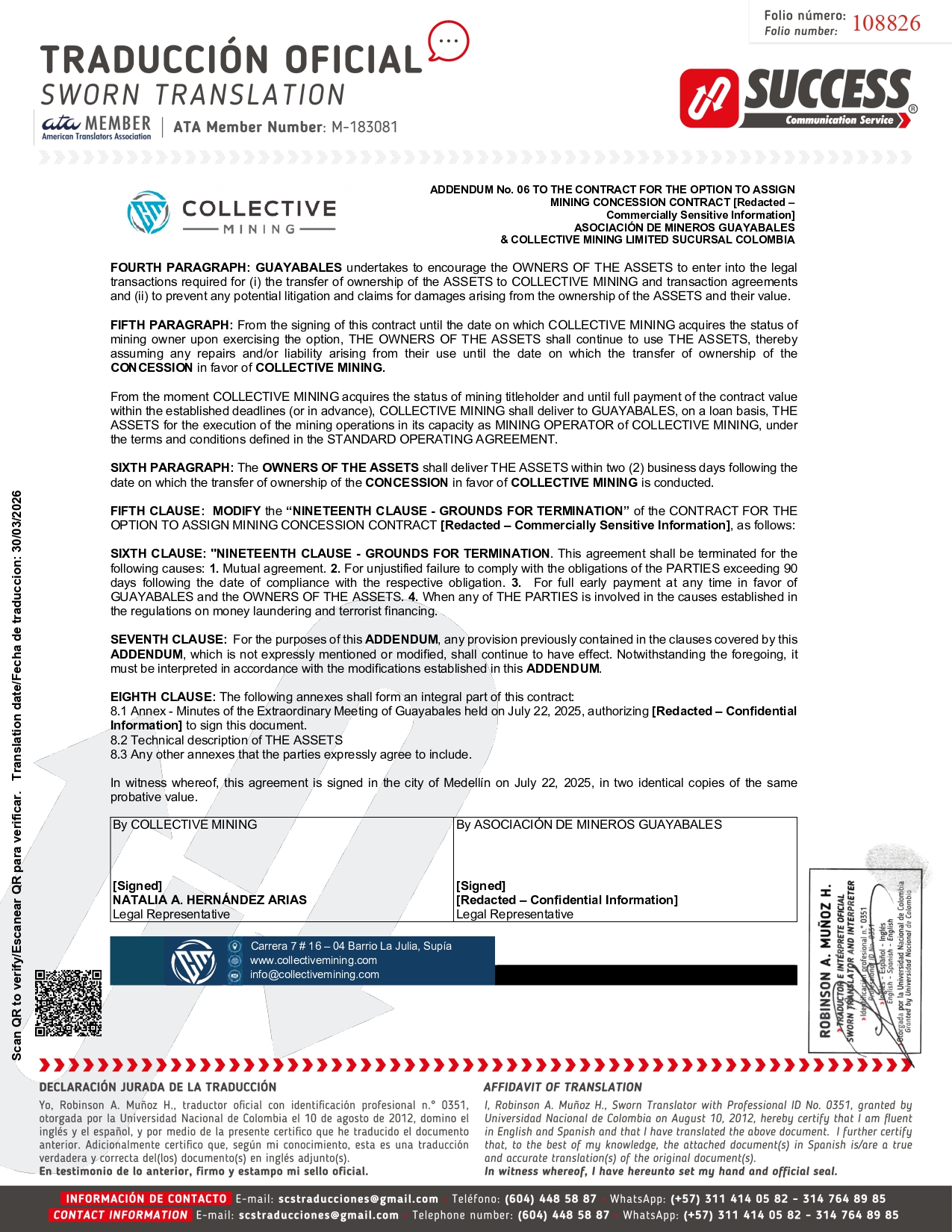 ADDENDUM No. 06 TO THE CONTRACT FOR THE OPTION TO ASSIGN MINING CONCESSION CONTRACT [Redacted – Commercially Sensitive Information] ASOCIACIÓN DE MINEROS GUAYABALES & COLLECTIVE MINING LIMITED SUCURSAL COLOMBIA FOURTH PARAGRAPH : GUAYABALES undertakes to encourage the OWNERS OF THE ASSETS to enter into the legal transactions required for (i) the transfer of ownership of the ASSETS to COLLECTIVE MINING and transaction agreements and (ii) to prevent any potential litigation and claims for damages arising from the ownership of the ASSETS and their value . FIFTH PARAGRAPH : From the signing of this contract until the date on which COLLECTIVE MINING acquires the status of mining owner upon exercising the option, THE OWNERS OF THE ASSETS shall continue to use THE ASSETS, thereby assuming any repairs and/or liability arising from their use until the date on which the transfer of ownership of the CONCESSION in favor of COLLECTIVE MINING . From the moment COLLECTIVE MINING acquires the status of mining titleholder and until full payment of the contract value within the established deadlines (or in advance), COLLECTIVE MINING shall deliver to GUAYABALES, on a loan basis, THE ASSETS for the execution of the mining operations in its capacity as MINING OPERATOR of COLLECTIVE MINING, under the terms and conditions defined in the STANDARD OPERATING AGREEMENT . SIXTH PARAGRAPH : The OWNERS OF THE ASSETS shall deliver THE ASSETS within two ( 2 ) business days following the date on which the transfer of ownership of the CONCESSION in favor of COLLECTIVE MINING is conducted . FIFTH CLAUSE: MODIFY the “NINETEENTH CLAUSE - GROUNDS FOR TERMINATION” of the CONTRACT FOR THE OPTION TO ASSIGN MINING CONCESSION CONTRACT [Redacted – Commercially Sensitive Information] , as follows : SIXTH CLAUSE : "NINETEENTH CLAUSE - GROUNDS FOR TERMINATION . This agreement shall be terminated for the following causes : 1 . Mutual agreement . 2 . For unjustified failure to comply with the obligations of the PARTIES exceeding 90 days following the date of compliance with the respective obligation . 3 . For full early payment at any time in favor of GUAYABALES and the OWNERS OF THE ASSETS . 4 . When any of THE PARTIES is involved in the causes established in the regulations on money laundering and terrorist financing . SEVENTH CLAUSE : For the purposes of this ADDENDUM , any provision previously contained in the clauses covered by this ADDENDUM , which is not expressly mentioned or modified, shall continue to have effect . Notwithstanding the foregoing, it must be interpreted in accordance with the modifications established in this ADDENDUM . EIGHTH CLAUSE: The following annexes shall form an integral part of this contract: 1. Annex - Minutes of the Extraordinary Meeting of Guayabales held on July 22, 2025, authorizing [Redacted – Confidential Information] to sign this document. 2. Technical description of THE ASSETS 3. Any other annexes that the parties expressly agree to include. In witness whereof, this agreement is signed in the city of Medellín on July 22, 2025, in two identical copies of the same probative value. By ASOCIACIÓN DE MINEROS GUAYABALES By COLLECTIVE MINING [Signed] [Redacted – Confidential Information] Legal Representative [Signed] NATALIA A. HERNÁNDEZ ARIAS Legal Representative Carrera 7 # 16 – 04 Barrio La Julia, Supía www.collectivemining.com info@collectivemining.com 108826 Scan QR to verify/Escanear QR para verificar. Translation date/Fecha de traduccion: 30/03/2026