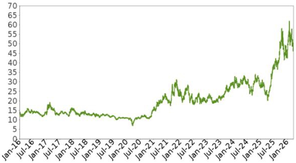 The following graph shows the daily historical performance of the Underlying Fund on its primary exchange in the period from January 1, 2016 through March 25, 2026. We obtained this historical data from Bloomberg L.P. We have not independently verified the accuracy or completeness of the information obtained from Bloomberg L.P. On March 25, 2026, the Closing Market Price of the Underlying Fund was $48.95. The graph below may have been adjusted to reflect certain corporate actions, such as stock splits and reverse stock splits.
