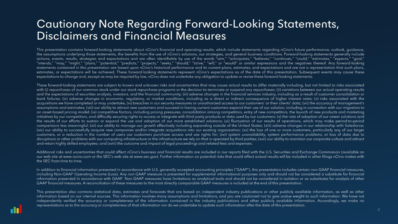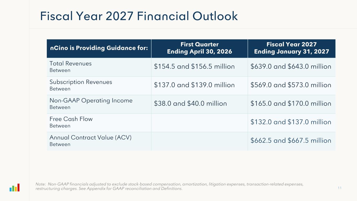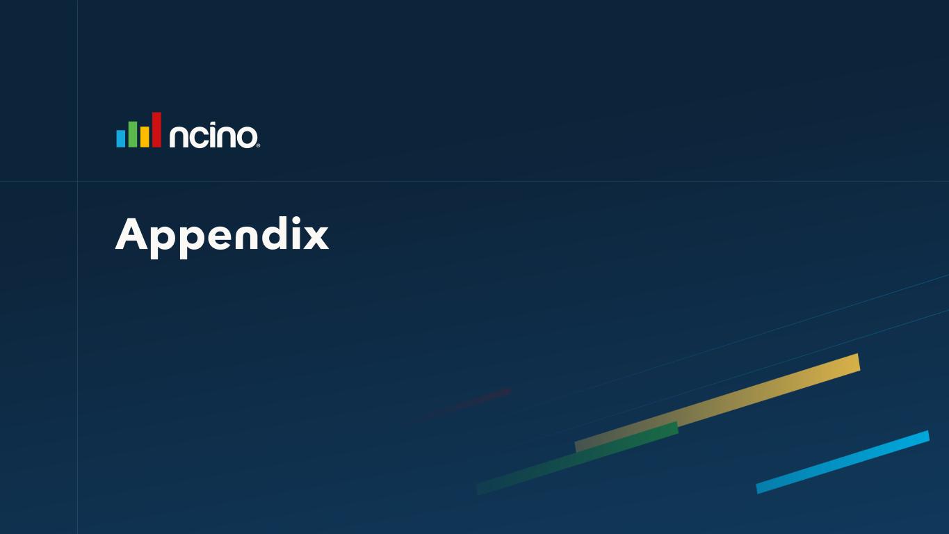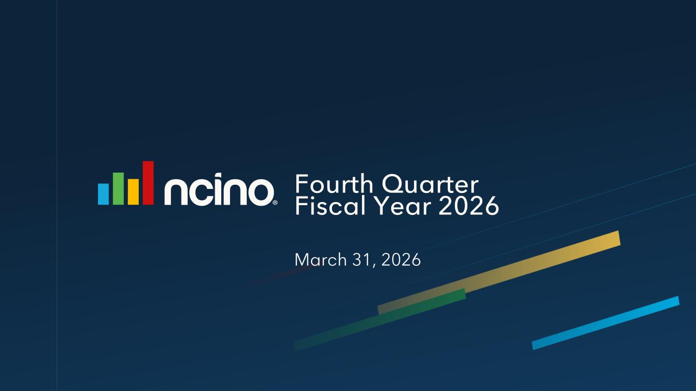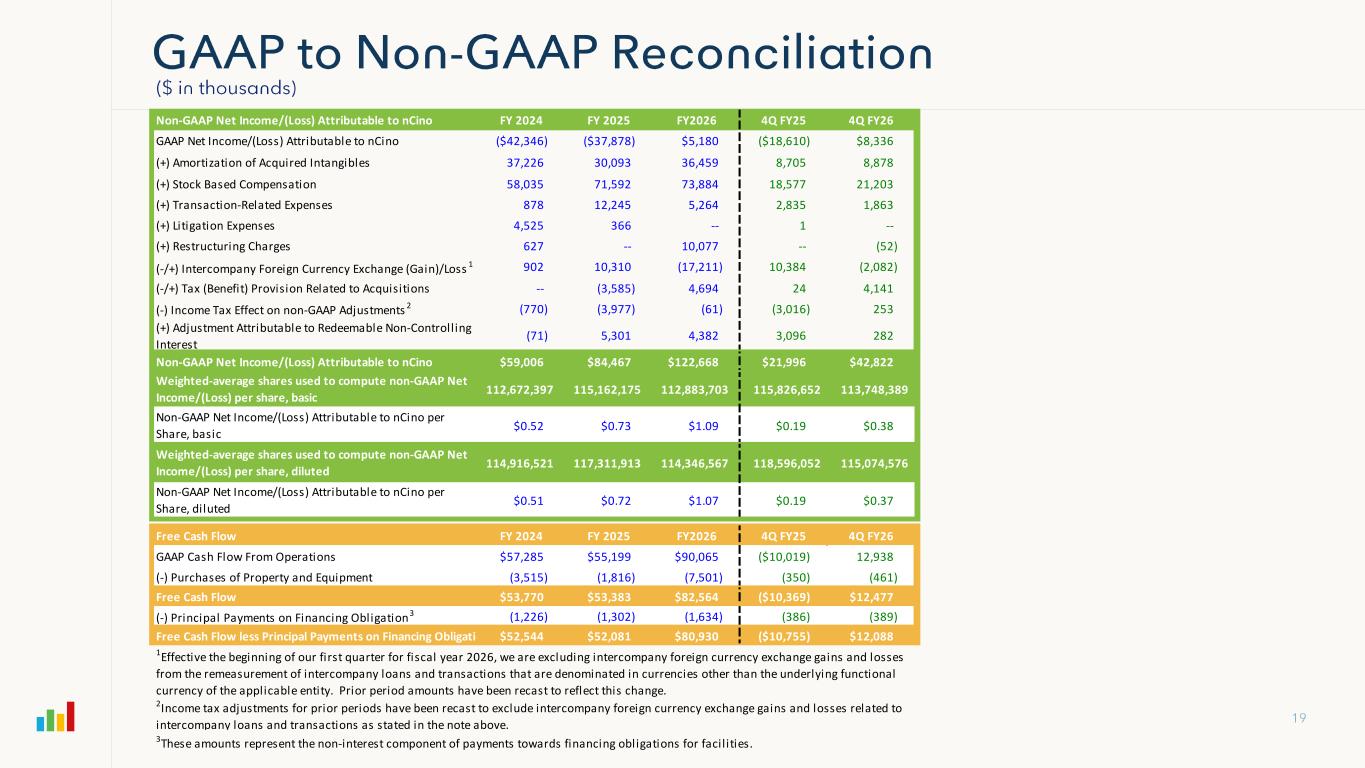 Non-GAAP Net Income/(Loss) Attributable to nCino FY 2024 FY 2025 FY2026 4Q FY25 4Q FY26 GAAP Net Income/(Loss) Attributable to nCino ($42,346) ($37,878) $5,180 ($18,610) $8,336 (+) Amortization of Acquired Intangibles 37,226 30,093 36,459 8,705 8,878 (+) Stock Based Compensation 58,035 71,592 73,884 18,577 21,203 (+) Transaction-Related Expenses 878 12,245 5,264 2,835 1,863 (+) Litigation Expenses 4,525 366 -- 1 -- (+) Restructuring Charges 627 -- 10,077 -- (52) (-/+) Intercompany Foreign Currency Exchange (Gain)/Loss 1 902 10,310 (17,211) 10,384 (2,082) (-/+) Tax (Benefit) Provision Related to Acquisitions -- (3,585) 4,694 24 4,141 (-) Income Tax Effect on non-GAAP Adjustments 2 (770) (3,977) (61) (3,016) 253 (+) Adjustment Attributable to Redeemable Non-Controlling Interest (71) 5,301 4,382 3,096 282 Non-GAAP Net Income/(Loss) Attributable to nCino $59,006 $84,467 $122,668 $21,996 $42,822 112,672,397 115,162,175 112,883,703 115,826,652 113,748,389 Non-GAAP Net Income/(Loss) Attributable to nCino per Share, basic $0.52 $0.73 $1.09 $0.19 $0.38 114,916,521 117,311,913 114,346,567 118,596,052 115,074,576 Non-GAAP Net Income/(Loss) Attributable to nCino per Share, diluted $0.51 $0.72 $1.07 $0.19 $0.37 Free Cash Flow FY 2024 FY 2025 FY2026 4Q FY25 4Q FY26 GAAP Cash Flow From Operations $57,285 $55,199 $90,065 ($10,019) 12,938 (-) Purchases of Property and Equipment (3,515) (1,816) (7,501) (350) (461) Free Cash Flow $53,770 $53,383 $82,564 ($10,369) $12,477 (-) Principal Payments on Financing Obligation3 (1,226) (1,302) (1,634) (386) (389) Free Cash Flow less Principal Payments on Financing Obligations $52,544 $52,081 $80,930 ($10,755) $12,088 3These amounts represent the non-interest component of payments towards financing obligations for facil ities. Weighted-average shares used to compute non-GAAP Net Income/(Loss) per share, basic Weighted-average shares used to compute non-GAAP Net Income/(Loss) per share, diluted 1Effective the beginning of our first quarter for fiscal year 2026, we are excluding intercompany foreign currency exchange gains and losses from the remeasurement of intercompany loans and transactions that are denominated in currencies other than the underlying functional currency of the applicable entity. Prior period amounts have been recast to reflect this change. 2Income tax adjustments for prior periods have been recast to exclude intercompany foreign currency exchange gains and losses related to intercompany loans and transactions as stated in the note above.