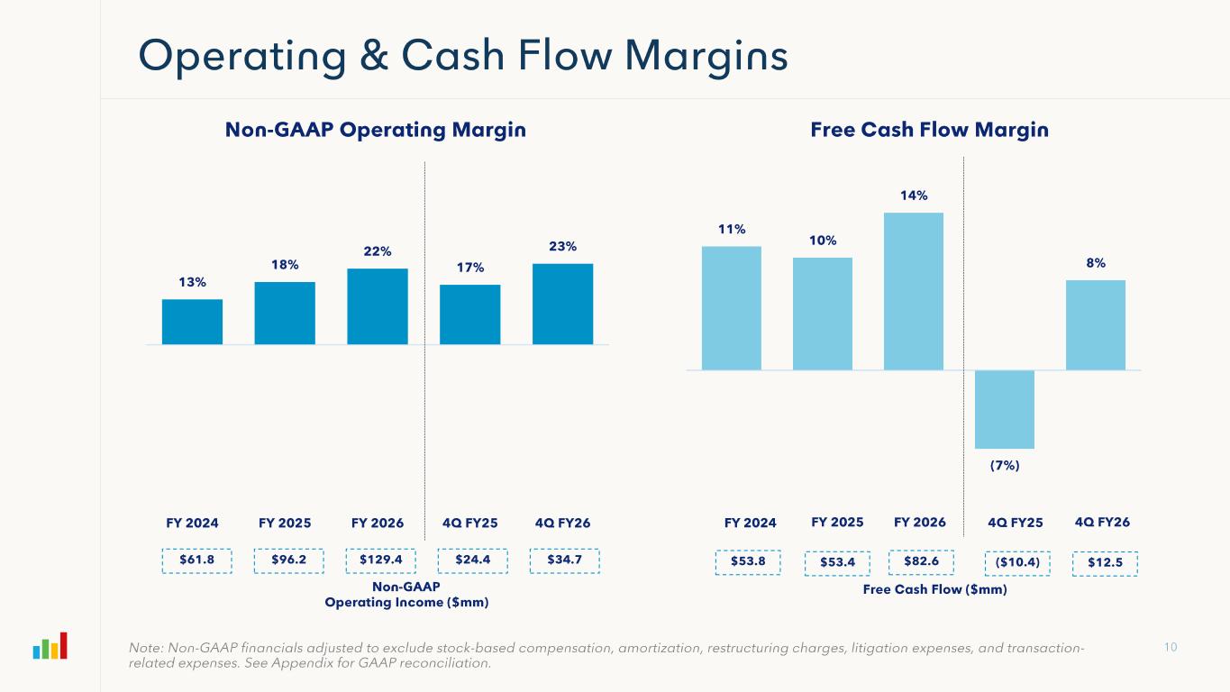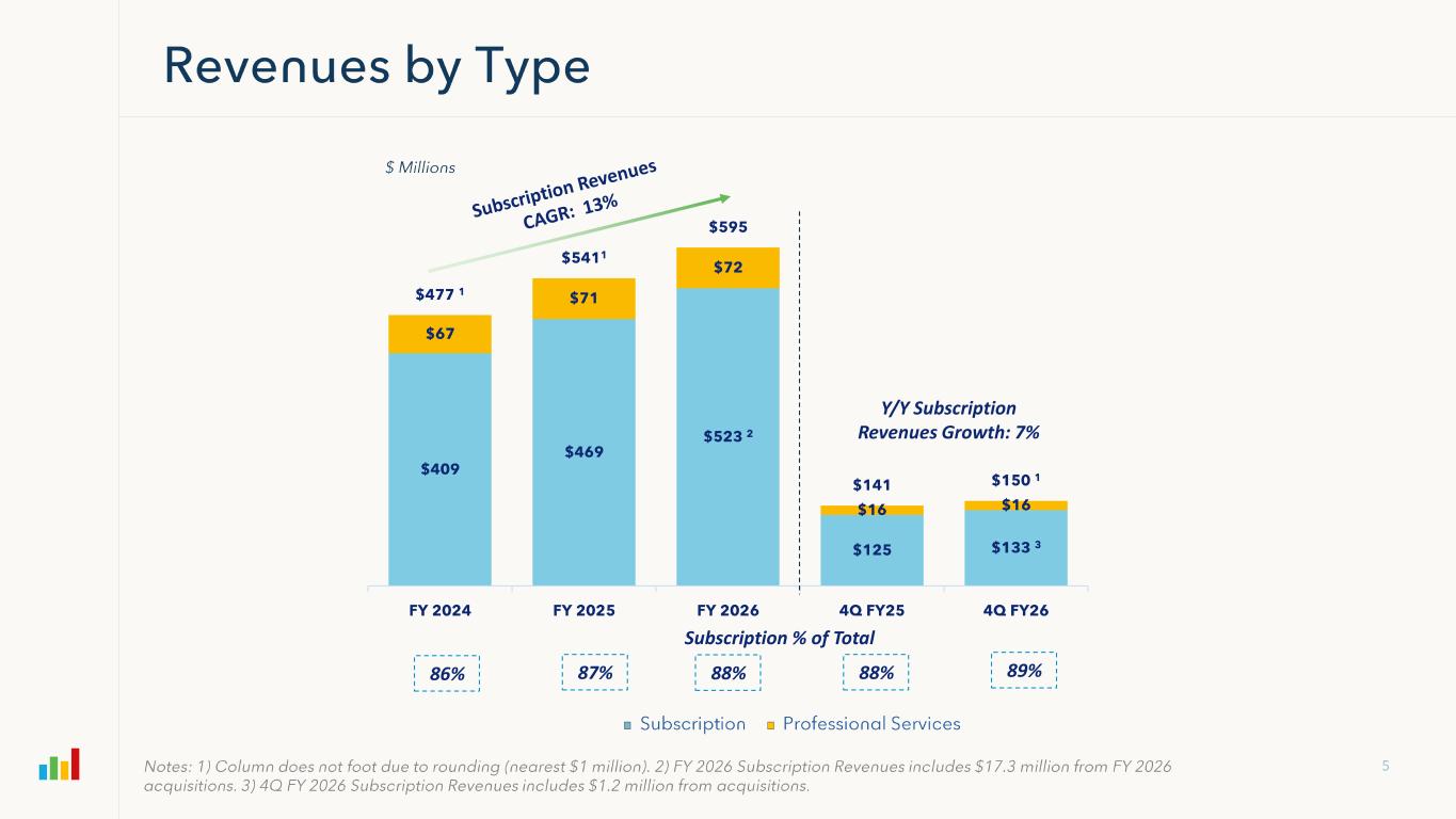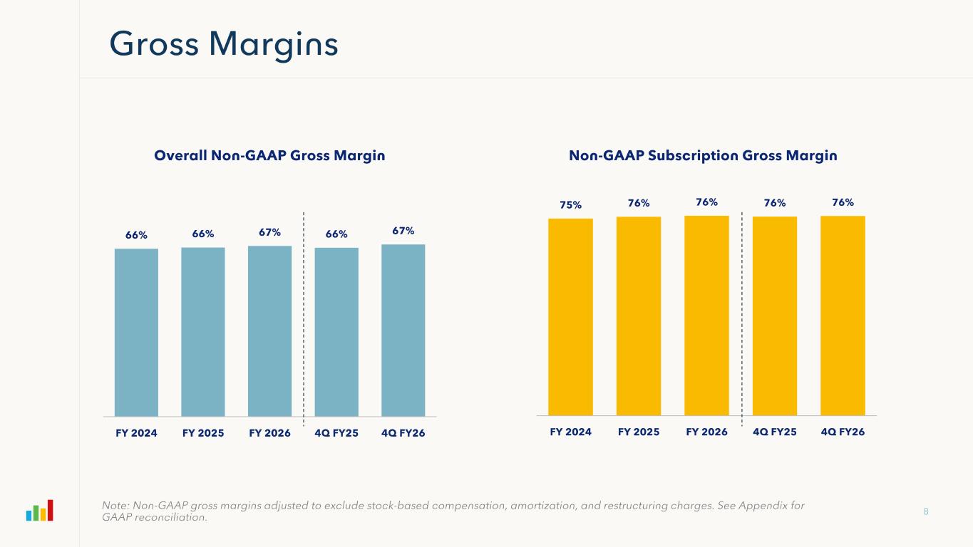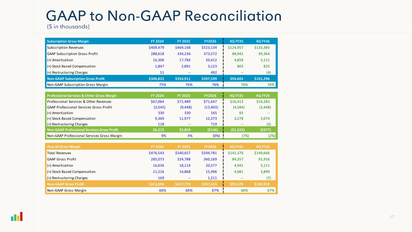 Subscription Gross Margin FY 2024 FY 2025 FY2026 4Q FY25 4Q FY26 Subscription Revenues $409,479 $469,168 $523,134 $124,957 $133,383 GAAP Subscription Gross Profit 288,618 334,236 373,572 88,941 95,364 (+) Amortization 16,306 17,784 20,412 4,858 5,111 (+) Stock Based Compensation 1,847 2,891 3,123 803 825 (+) Restructuring Charges 51 -- 492 -- (4) Non-GAAP Subscription Gross Profit $306,822 $354,911 $397,599 $94,602 $101,296 Non-GAAP Subscription Gross Margin 75% 76% 76% 76% 76% Professional Services & Other Gross Margin FY 2024 FY 2025 FY2026 4Q FY25 4Q FY26 Professional Services & Other Revenues $67,064 $71,489 $71,647 $16,413 $16,283 GAAP Professional Services Gross Profit (3,545) (9,448) (13,403) (4,584) (3,448) (+) Amortization 330 330 165 83 -- (+) Stock Based Compensation 9,369 11,977 12,373 3,278 3,074 (+) Restructuring Charges 118 -- 719 -- (3) Non-GAAP Professional Services Gross Profit $6,272 $2,859 ($146) ($1,223) ($377) Non-GAAP Professional Services Gross Margin 9% 4% (0%) (7%) (2%) Overall Gross Margin FY 2024 FY 2025 FY2026 4Q FY25 4Q FY26 Total Revenues $476,543 $540,657 $594,781 $141,370 $149,666 GAAP Gross Profit 285,073 324,788 360,169 84,357 91,916 (+) Amortization 16,636 18,114 20,577 4,941 5,111 (+) Stock Based Compensation 11,216 14,868 15,496 4,081 3,899 (+) Restructuring Charges 169 -- 1,211 -- (7) Non-GAAP Gross Profit $313,094 $357,770 $397,453 $93,379 $100,919 Non-GAAP Gross Margin 66% 66% 67% 66% 67%