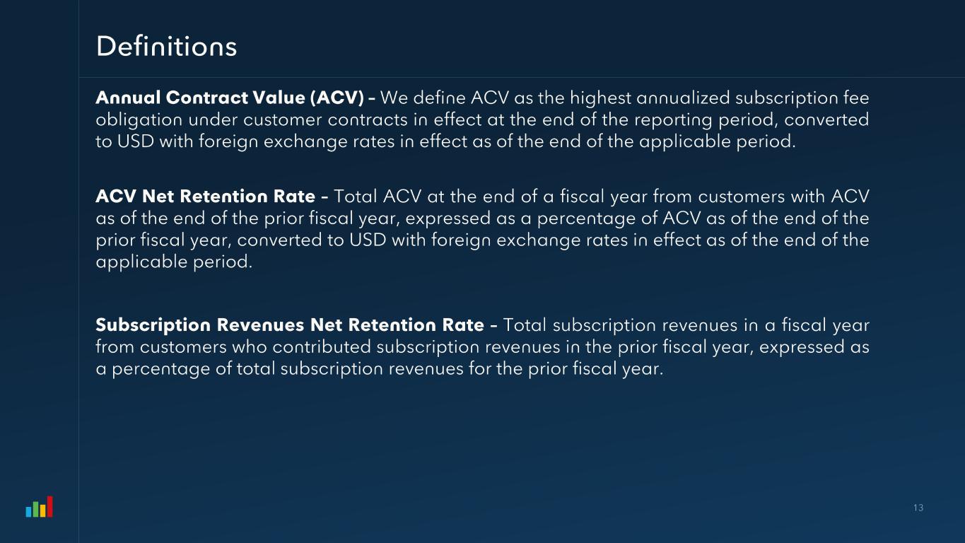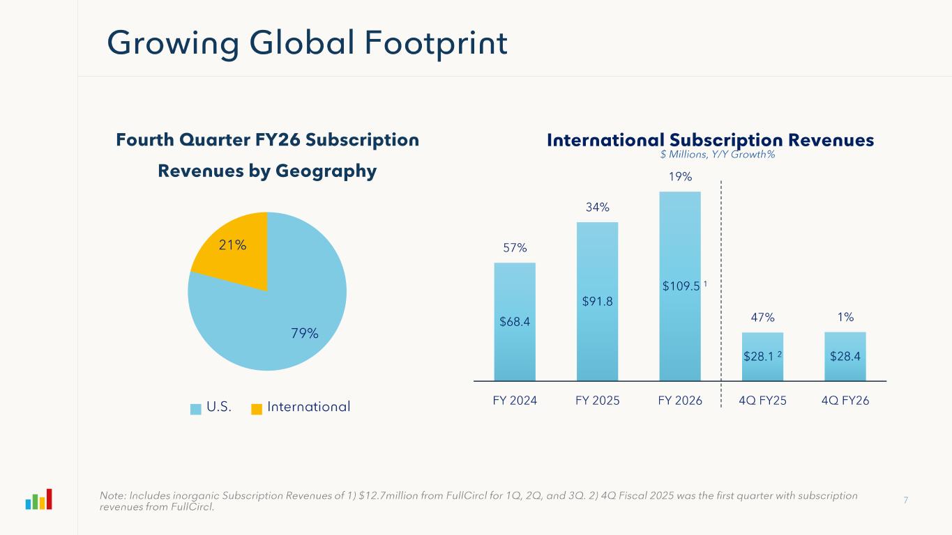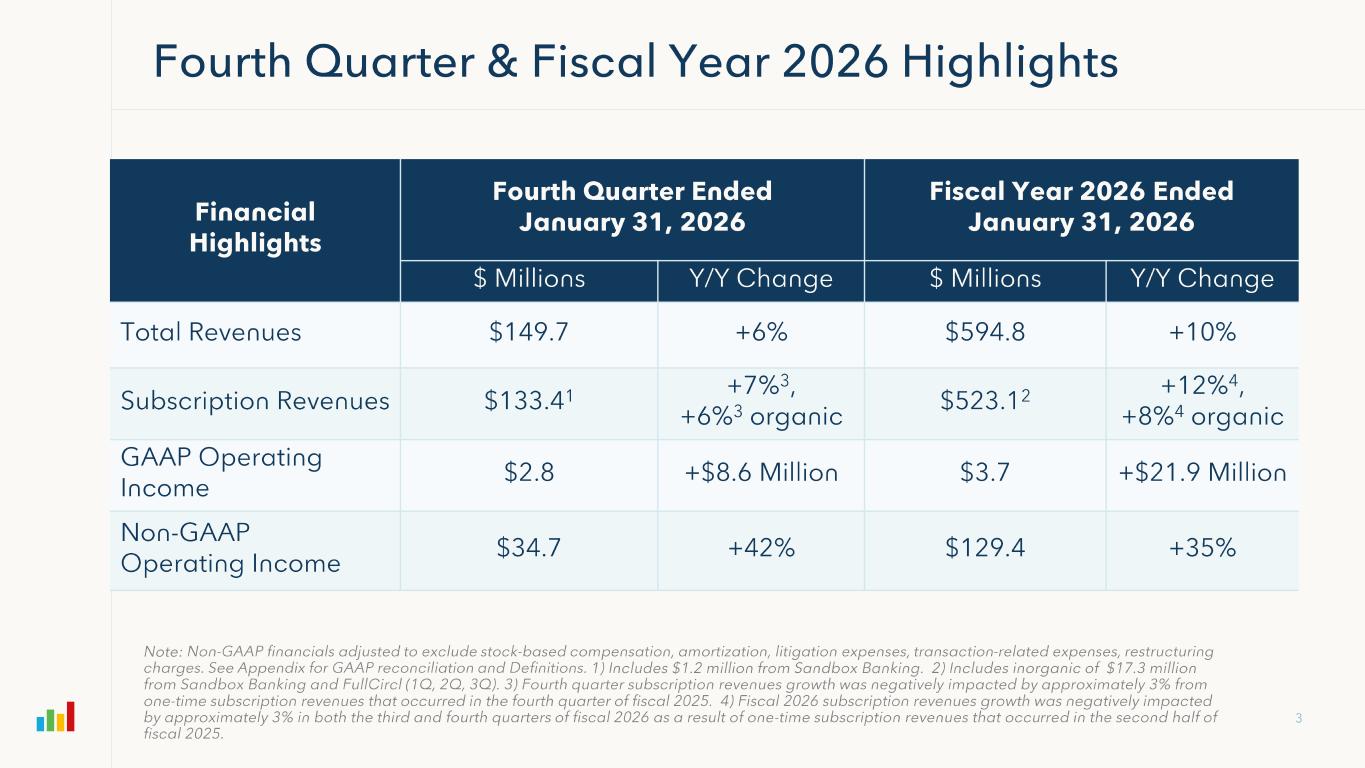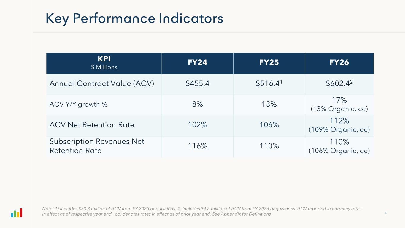 Subscription Gross Margin FY 2024 FY 2025 FY2026 4Q FY25 4Q FY26 Subscription Revenues $409,479 $469,168 $523,134 $124,957 $133,383 GAAP Subscription Gross Profit 288,618 334,236 373,572 88,941 95,364 (+) Amortization 16,306 17,784 20,412 4,858 5,111 (+) Stock Based Compensation 1,847 2,891 3,123 803 825 (+) Restructuring Charges 51 -- 492 -- (4) Non-GAAP Subscription Gross Profit $306,822 $354,911 $397,599 $94,602 $101,296 Non-GAAP Subscription Gross Margin 75% 76% 76% 76% 76% Professional Services & Other Gross Margin FY 2024 FY 2025 FY2026 4Q FY25 4Q FY26 Professional Services & Other Revenues $67,064 $71,489 $71,647 $16,413 $16,283 GAAP Professional Services Gross Profit (3,545) (9,448) (13,403) (4,584) (3,448) (+) Amortization 330 330 165 83 -- (+) Stock Based Compensation 9,369 11,977 12,373 3,278 3,074 (+) Restructuring Charges 118 -- 719 -- (3) Non-GAAP Professional Services Gross Profit $6,272 $2,859 ($146) ($1,223) ($377) Non-GAAP Professional Services Gross Margin 9% 4% (0%) (7%) (2%) Overall Gross Margin FY 2024 FY 2025 FY2026 4Q FY25 4Q FY26 Total Revenues $476,543 $540,657 $594,781 $141,370 $149,666 GAAP Gross Profit 285,073 324,788 360,169 84,357 91,916 (+) Amortization 16,636 18,114 20,577 4,941 5,111 (+) Stock Based Compensation 11,216 14,868 15,496 4,081 3,899 (+) Restructuring Charges 169 -- 1,211 -- (7) Non-GAAP Gross Profit $313,094 $357,770 $397,453 $93,379 $100,919 Non-GAAP Gross Margin 66% 66% 67% 66% 67%
