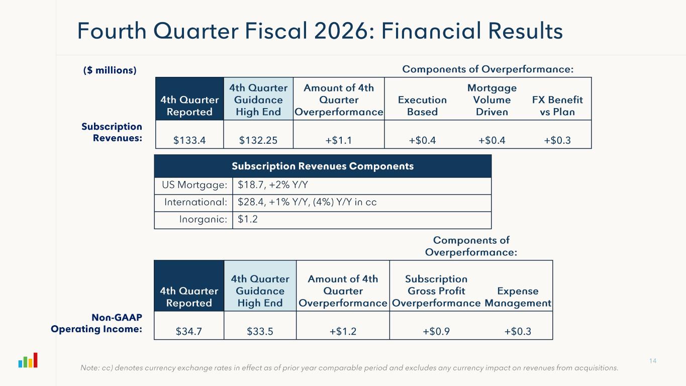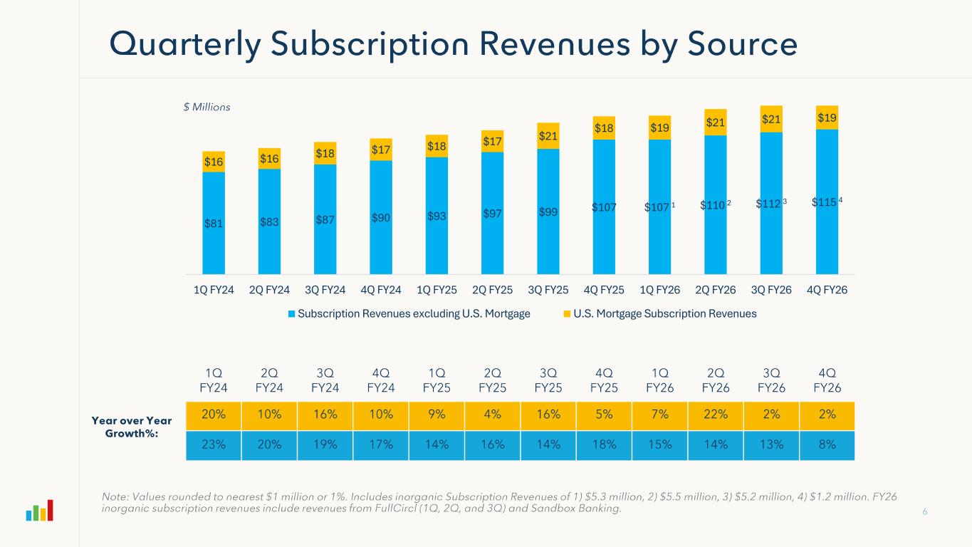 $81 $83 $87 $90 $93 $97 $99 $107 $107 1 $110 2 $112 3 $115 4 $16 $16 $18 $17 $18 $17 $21 $18 $19 $21 $21 $19 1Q FY24 2Q FY24 3Q FY24 4Q FY24 1Q FY25 2Q FY25 3Q FY25 4Q FY25 1Q FY26 2Q FY26 3Q FY26 4Q FY26 Subscription Revenues excluding U.S. Mortgage U.S. Mortgage Subscription Revenues