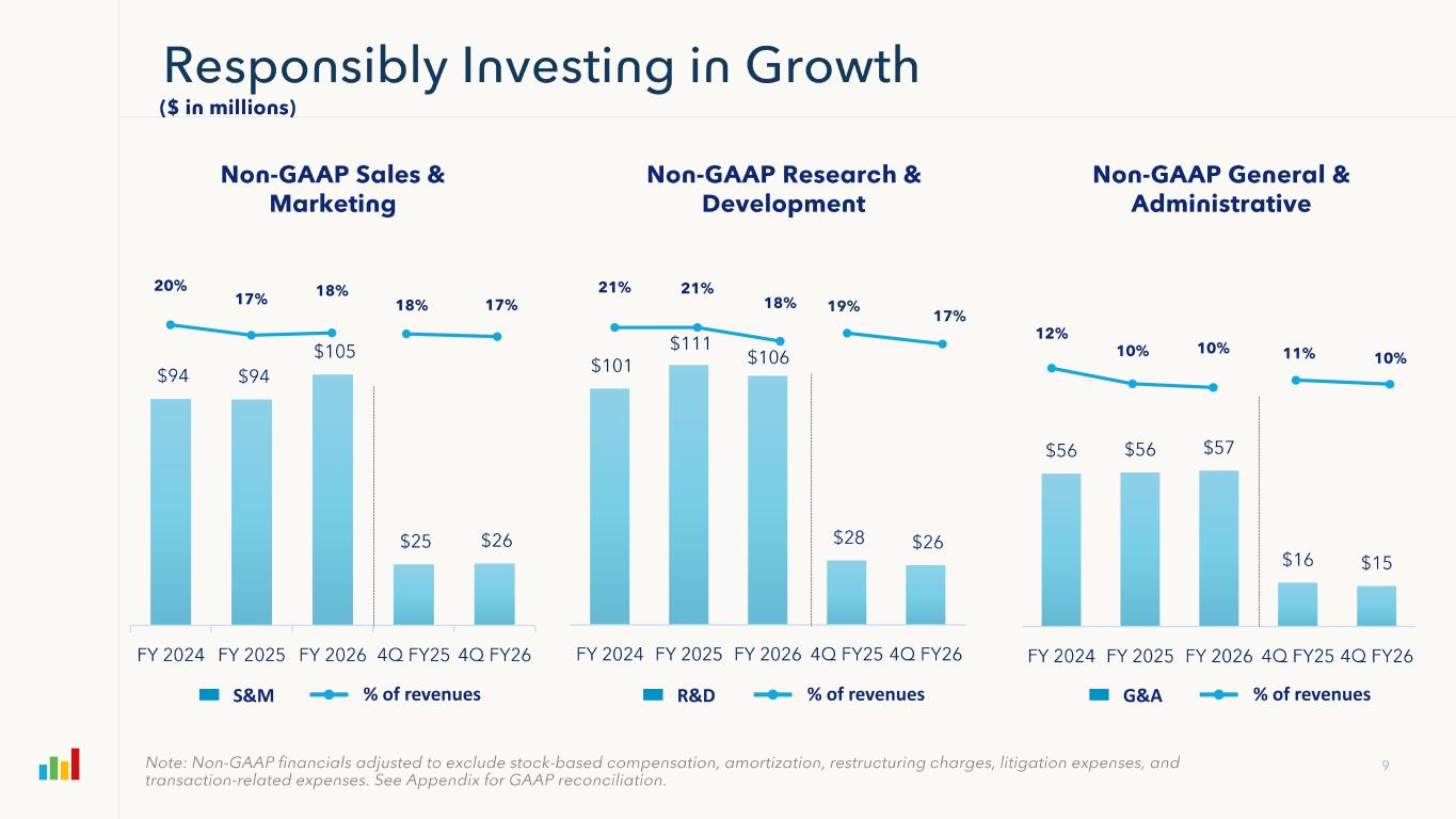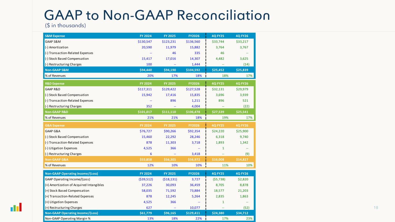 S&M Expense FY 2024 FY 2025 FY2026 4Q FY25 4Q FY26 GAAP S&M $130,547 $123,231 $136,560 $33,744 $33,217 (-) Amortization 20,590 11,979 15,882 3,764 3,767 (-) Transaction-Related Expenses -- 46 335 46 -- (-) Stock Based Compensation 15,417 17,016 14,307 4,482 3,625 (-) Restructuring Charges 100 -- 1,444 -- (14) Non-GAAP S&M $94,440 $94,190 $104,592 $25,452 $25,839 % of Revenues 20% 17% 18% 18% 17% R&D Expense FY 2024 FY 2025 FY2026 4Q FY25 4Q FY26 GAAP R&D $117,311 $129,422 $127,528 $32,131 $29,979 (-) Stock Based Compensation 15,942 17,416 15,835 3,696 3,939 (-) Transaction-Related Expenses -- 896 1,211 896 521 (-) Restructuring Charges 352 -- 4,004 -- (22) Non-GAAP R&D $101,017 $111,110 $106,478 $27,539 $25,541 % of Revenues 21% 21% 18% 19% 17% G&A Expense FY 2024 FY 2025 FY2026 4Q FY25 4Q FY26 GAAP G&A $76,727 $90,266 $92,354 $24,220 $25,900 (-) Stock Based Compensation 15,460 22,292 28,246 6,318 9,740 (-) Transaction-Related Expenses 878 11,303 3,718 1,893 1,342 (-) Litigation Expenses 4,525 366 -- 1 -- (-) Restructuring Charges 6 -- 3,418 -- (9) Non-GAAP G&A $55,858 $56,305 $56,972 $16,008 $14,827 % of Revenues 12% 10% 10% 11% 10% Non-GAAP Operating Income/(Loss) FY 2024 FY 2025 FY2026 4Q FY25 4Q FY26 GAAP Operating Income/(Loss) ($39,512) ($18,131) 3,727 ($5,738) $2,820 (+) Amortization of Acquired Intangibles 37,226 30,093 36,459 8,705 8,878 (+) Stock Based Compensation 58,035 71,592 73,884 18,577 21,203 (+) Transaction-Related Expenses 878 12,245 5,264 2,835 1,863 (+) Litigation Expenses 4,525 366 -- 1 -- (+) Restructuring Charges 627 -- 10,077 -- (52) Non-GAAP Operating Income/(Loss) $61,779 $96,165 $129,411 $24,380 $34,712 Non-GAAP Operating Margin % 13% 18% 22% 17% 23%